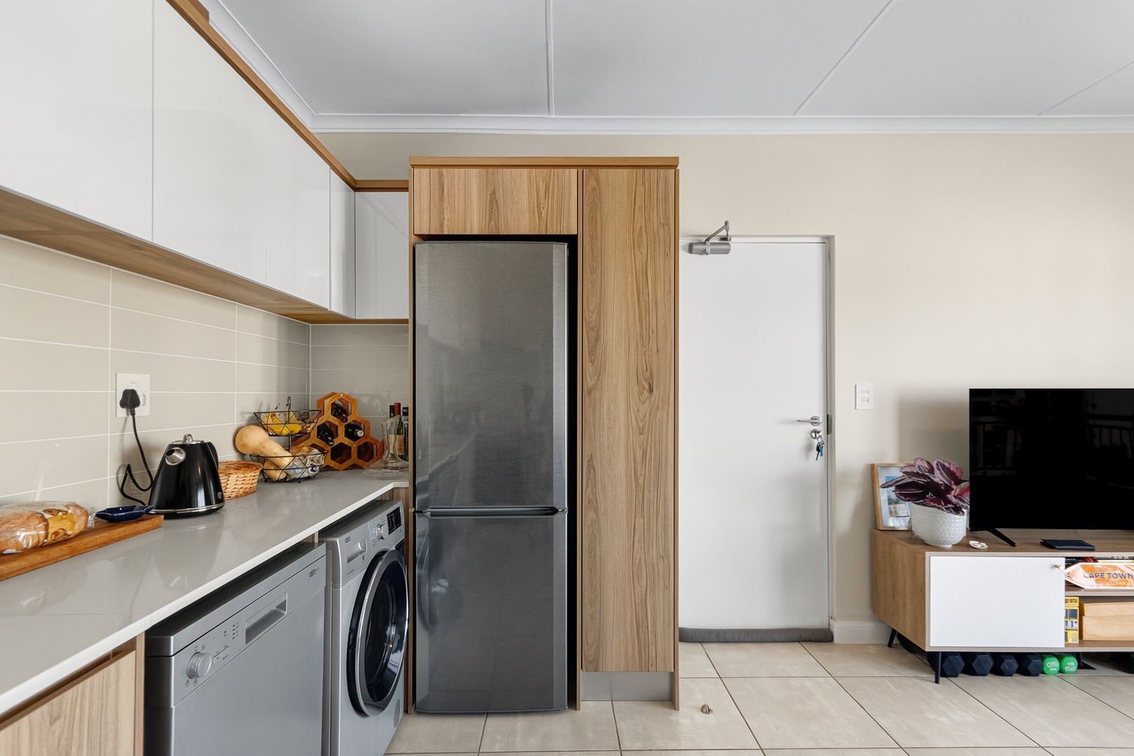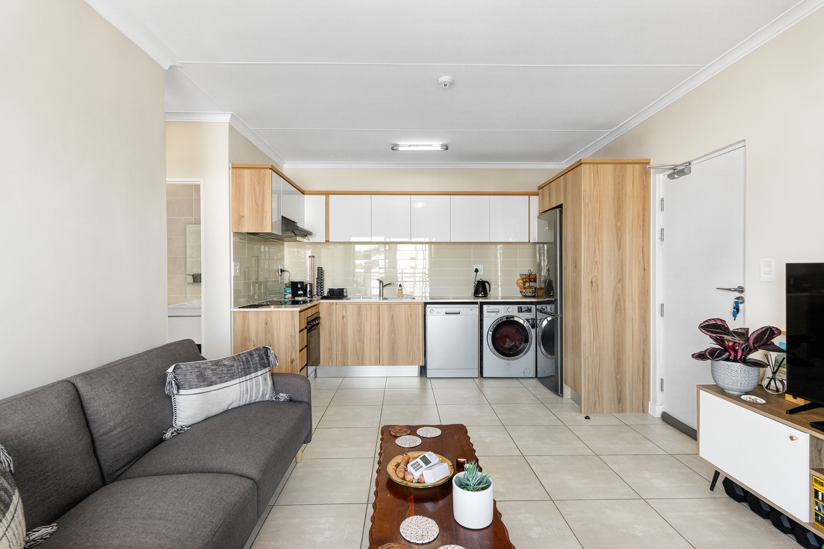 - Modern Kitchen: Elegant design with Caesarstone countertops, high-quality cabinetry, and ample storage. Includes fridge, dishwasher, and washer/dryer combo, plus an electric oven, hob, and extractor fan.