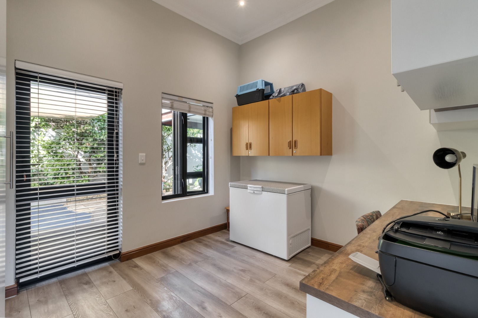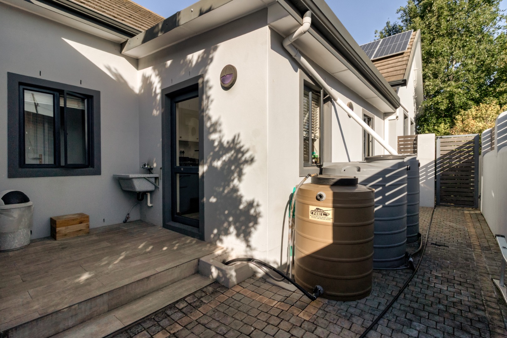 The double garage has direct access to the main house and contains the 5kw inverter running from 19 solar panels and 14kw lithium batteries.