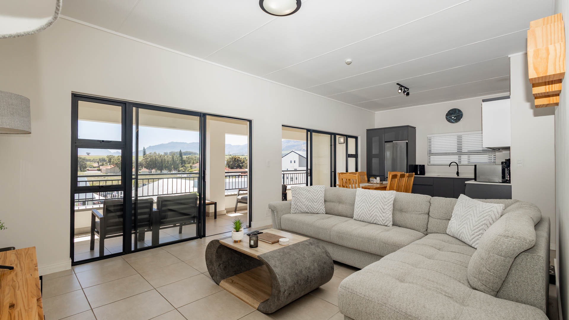 This north-facing two-bedroom, two-bathroom penthouse apartment in The Huntsman offers an exceptional sense of space and comfort, spanning 106 square meters. With beautiful views of the Helderberg Mountain, the apartment feels more like a modern home than a typical apartment. Natural light fills the open-plan living area, which connects seamlessly to a spacious covered balcony, creating the perfect flow for relaxation or entertaining.