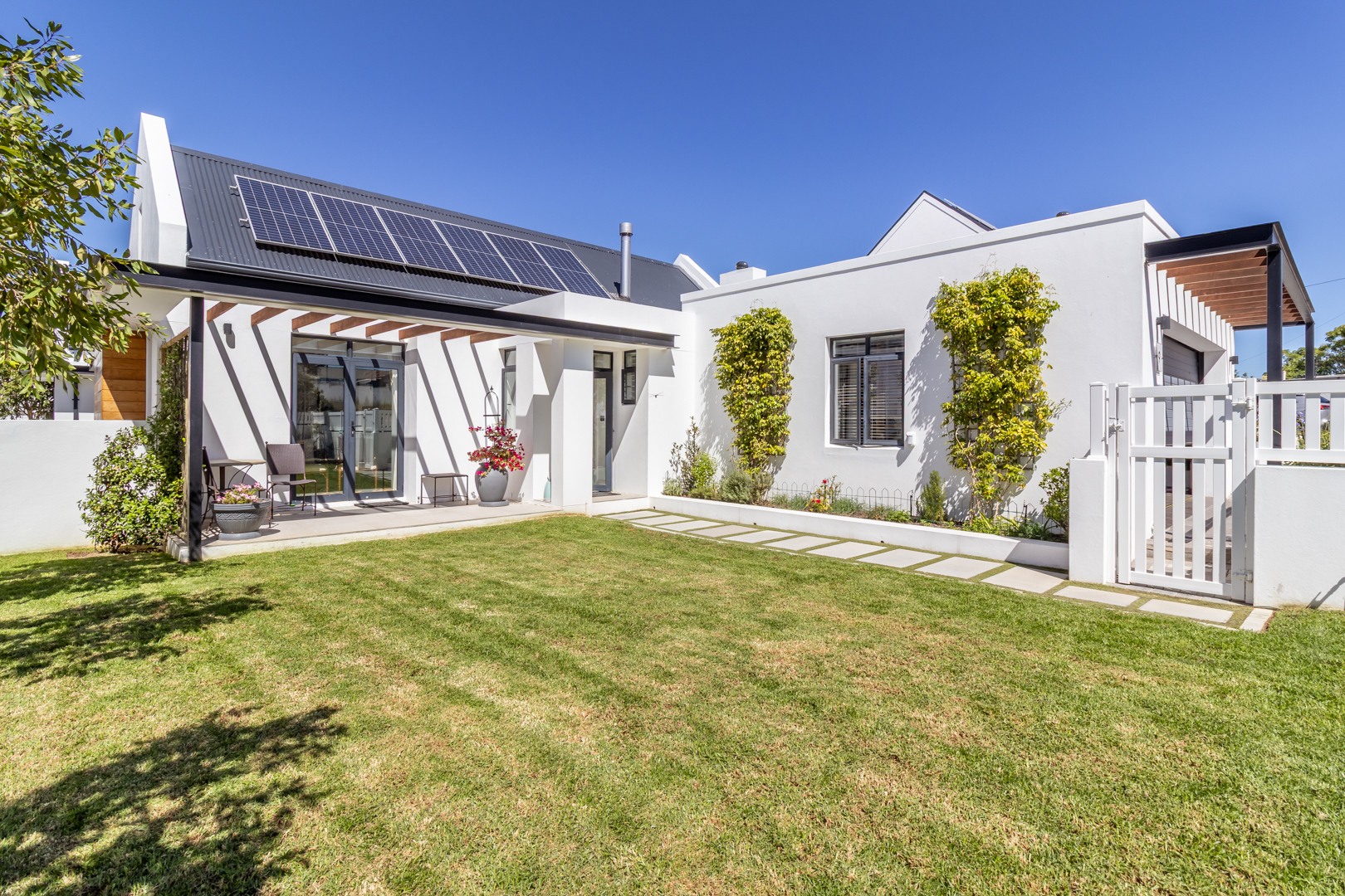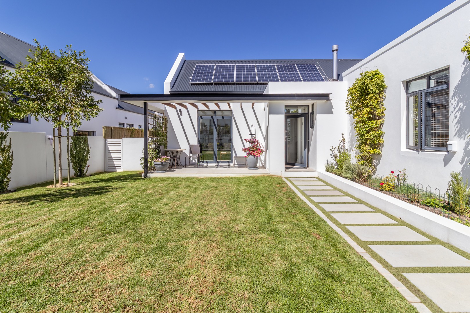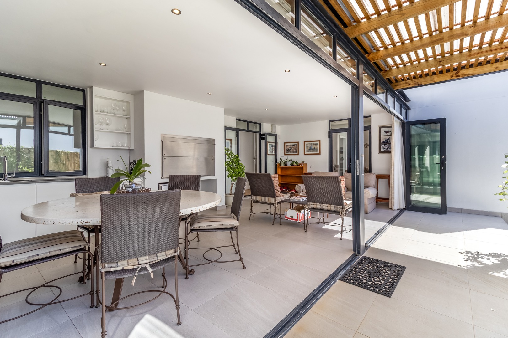 Winelands Village Estate in Raithby is a sought after security estate that offers residents the enjoyment of a rural lifestyle in scenic surroundings. This exquisite North East facing property features exclusive, modern finishes and is perfectly positioned in a quiet cul de sac. A rare gem, it represents the pinnacle of superior design and convenience, where every detail has been thoughtfully planned. This home offers a seamless flow from the entertainment areas to an expansive indoor patio, ideal for relaxed gatherings. Complete with a gas braai and stackable doors, this space creates a delightful indoor-outdoor feel.