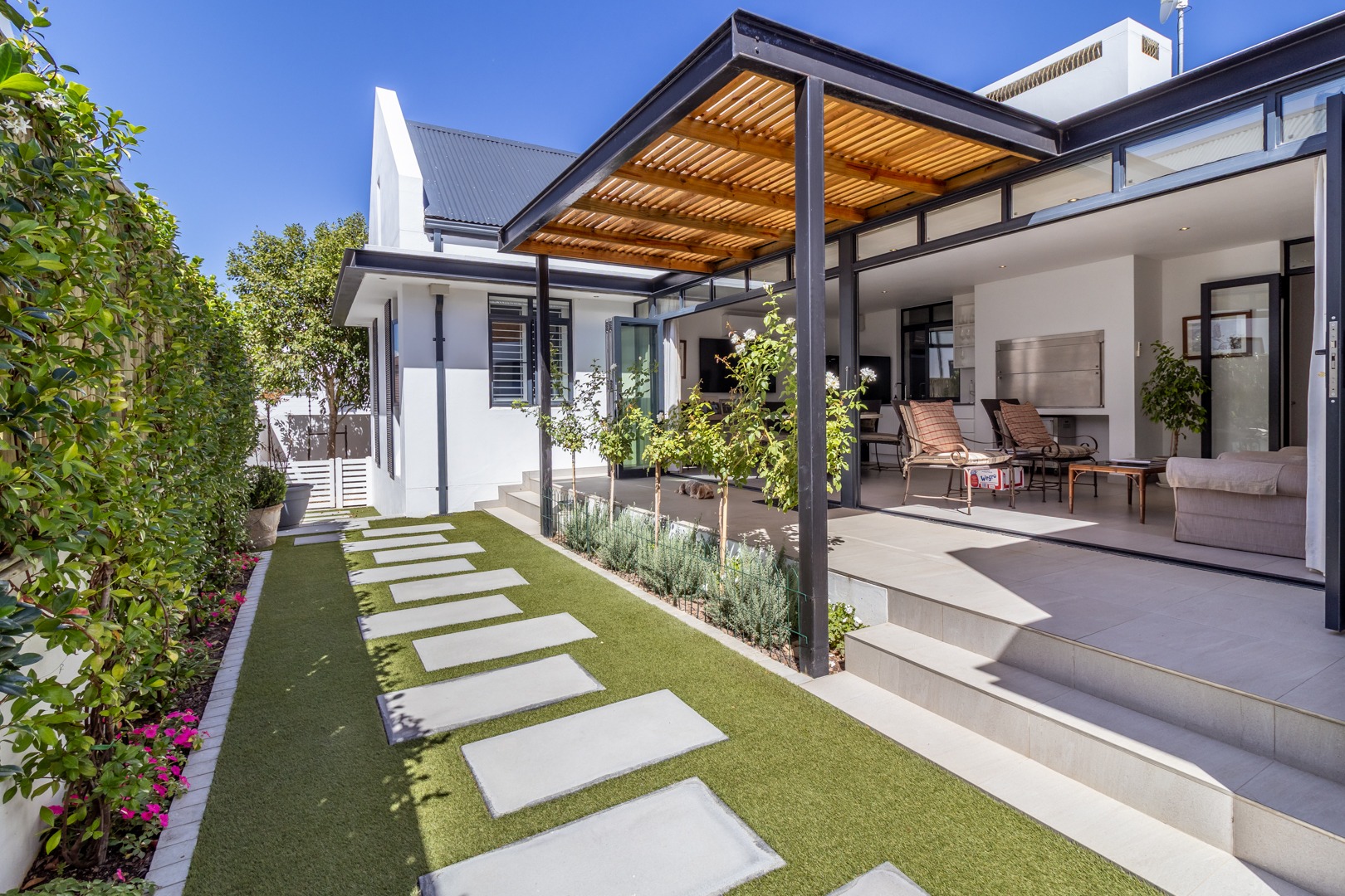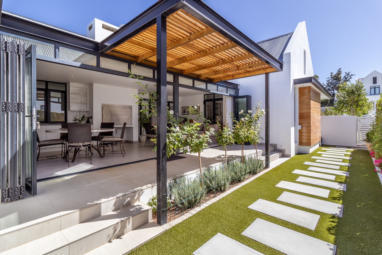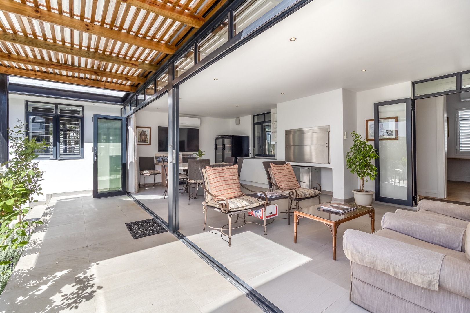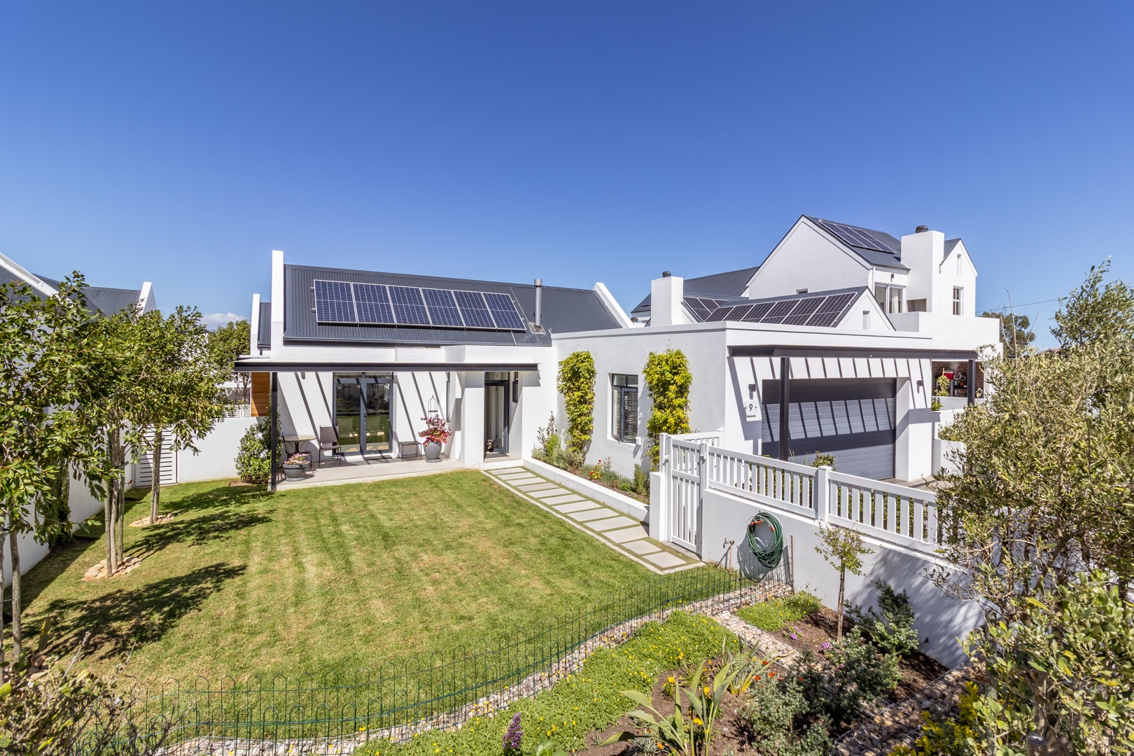 Winelands Village Estate in Raithby is a sought after security estate that offers residents the enjoyment of a rural lifestyle in scenic surroundings. This exquisite North East facing property features exclusive, modern finishes and is perfectly positioned in a quiet cul de sac. A rare gem, it represents the pinnacle of superior design and convenience, where every detail has been thoughtfully planned. This home offers a seamless flow from the entertainment areas to an expansive indoor patio, ideal for relaxed gatherings. Complete with a gas braai and stackable doors, this space creates a delightful indoor-outdoor feel.