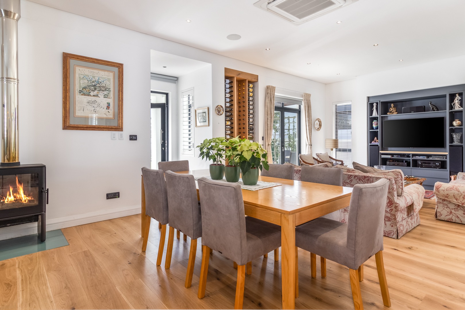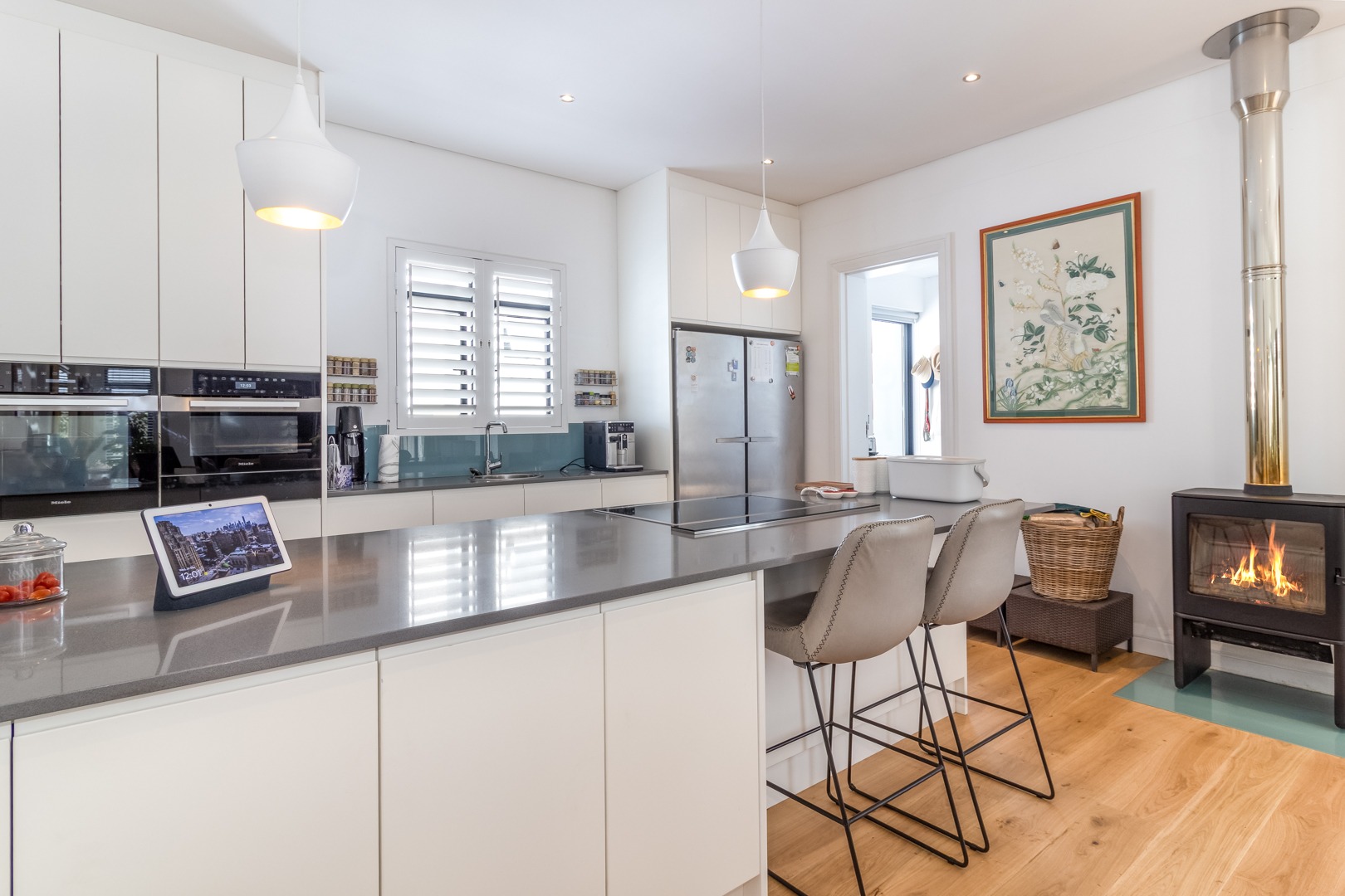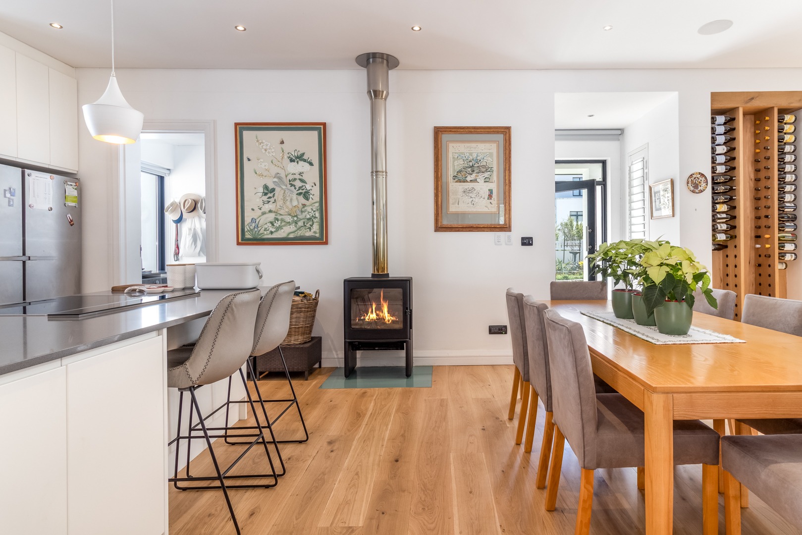 The open plan lounge and dining room areas are warm and inviting, featuring hardwood flooring throughout and a slow combustion fireplace, ensuring comfort in all seasons. The kitchen is expertly appointed with a sleek contemporary design, complemented by elegant Caesarstone countertops, Miele appliances and separate scullery.