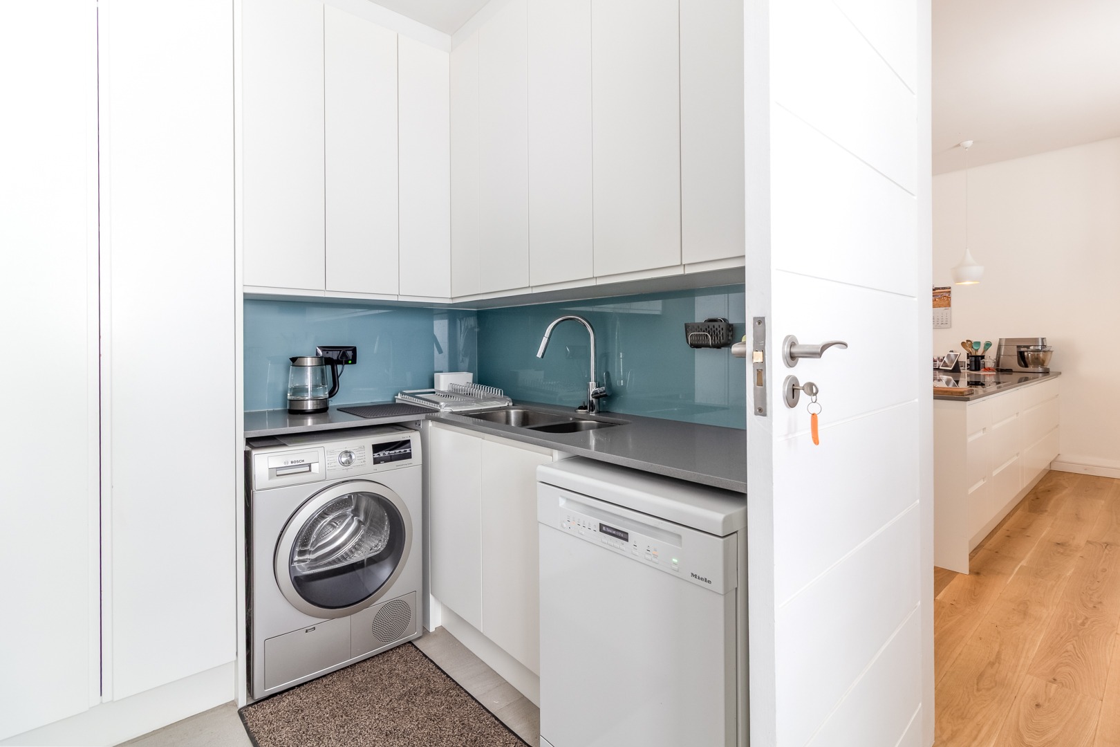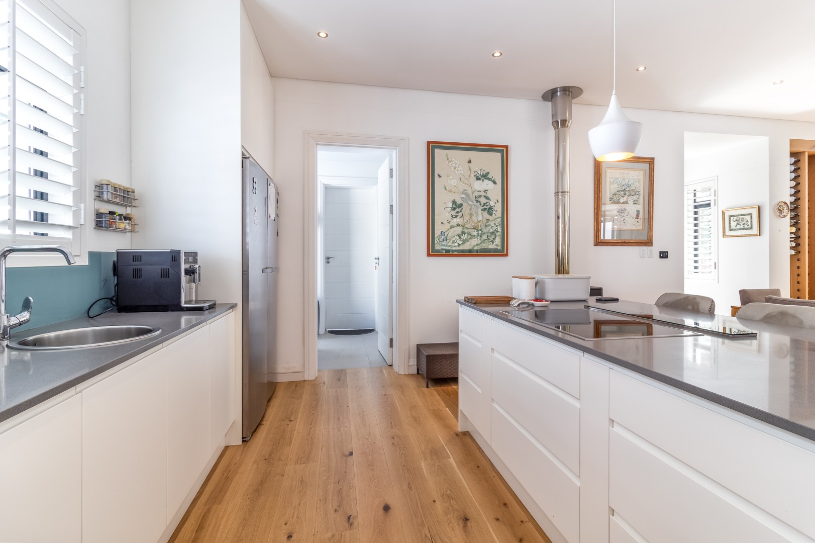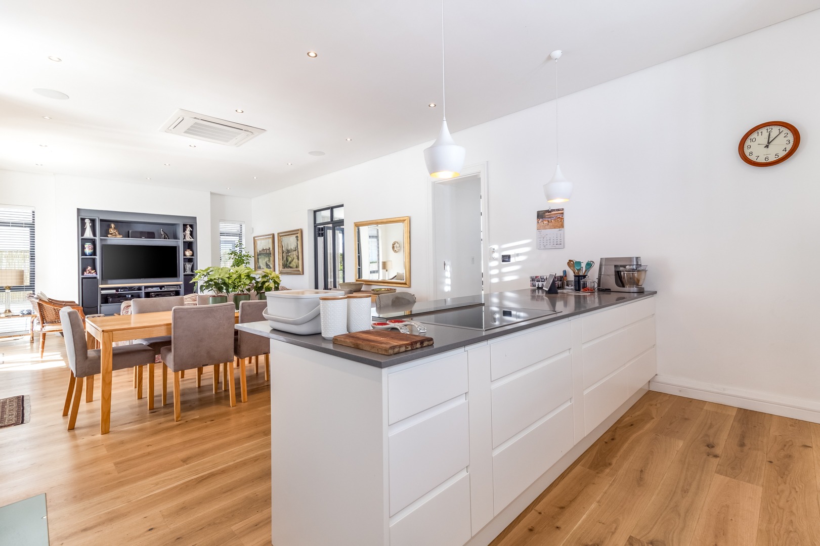 The open plan lounge and dining room areas are warm and inviting, featuring hardwood flooring throughout and a slow combustion fireplace, ensuring comfort in all seasons. The kitchen is expertly appointed with a sleek contemporary design, complemented by elegant Caesarstone countertops, Miele appliances and separate scullery.