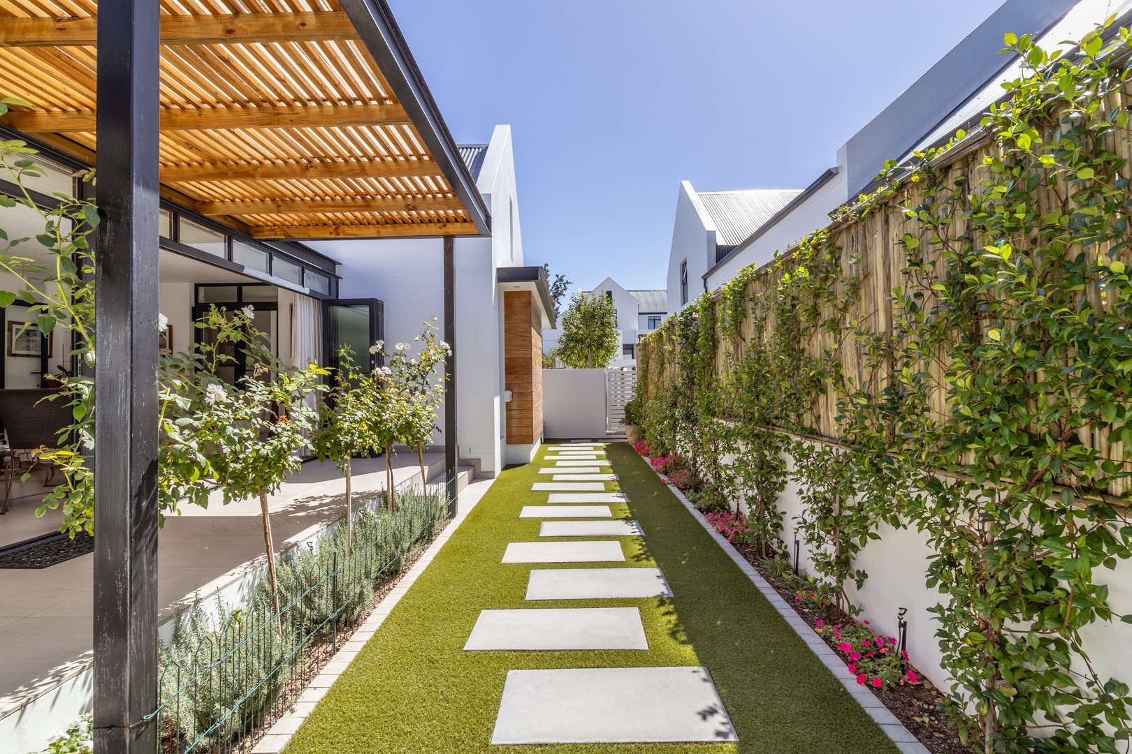 The garden is charming and beautifully landscaped, in immaculate condition. The exquisite iceberg roses create an impressive view from the patio, while mature plantings form a natural, private hedge.