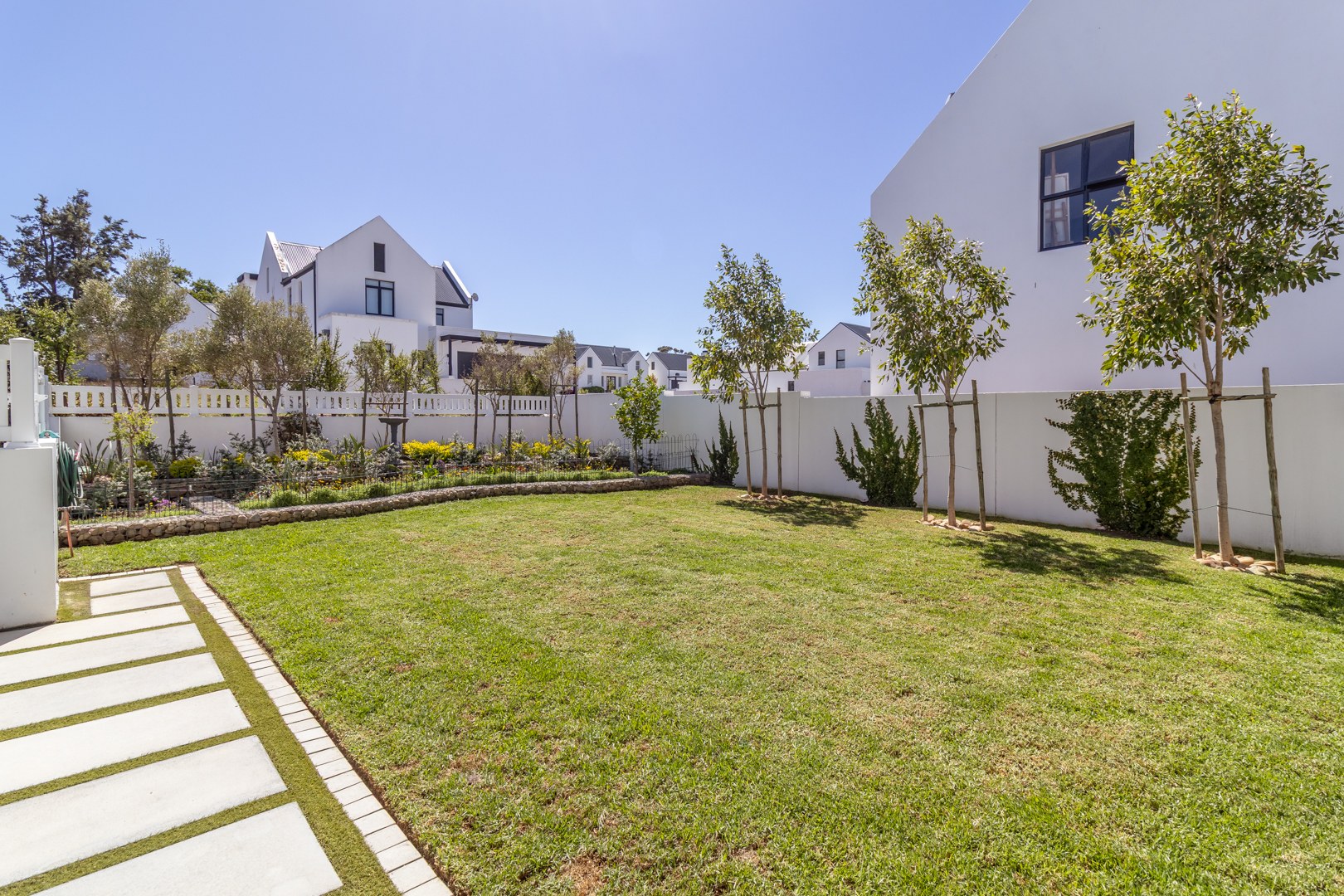 The garden is charming and beautifully landscaped, in immaculate condition. The exquisite iceberg roses create an impressive view from the patio, while mature plantings form a natural, private hedge.