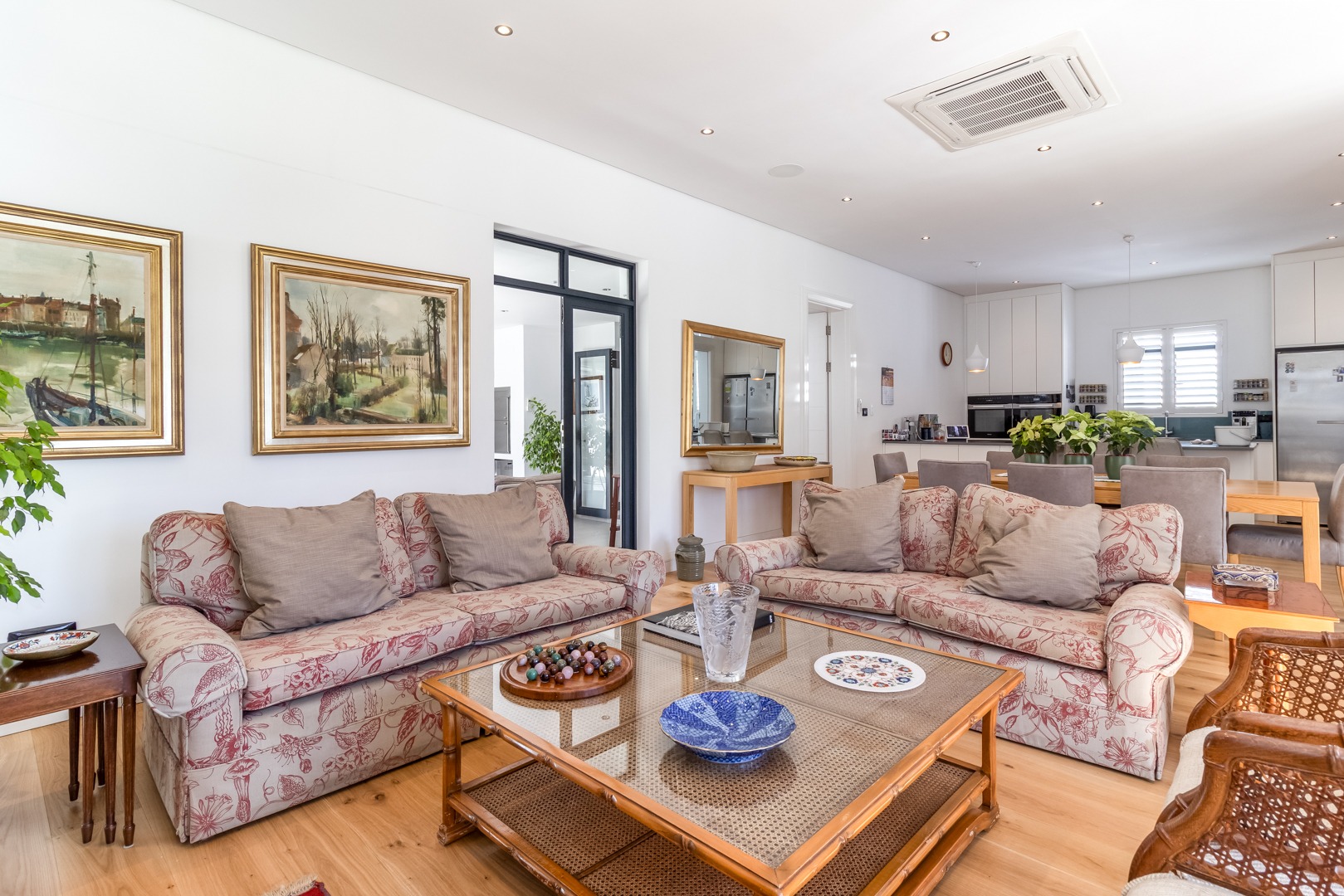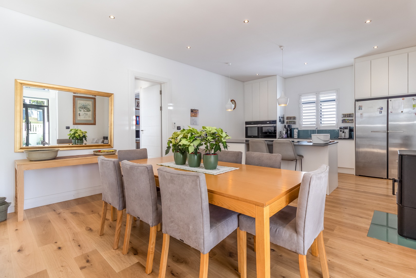 The open plan lounge and dining room areas are warm and inviting, featuring hardwood flooring throughout and a slow combustion fireplace, ensuring comfort in all seasons. The kitchen is expertly appointed with a sleek contemporary design, complemented by elegant Caesarstone countertops, Miele appliances and separate scullery.