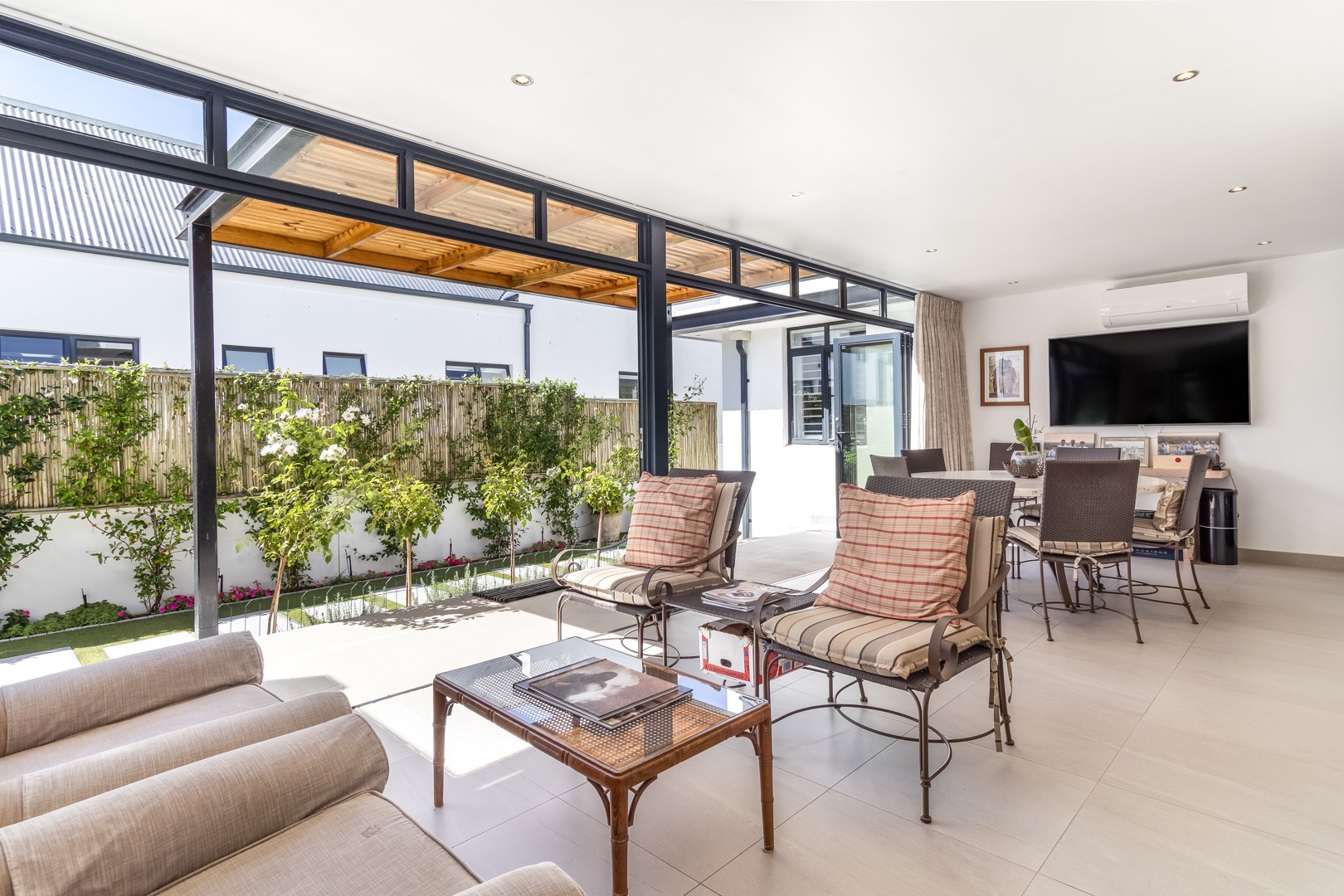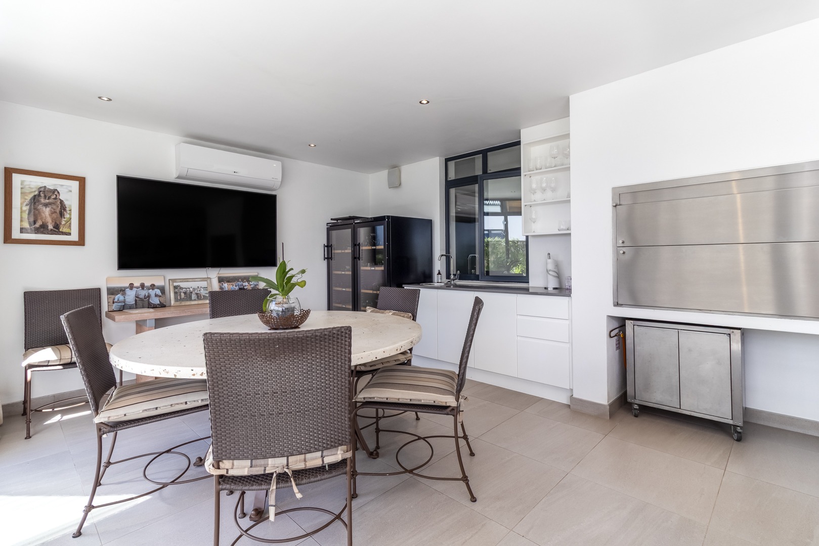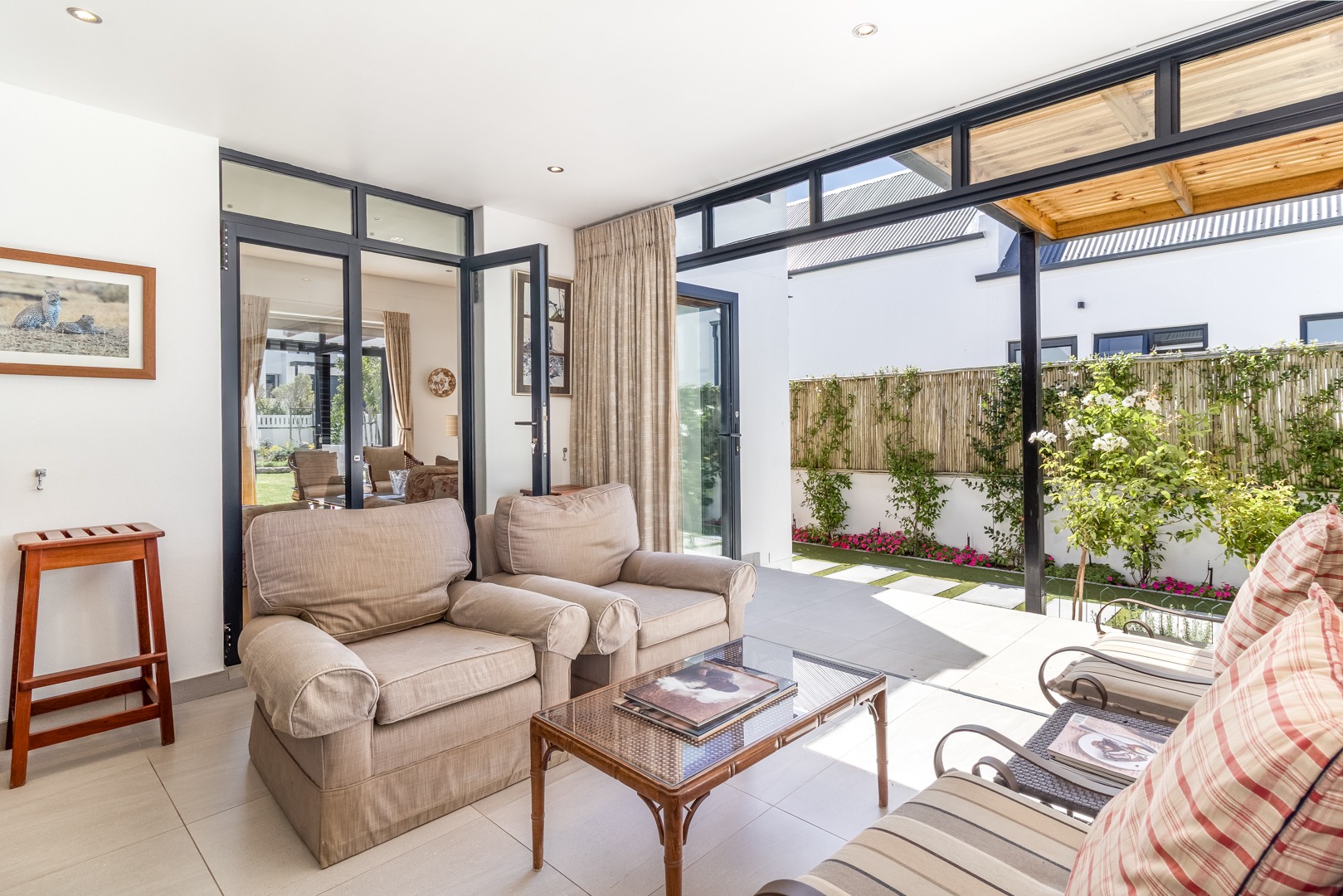 Winelands Village Estate in Raithby is a sought after security estate that offers residents the enjoyment of a rural lifestyle in scenic surroundings. This exquisite North East facing property features exclusive, modern finishes and is perfectly positioned in a quiet cul de sac. A rare gem, it represents the pinnacle of superior design and convenience, where every detail has been thoughtfully planned. This home offers a seamless flow from the entertainment areas to an expansive indoor patio, ideal for relaxed gatherings. Complete with a gas braai and stackable doors, this space creates a delightful indoor-outdoor feel.
