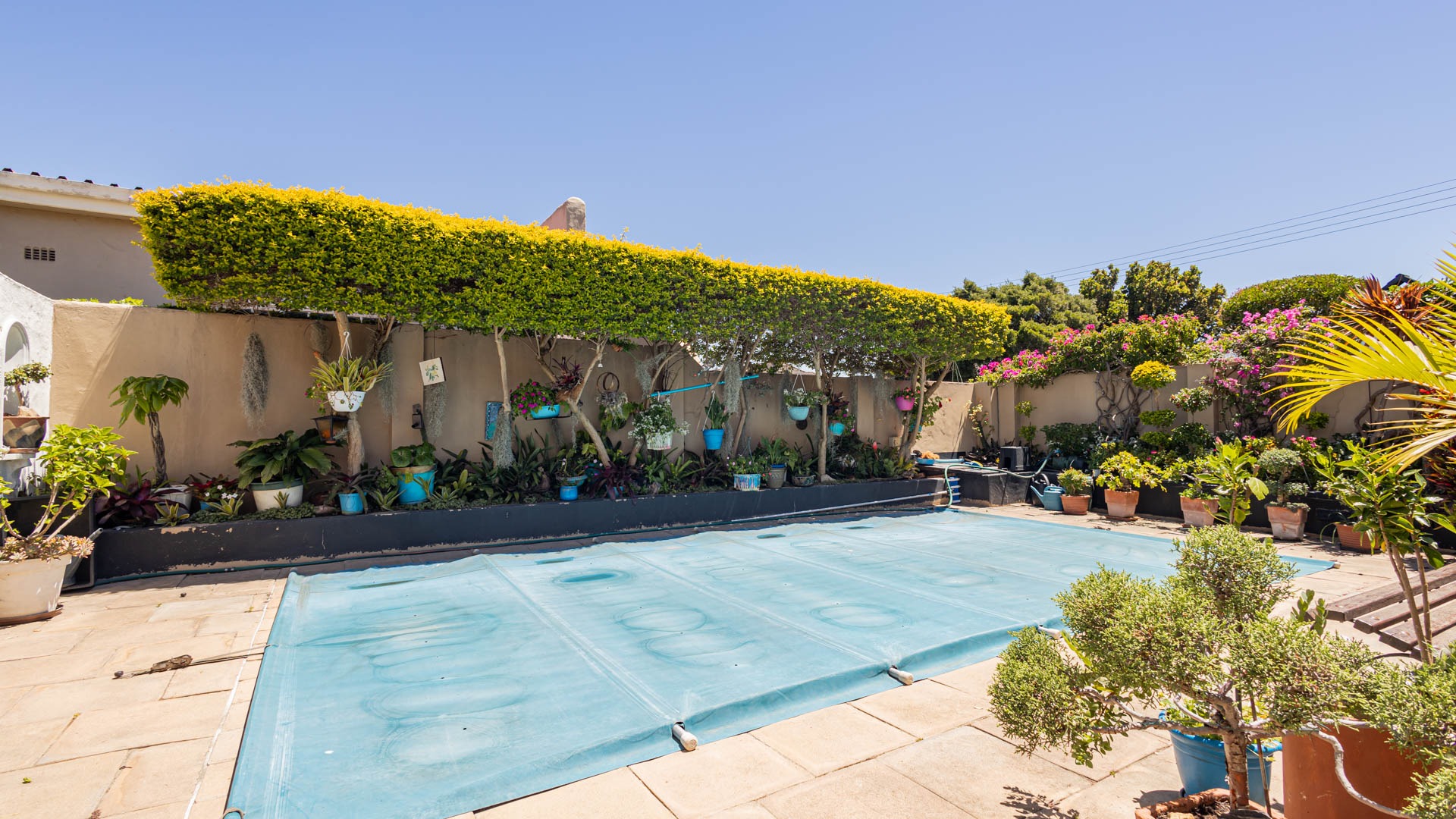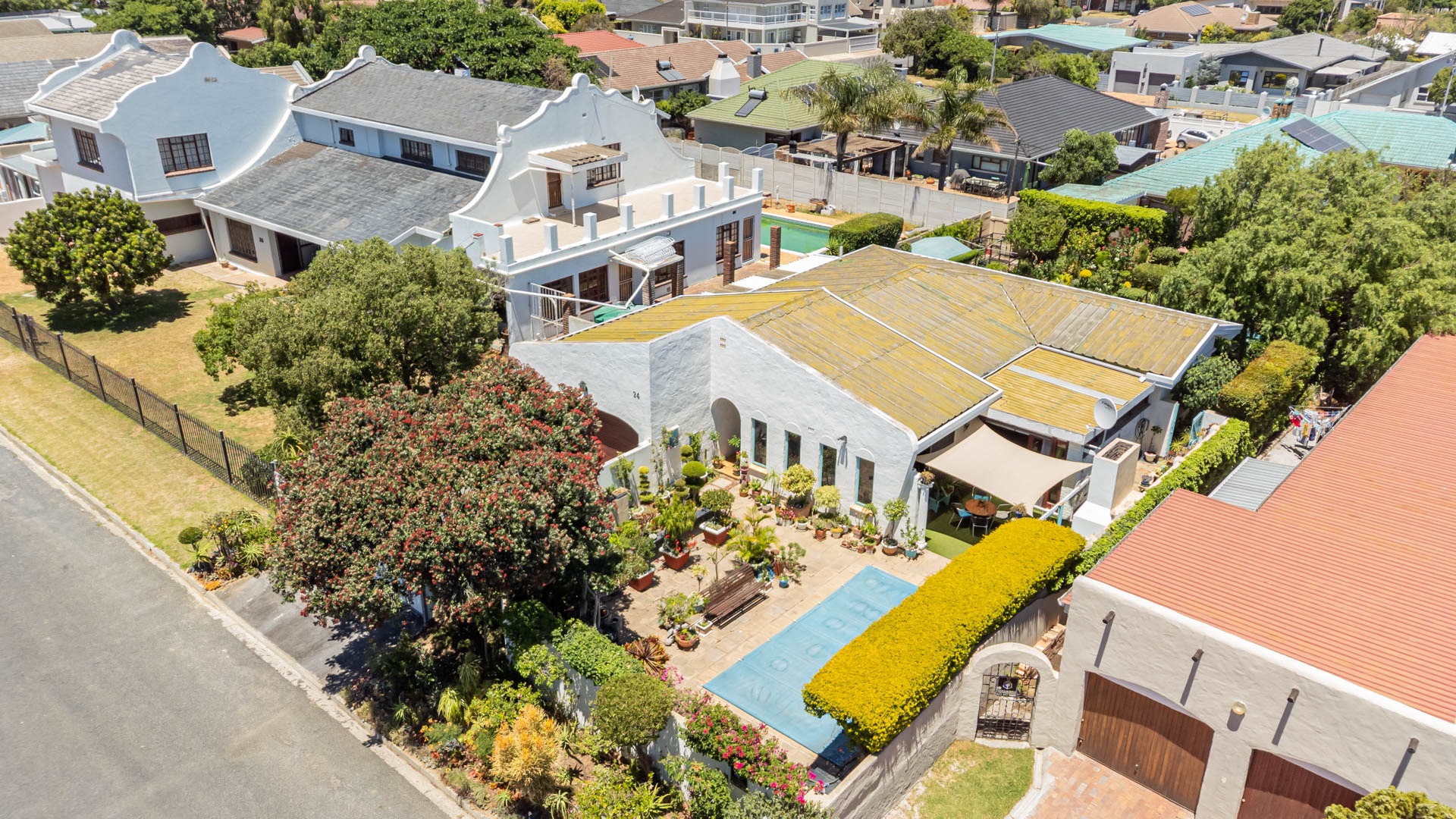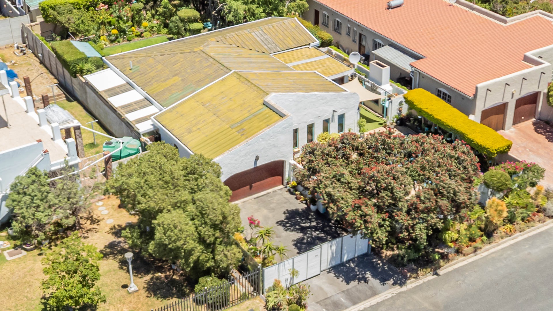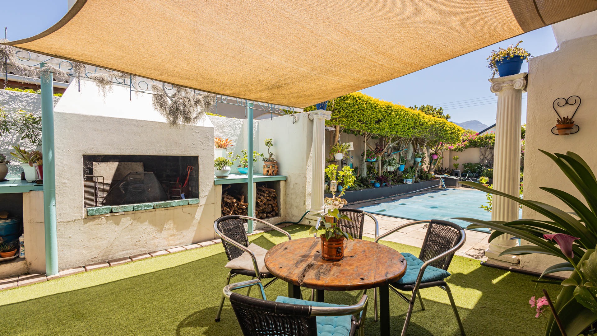 Outside, your private oasis awaits! The front yard features a covered swimming pool, ready for sunny South African days. There's also a fantastic patio area with artificial turf and a built-in braai, making it super easy to host friends and family. With a lovely garden, paving, and a driveway leading to two direct access garages and two additional parking spaces, convenience is key. Your furry friends are welcome too! Water tanks are a thoughtful touch for sustainable living.