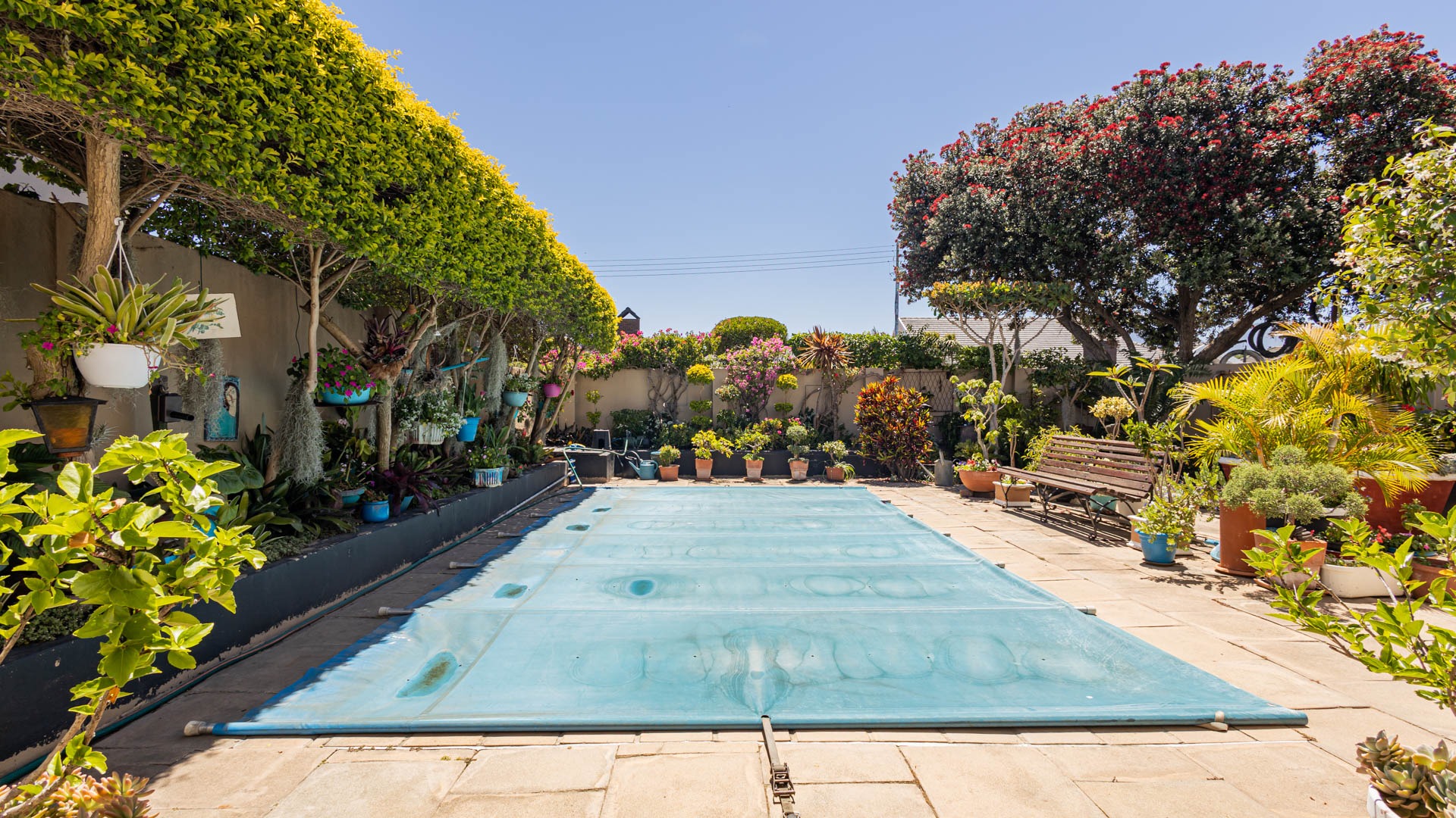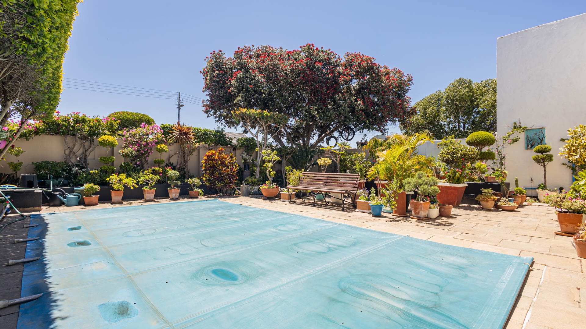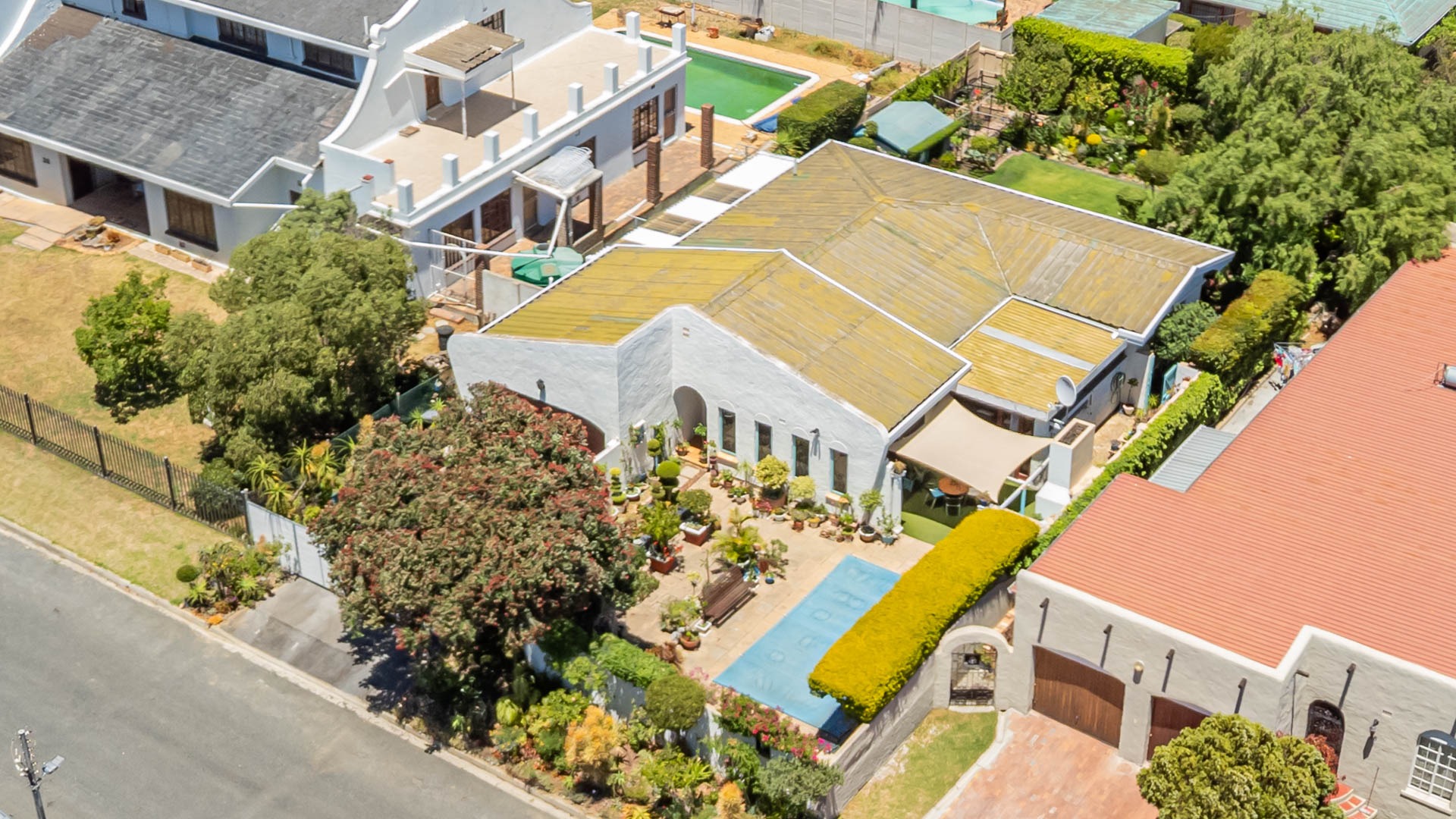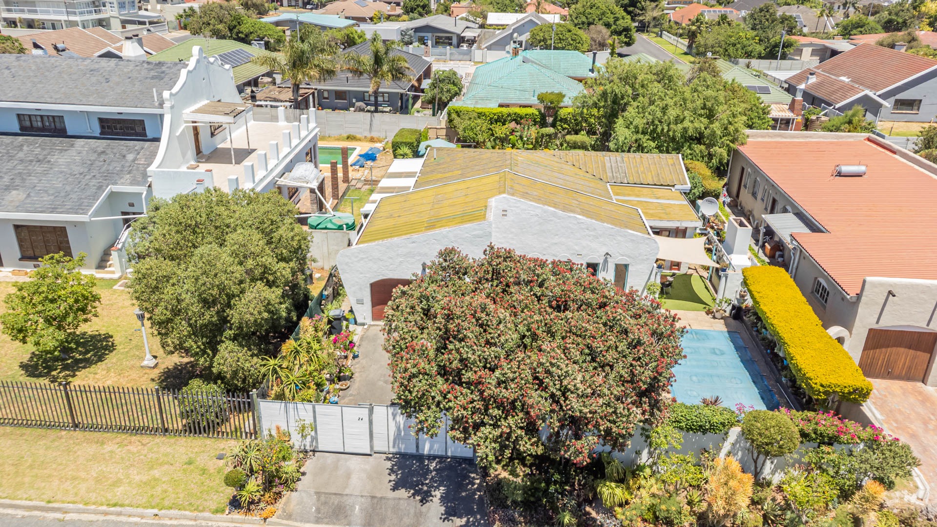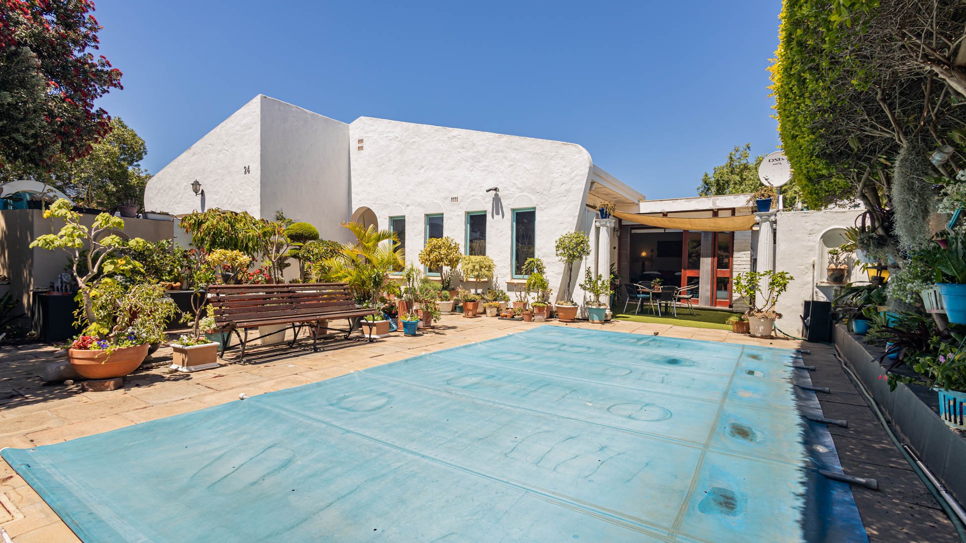 Outside, your private oasis awaits! The front yard features a covered swimming pool, ready for sunny South African days. There's also a fantastic patio area with artificial turf and a built-in braai, making it super easy to host friends and family. With a lovely garden, paving, and a driveway leading to two direct access garages and two additional parking spaces, convenience is key. Your furry friends are welcome too! Water tanks are a thoughtful touch for sustainable living.