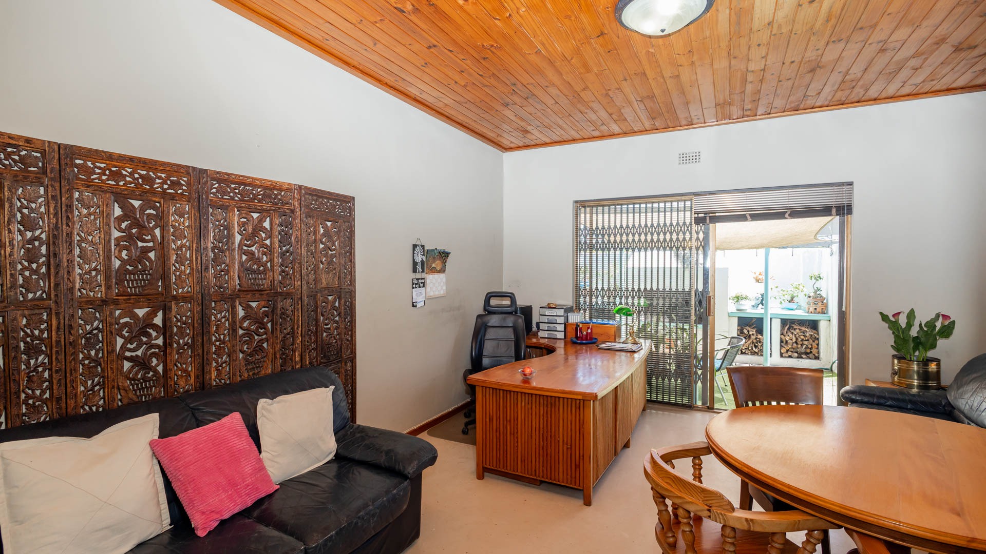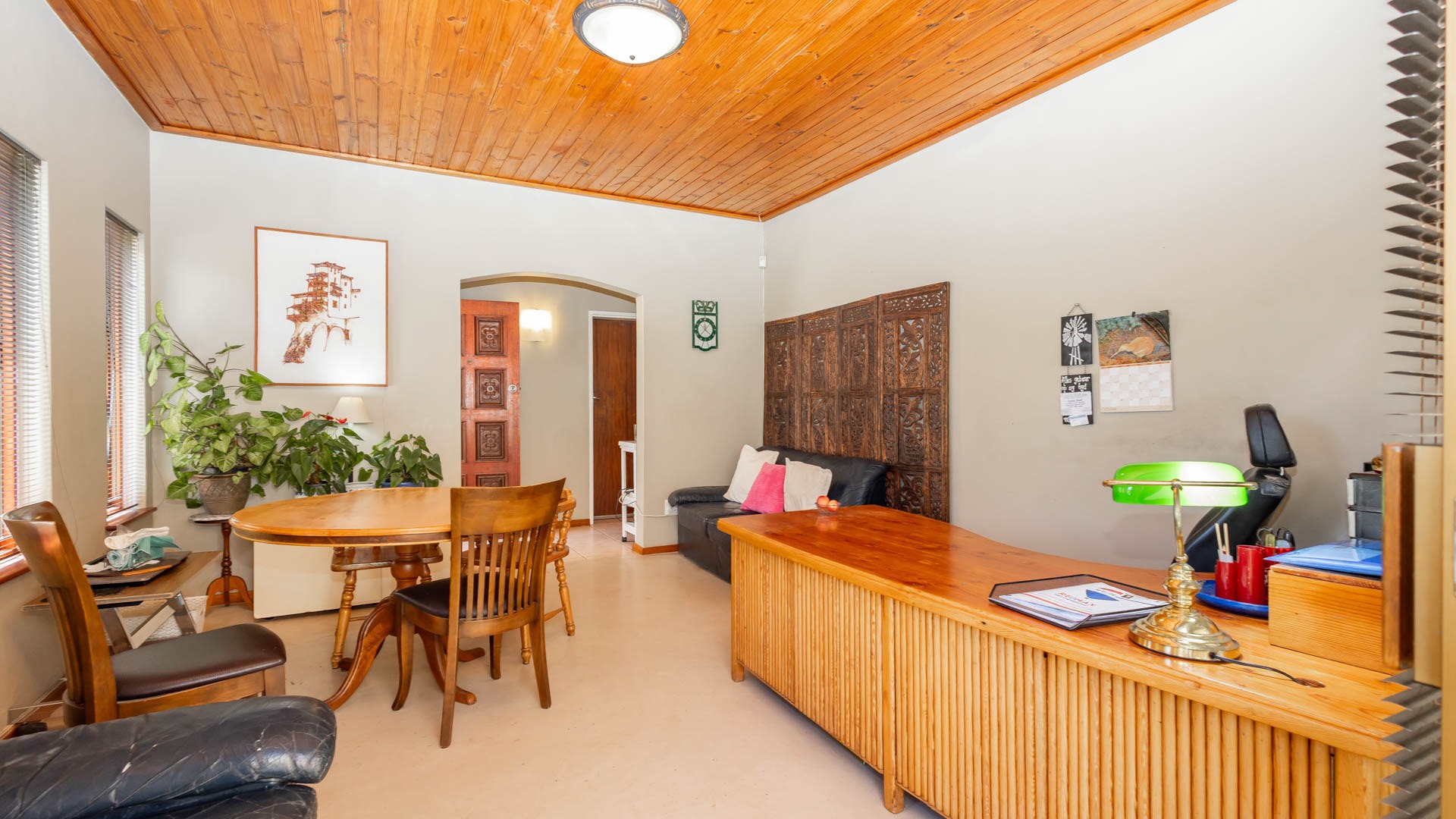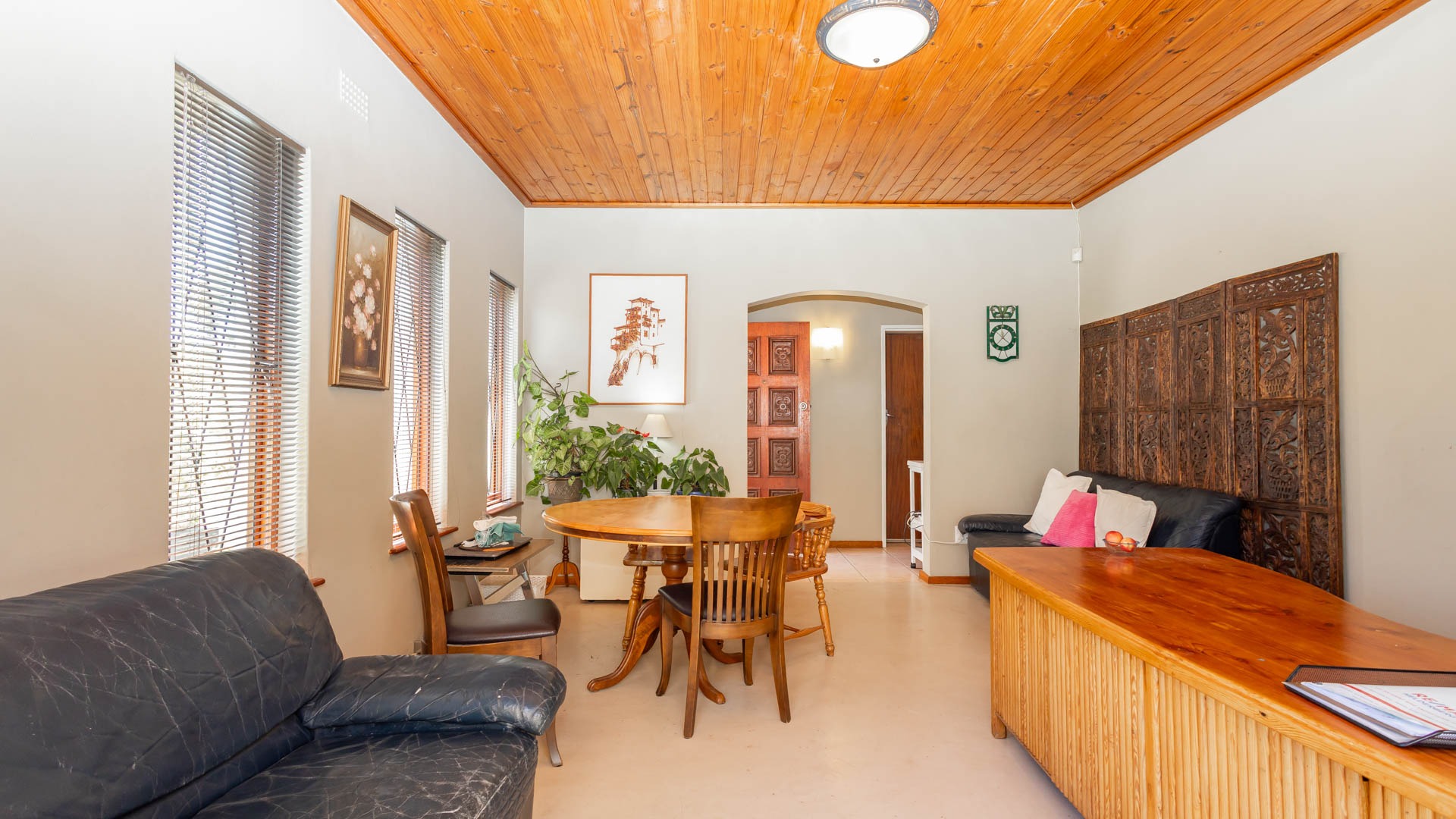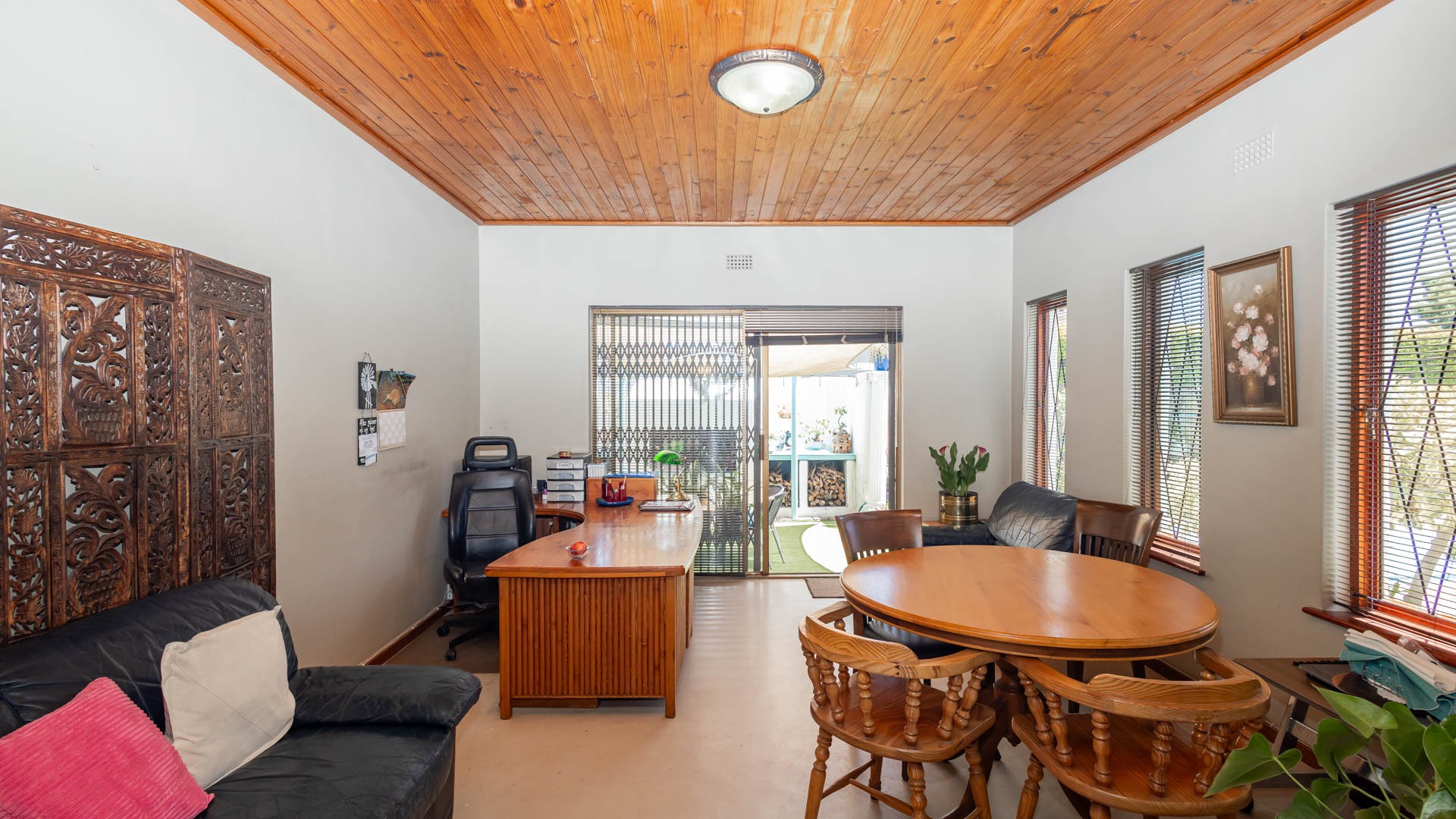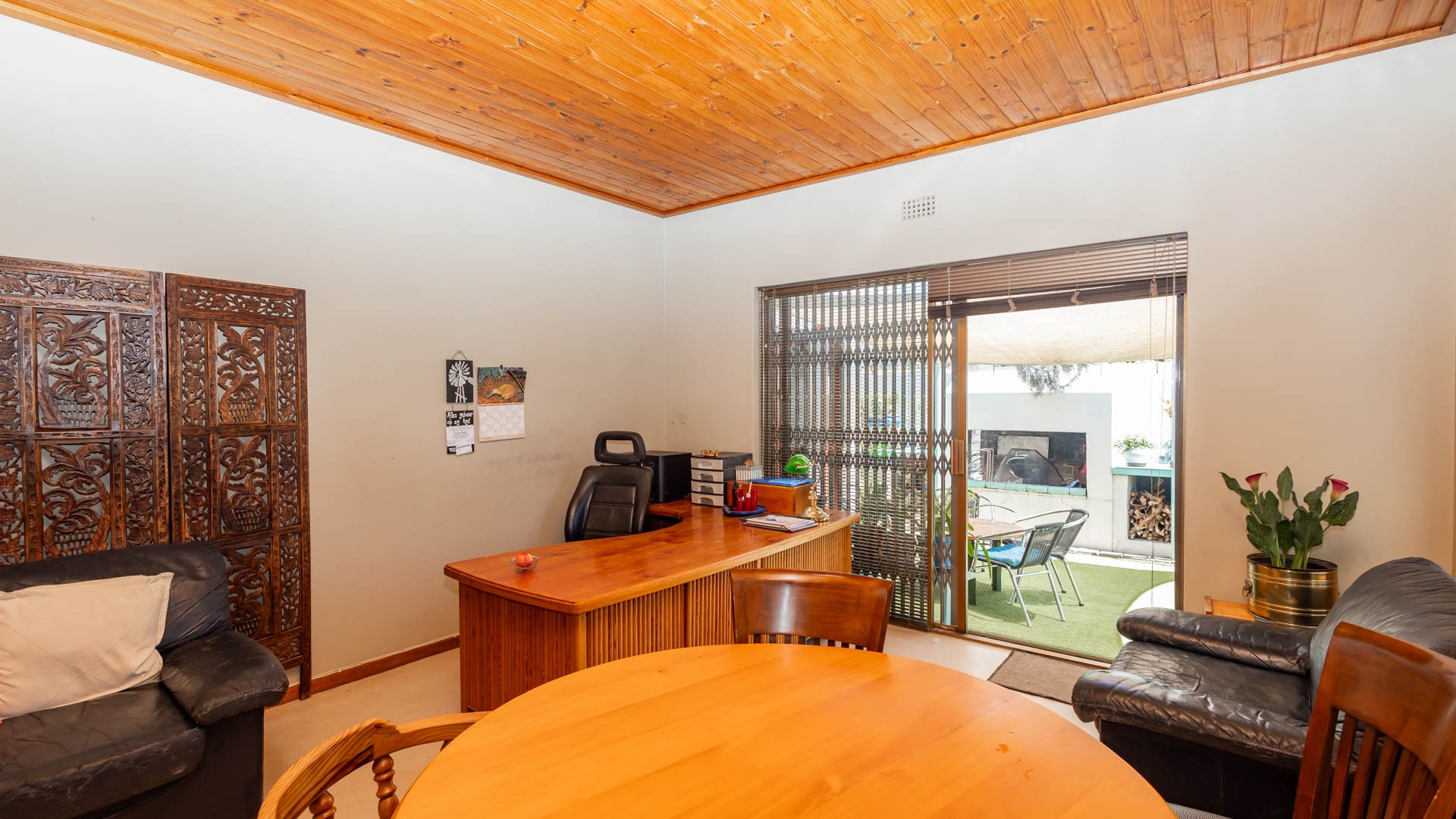 Step inside and discover a versatile layout designed for easy living. From your entrance hall, you are greeted by a private lounge or study...ideally for working from home, walking out onto an undercover patio and braai area... You'll find a well-equipped kitchen with a kitchen nook, a built in oven and hob and plenty of cupboards, walking out onto a stoep that offers washing facilities for a washing machine and tumble drier. An extremely spacious dedicated dining room, and a cozy lounge for the whole family that walks out onto a patio, braai and swimming pool area. Many rooms feature unique, warm wooden slatted or plank ceilings that add character. This home boasts three comfy bedrooms and two bathrooms, including a main en-suite.