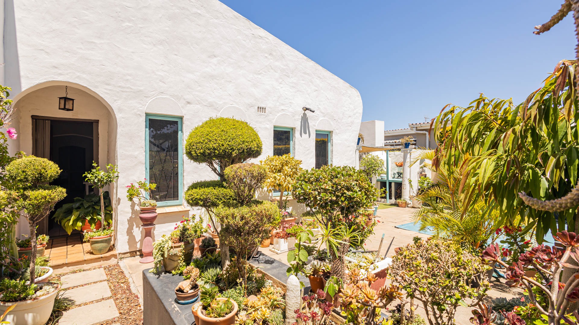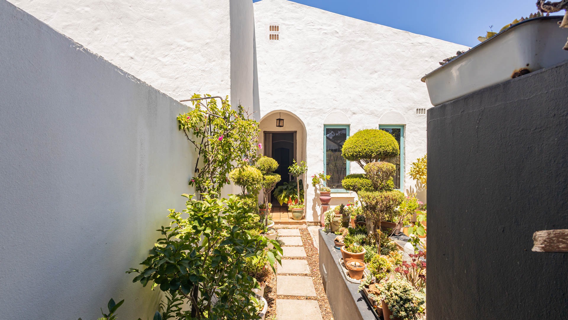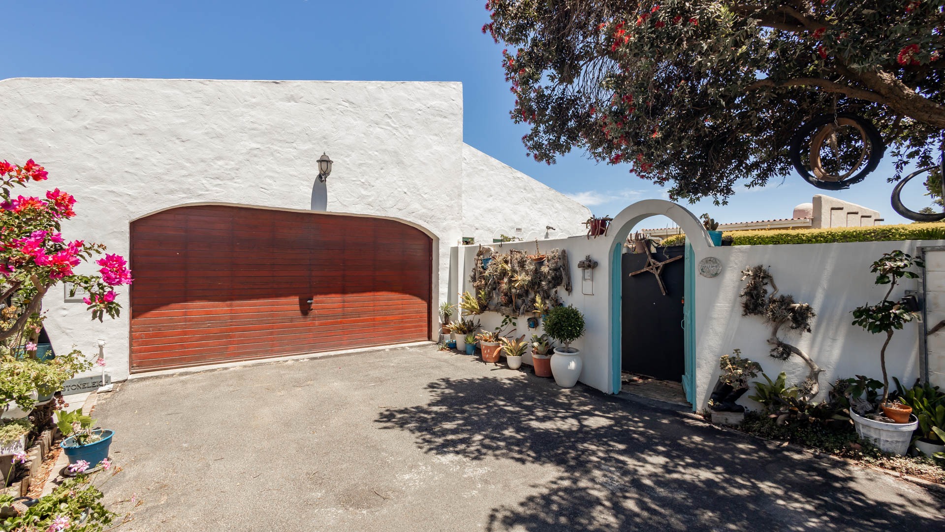 Welcome to this charming home in Strand North, where relaxed living meets comfort and convenience. As you approach, you'll be greeted by a lovely white outside facade with a bit of a Spanish feel to it and a lush, inviting entryway adorned with potted plants, leading through a secluded, walled pathway to an appealing arched front door. It truly makes a wonderful first impression!