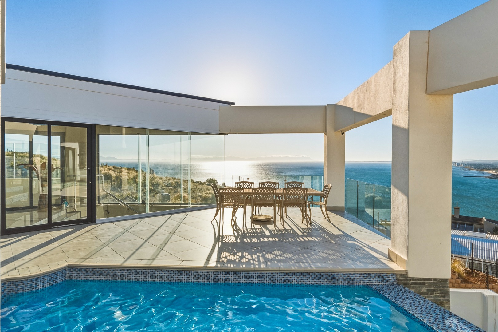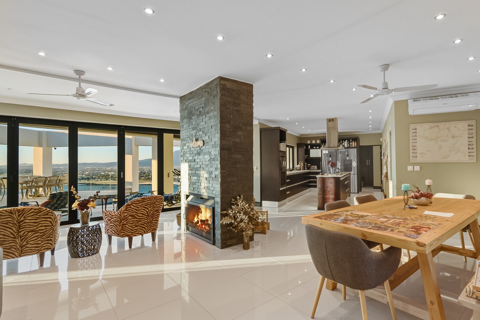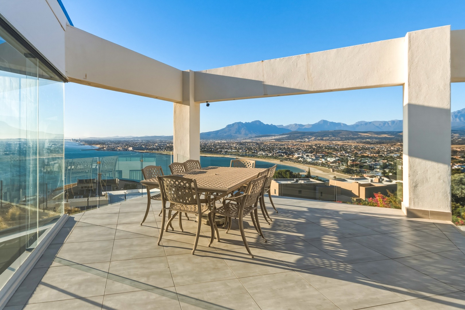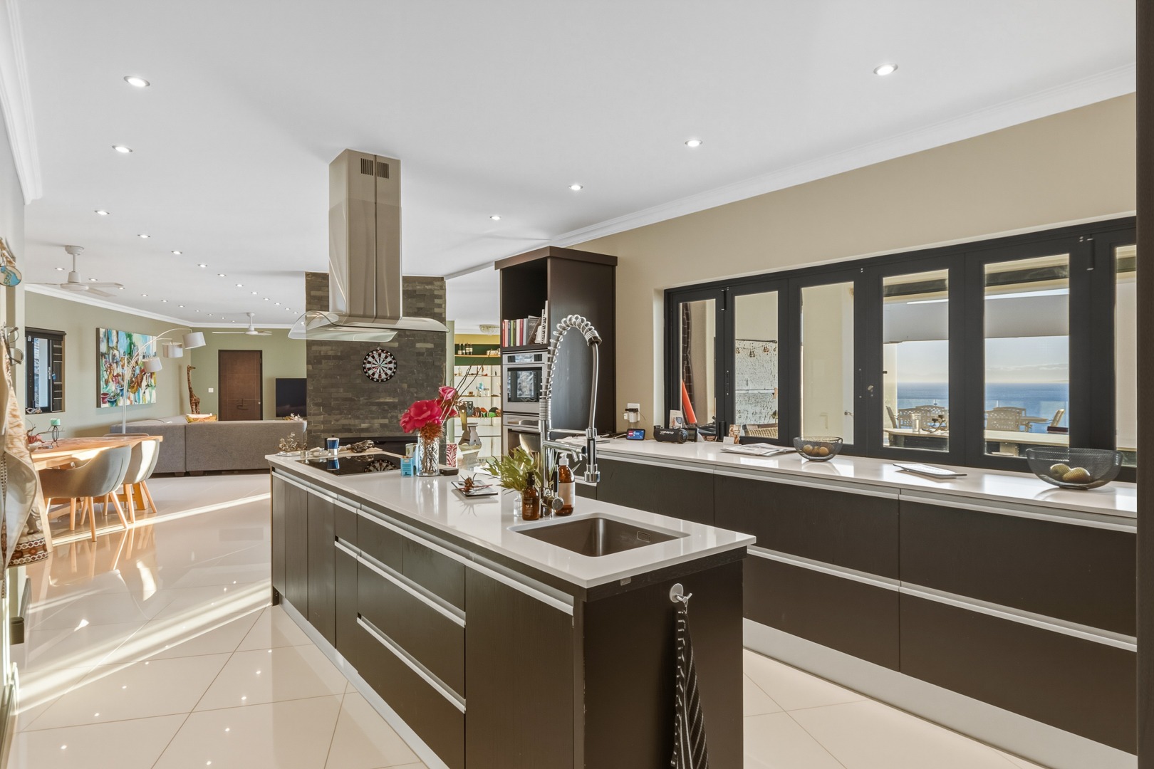 - Open plan kitchen, dining room and lounge. Large format glass sliding doors, allowing in the stunning False Bay views