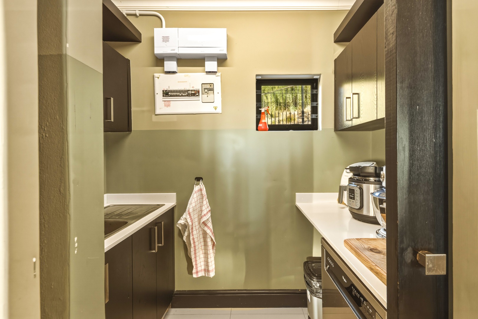 - Kitchen has double fridge, eye level oven, electric hob, separate scullery with dishwasher.