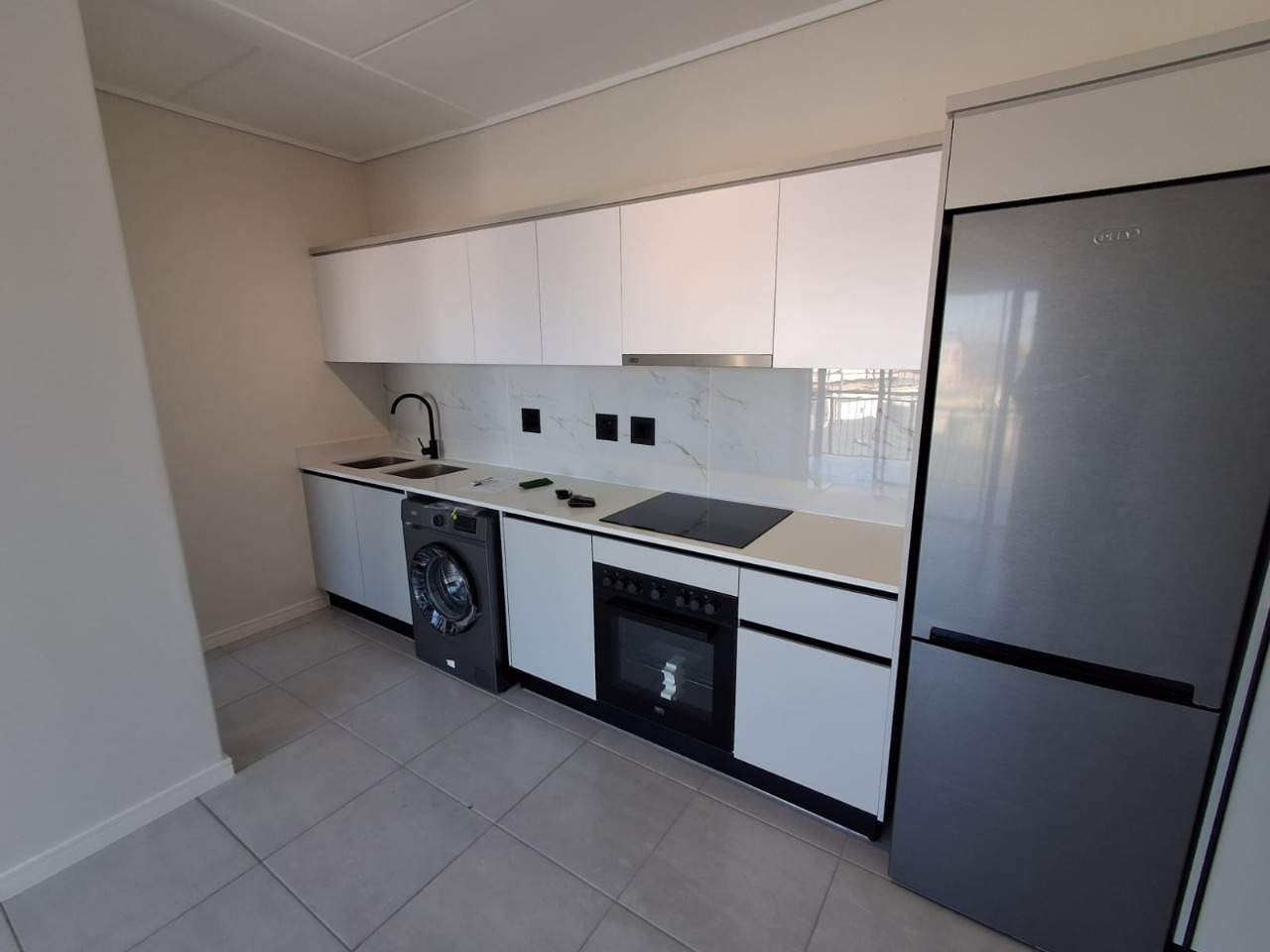The sleek kitchen is finished with quality fittings and includes essential appliances such as an oven, fridge, and washing machine, all conveniently included in the rental. The apartment is fiber and DSTV ready.