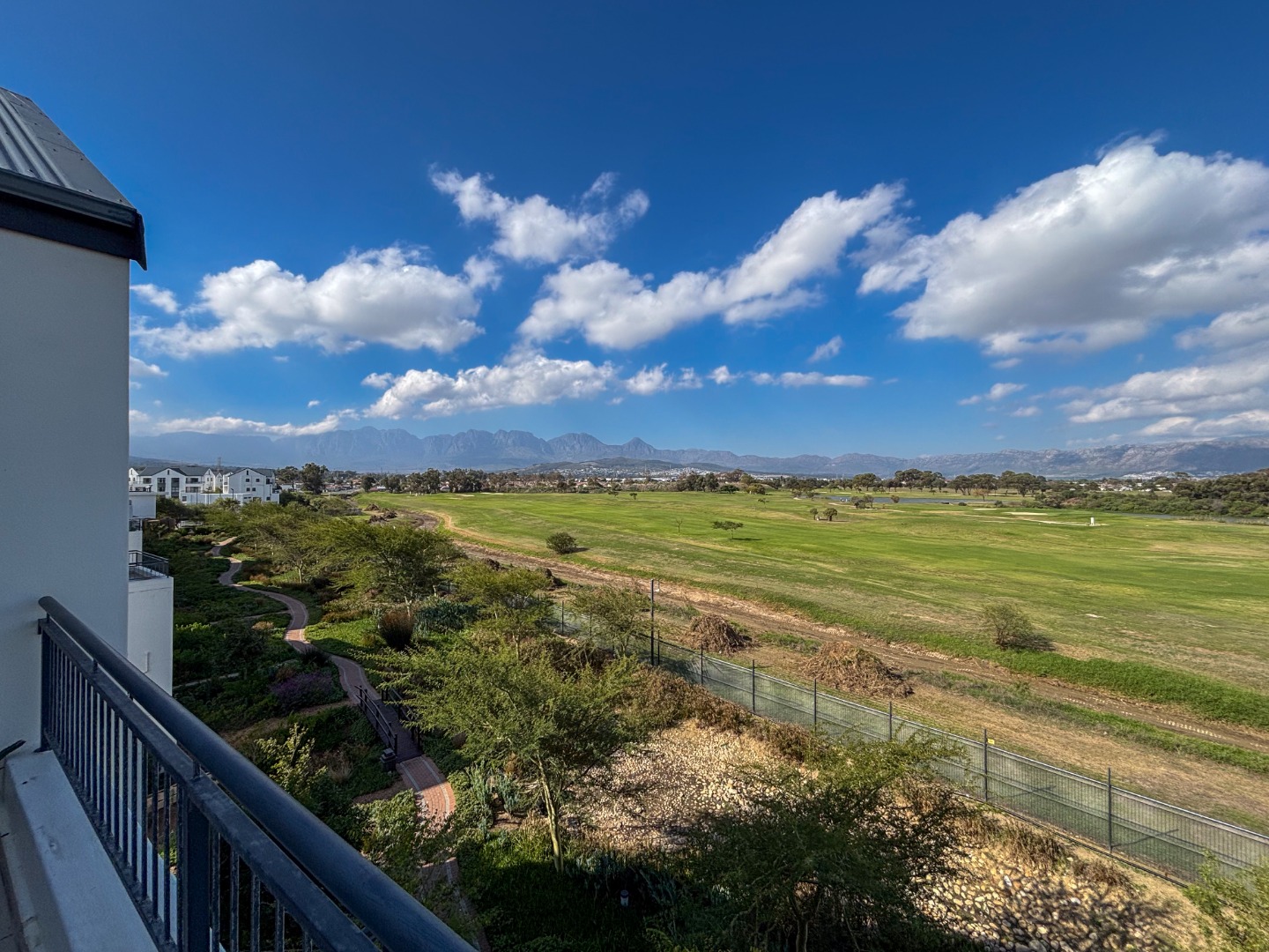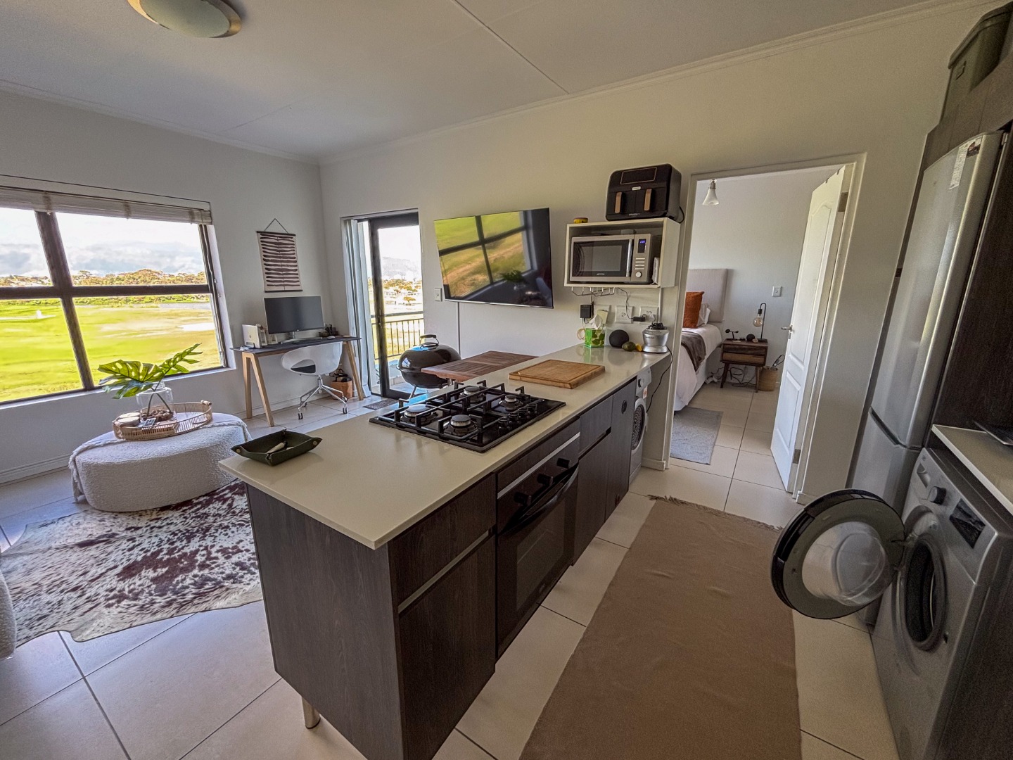This spacious, top-floor one-bedroom apartment overlooks the golf course and offers modern, stylish living. The kitchen is fitted with Caesarstone countertops and includes quality appliances such as a gas stove, fridge, washing machine, and tumble dryer. It flows seamlessly into the open-plan lounge and dining area, which leads onto a large east-facing balcony.