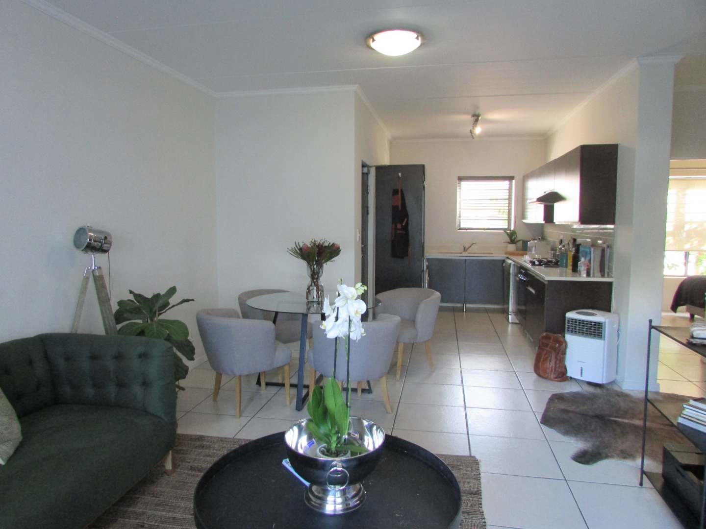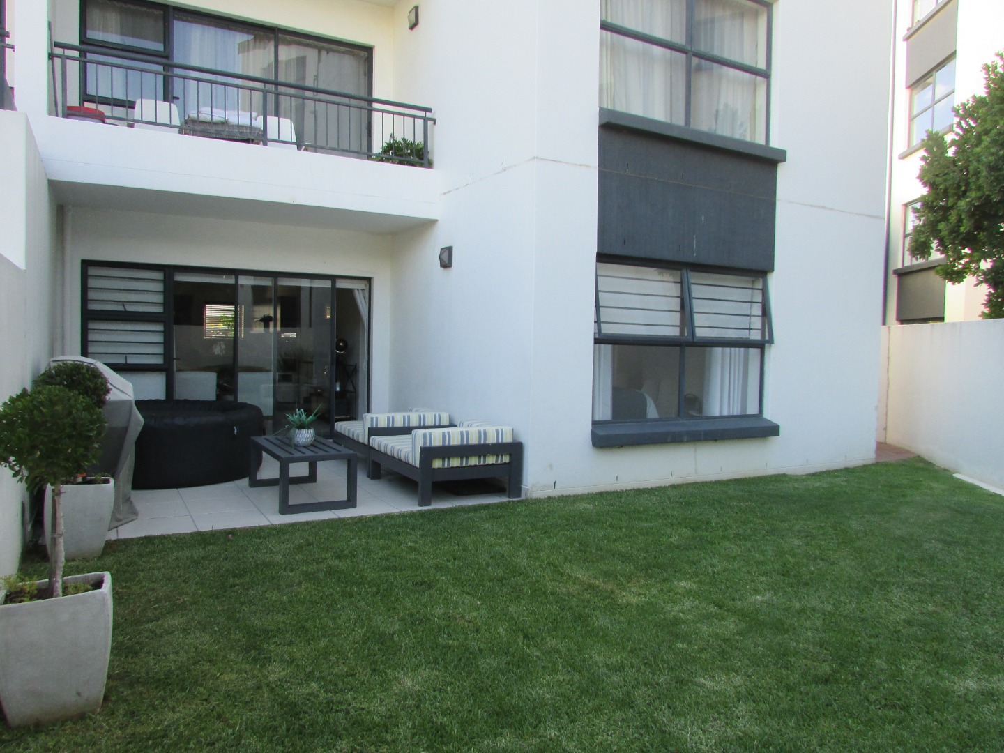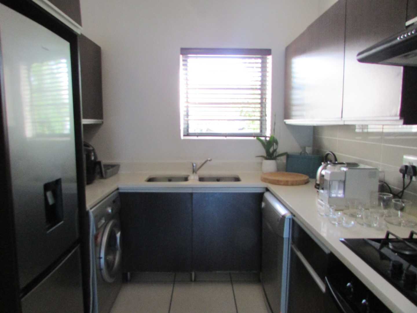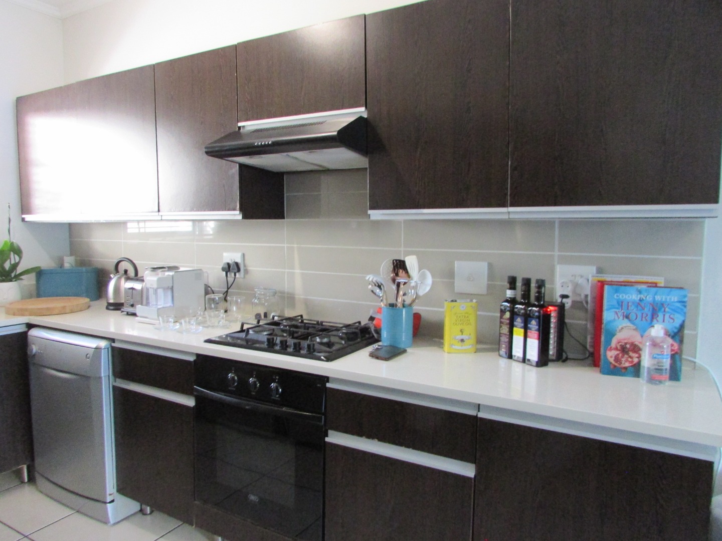 The 104sqm ground floor unit is situated close to main entrance and in a good condition walking out onto a lovely garden sunny garden. It offers a open plan kitchen with built in cupboards and granite tops and also includes a fridge, oven, hob and extractor with a washing machine and dryer. The lounge area offers enough space for a dining room table as well as a lounge. From the lounge, you walk out with a glass sliding door onto a patio and garden.