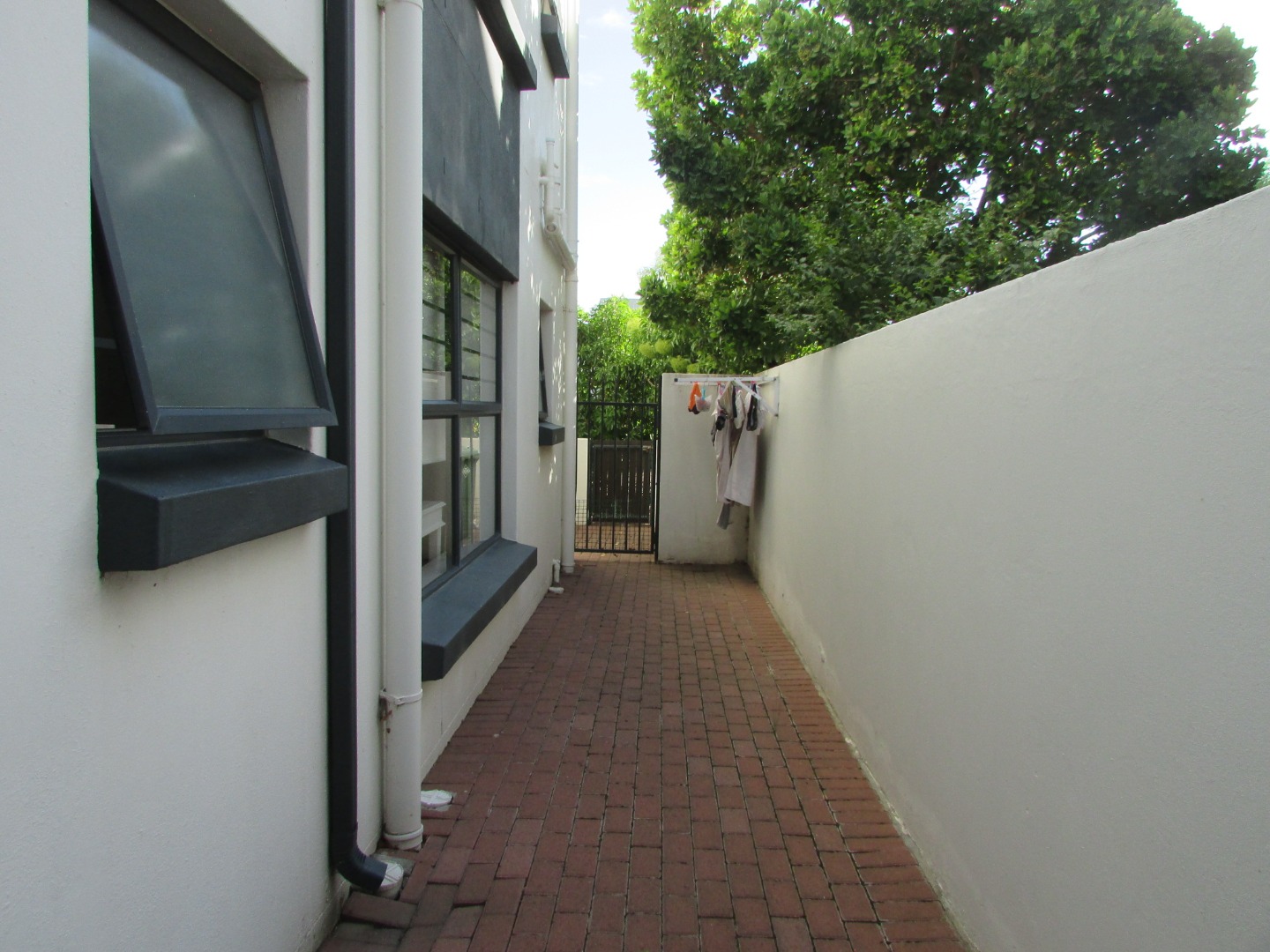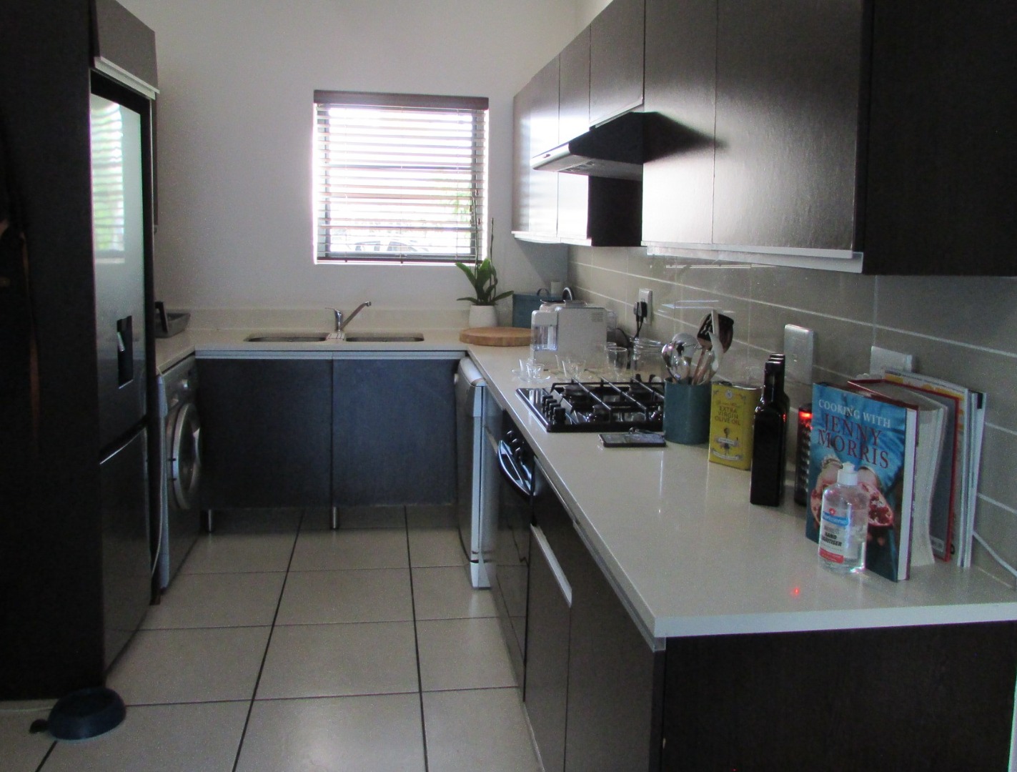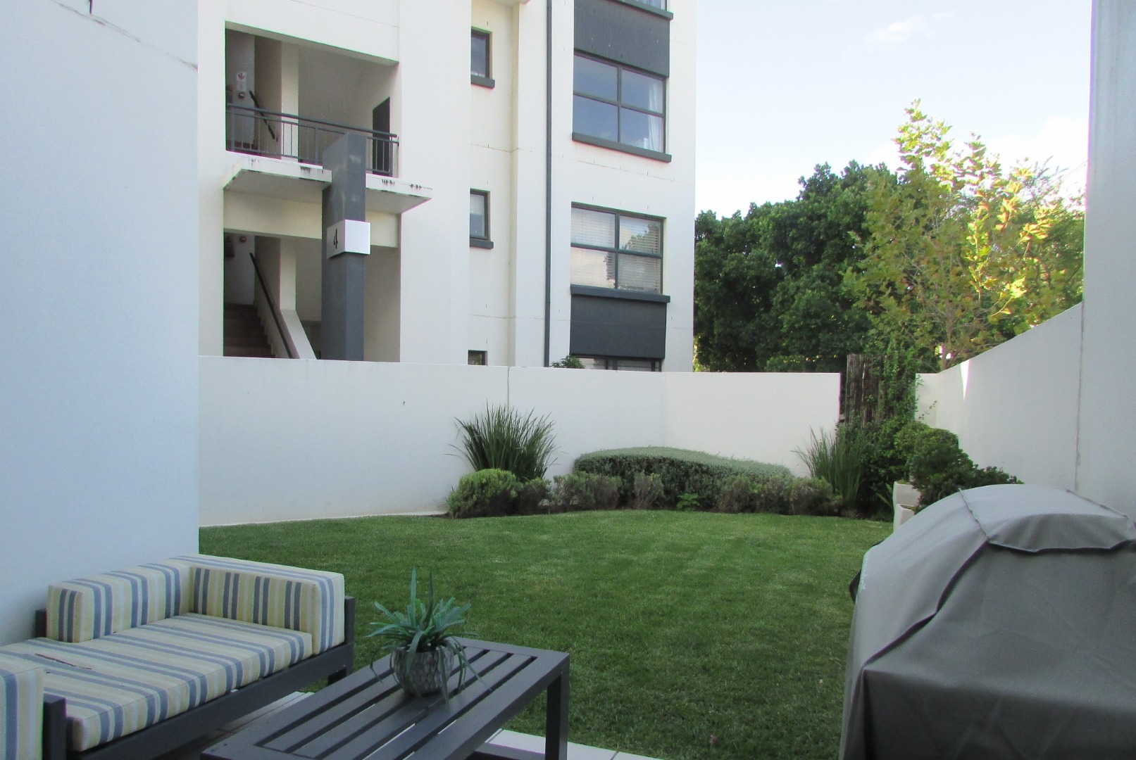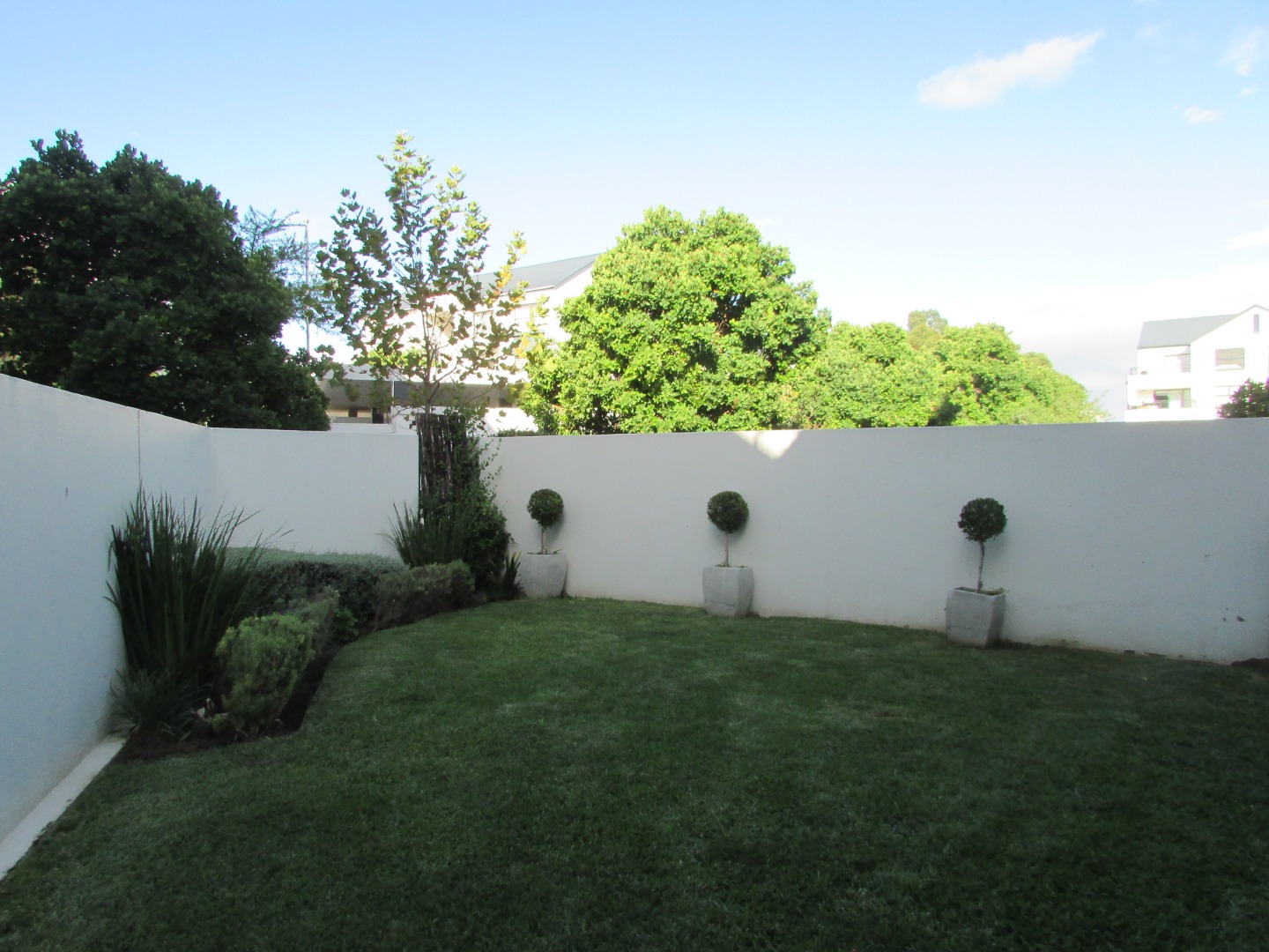 The 104sqm ground floor unit is situated close to main entrance and in a good condition walking out onto a lovely garden sunny garden. It offers a open plan kitchen with built in cupboards and granite tops and also includes a fridge, oven, hob and extractor with a washing machine and dryer. The lounge area offers enough space for a dining room table as well as a lounge. From the lounge, you walk out with a glass sliding door onto a patio and garden.