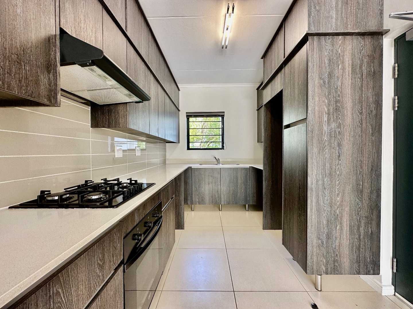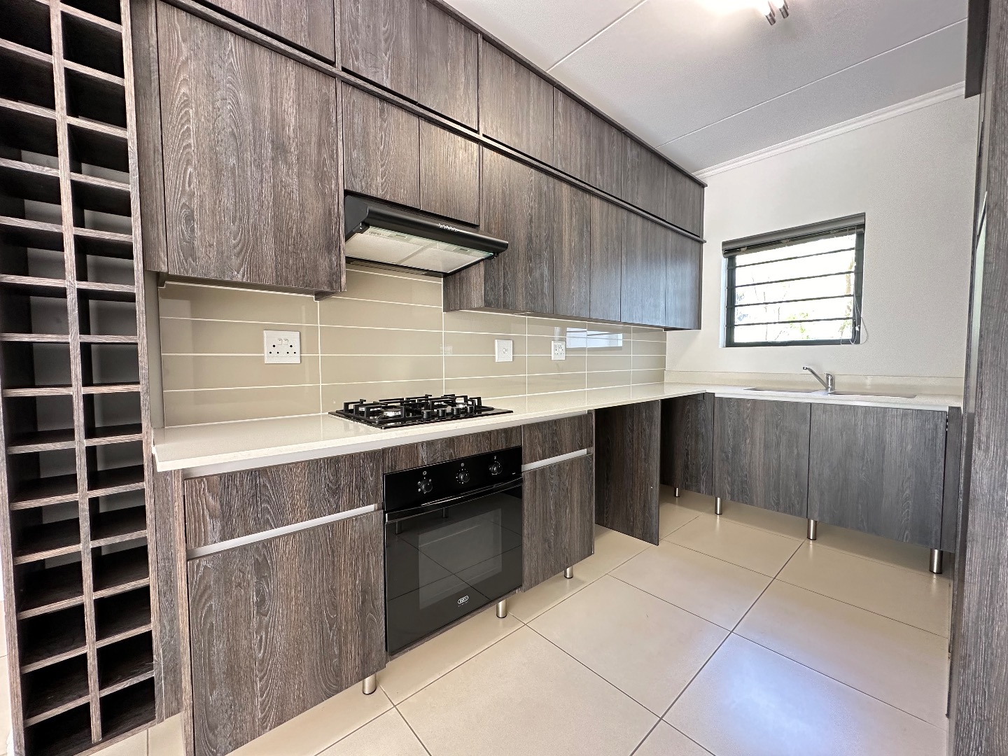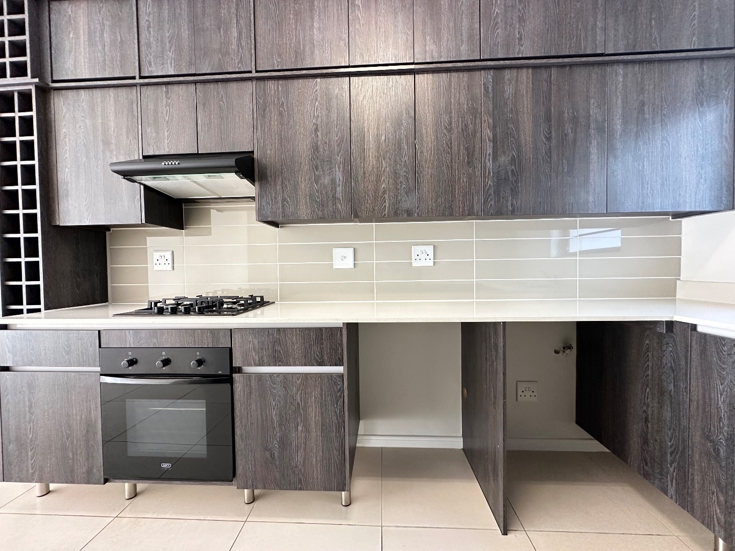 The heart of this home is the open plan kitchen featuring elegant caesarstone countertops, ample cupboard space, and oven with a gas hob. The kitchen flows seamlessly into the open plan dining/living room, creating a harmonious living environment.