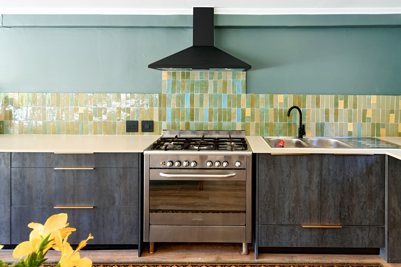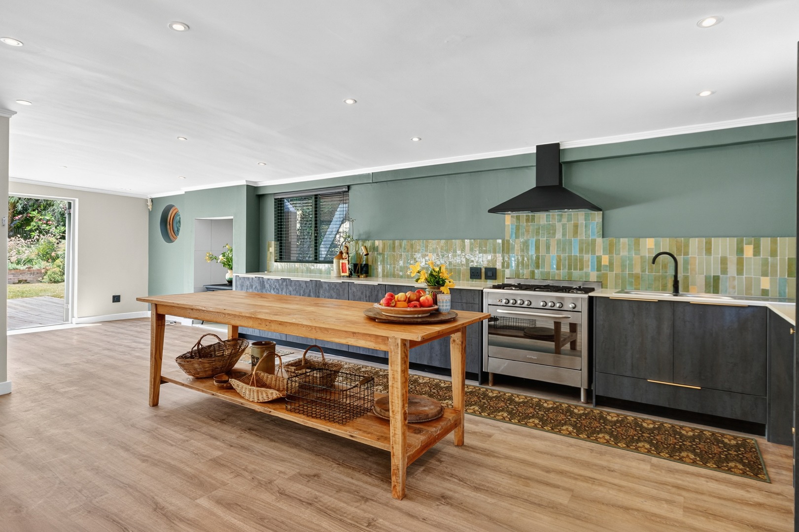 • A modern farm-style kitchen featuring a freestanding Smeg oven, large center island, and ample countertop space — ideal for any home chef.