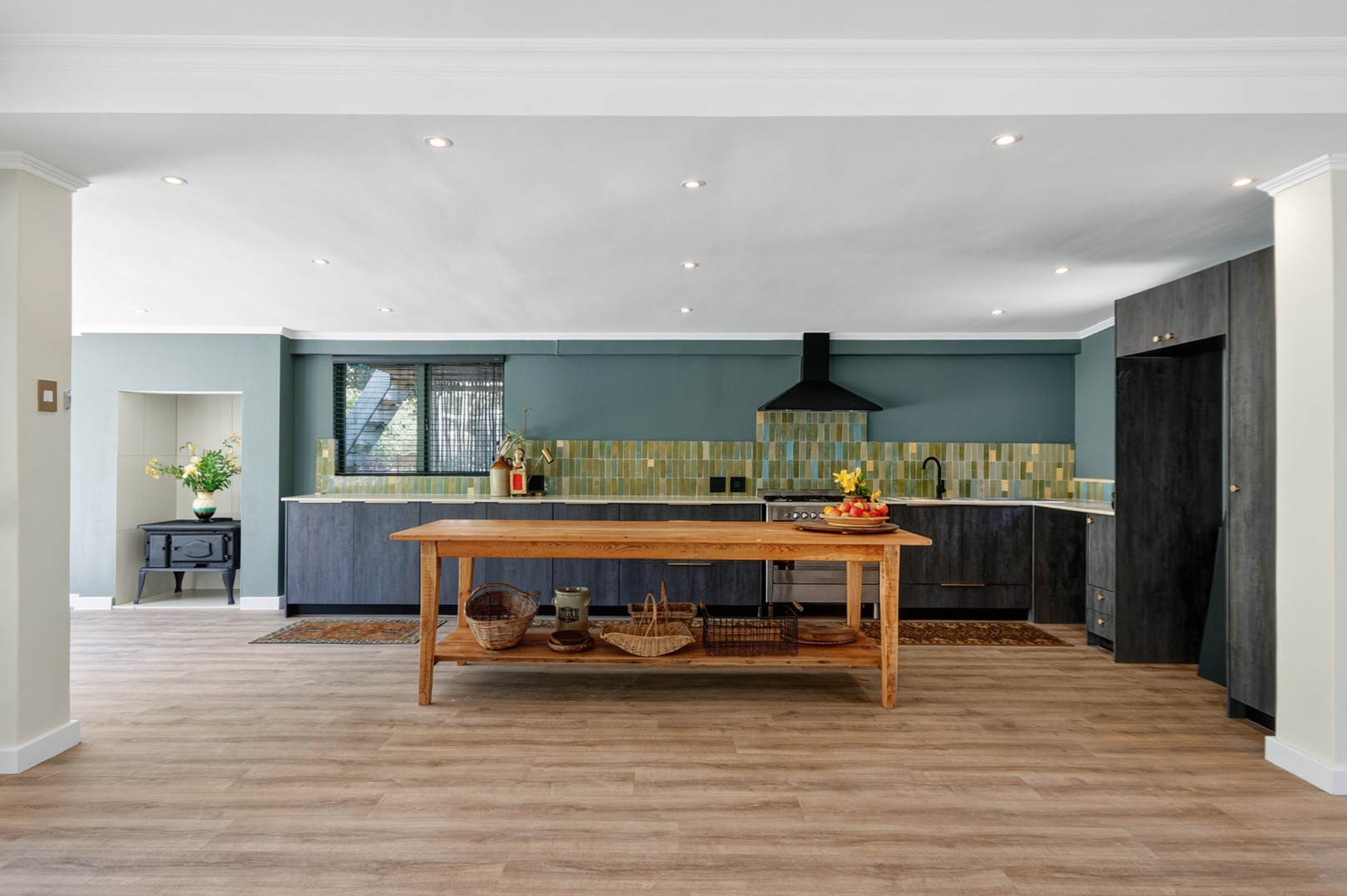 • A modern farm-style kitchen featuring a freestanding Smeg oven, large center island, and ample countertop space — ideal for any home chef.