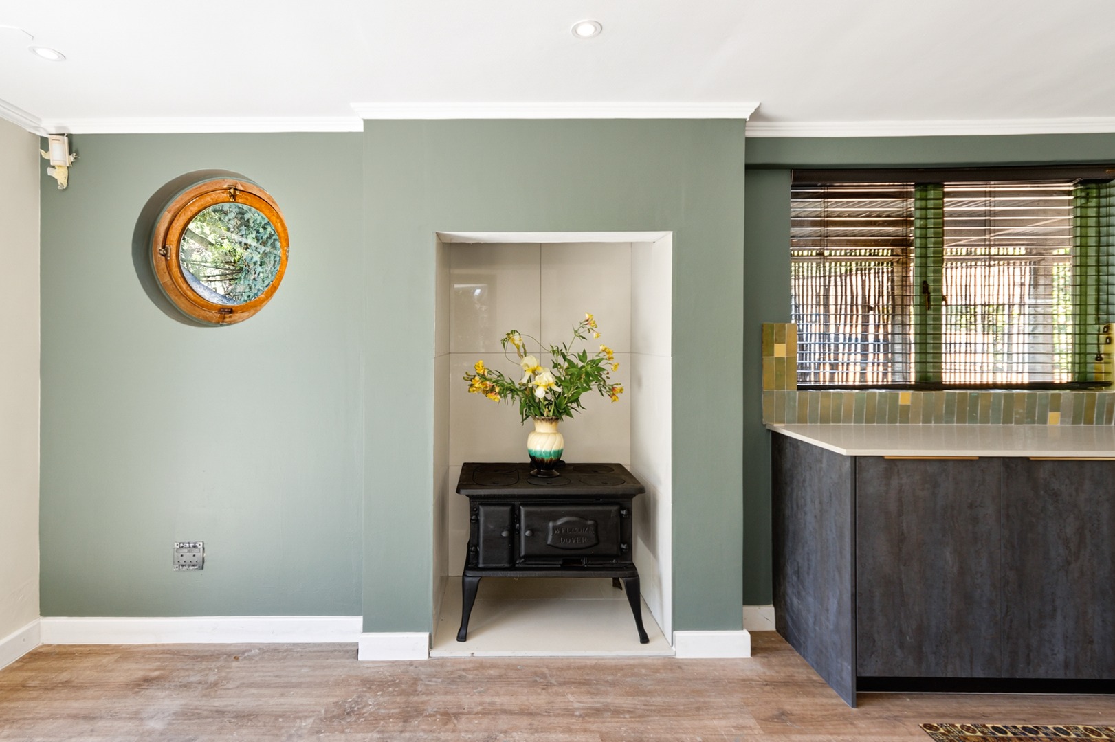 • Additional entertainment area adjacent to the kitchen with a cozy Dover-style wood-burning oven.