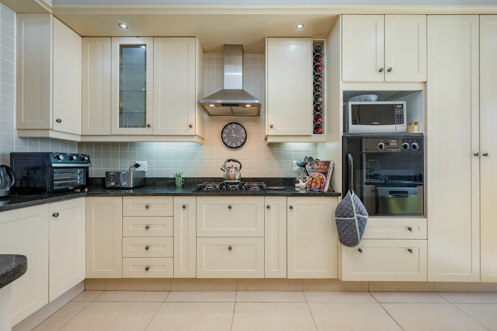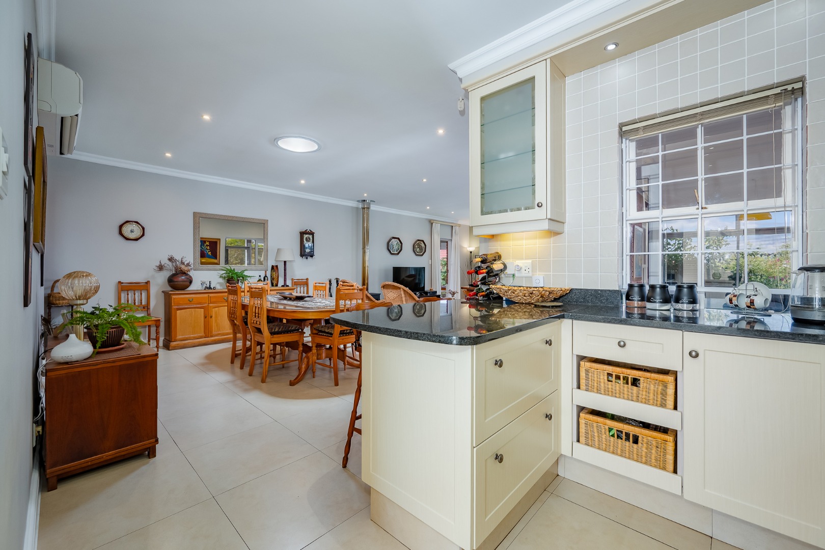 Discover this charming 3-bedroom, 2-bathroom home available for rent in the desirable Helena Heights, Somerset West. This residence offers an inviting open-plan layout, seamlessly connecting the living, dining, and kitchen areas. The well-appointed kitchen features cream-colored cabinetry, dark granite countertops, and integrated appliances including a built-in oven, gas hob, and extractor fan, complemented by a functional galley-style scullery for added convenience. Natural light floods the space, enhanced by recessed lighting and a skylight, while a cozy wood-burning stove and air conditioning ensure year-round comfort.