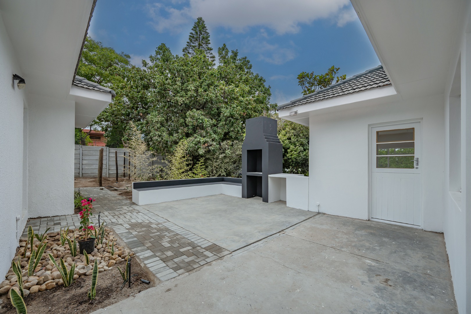 The interior is characterized by clean white walls and elegant light wood flooring throughout the main living spaces, creating a bright and airy atmosphere. Large windows and sliding glass doors not only flood the home with sunlight but also offer pleasant views of the lush surrounding greenery and provide direct access to an expansive tiled patio. This outdoor area, complete with a built-in braai, is perfect for relaxation and entertaining.