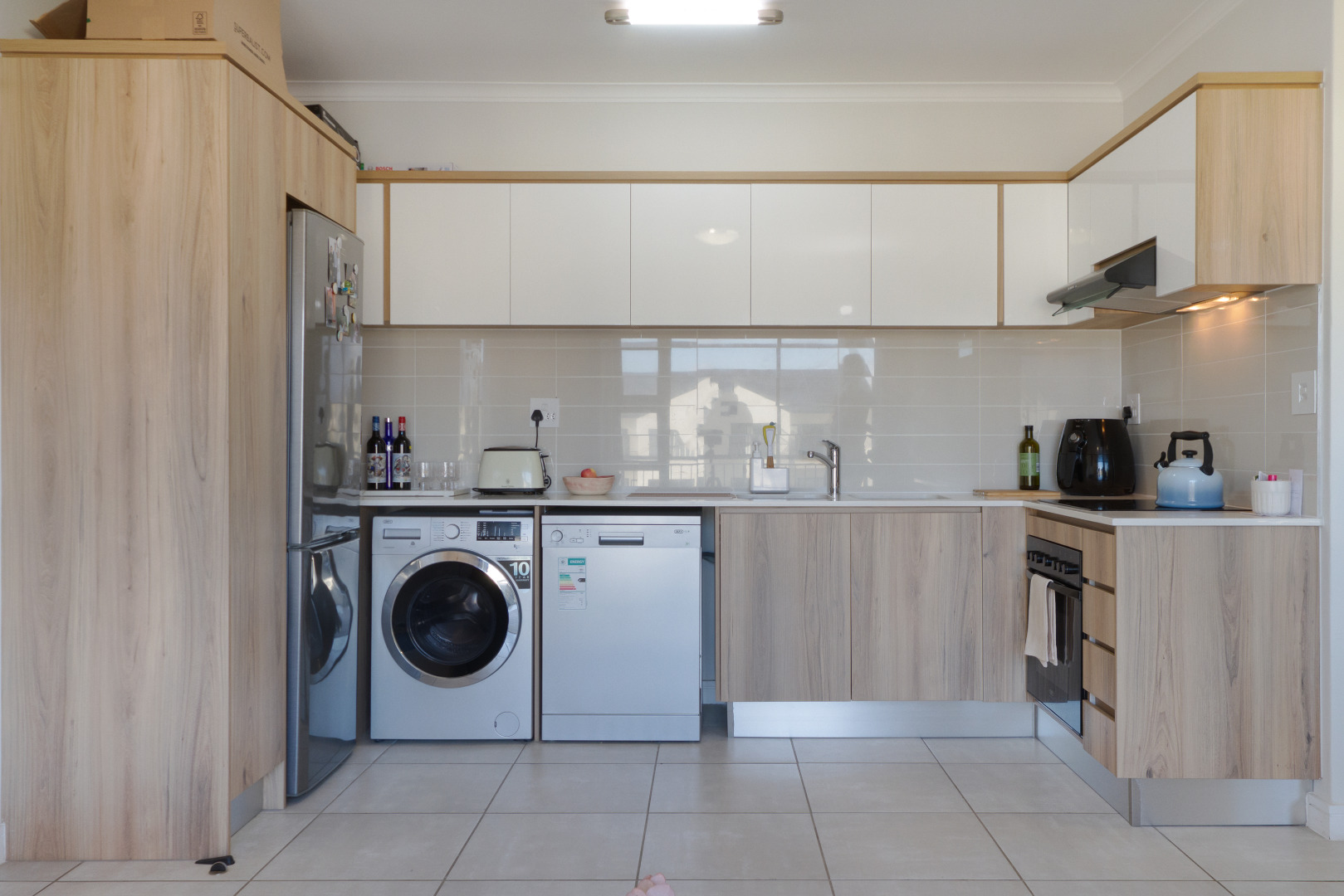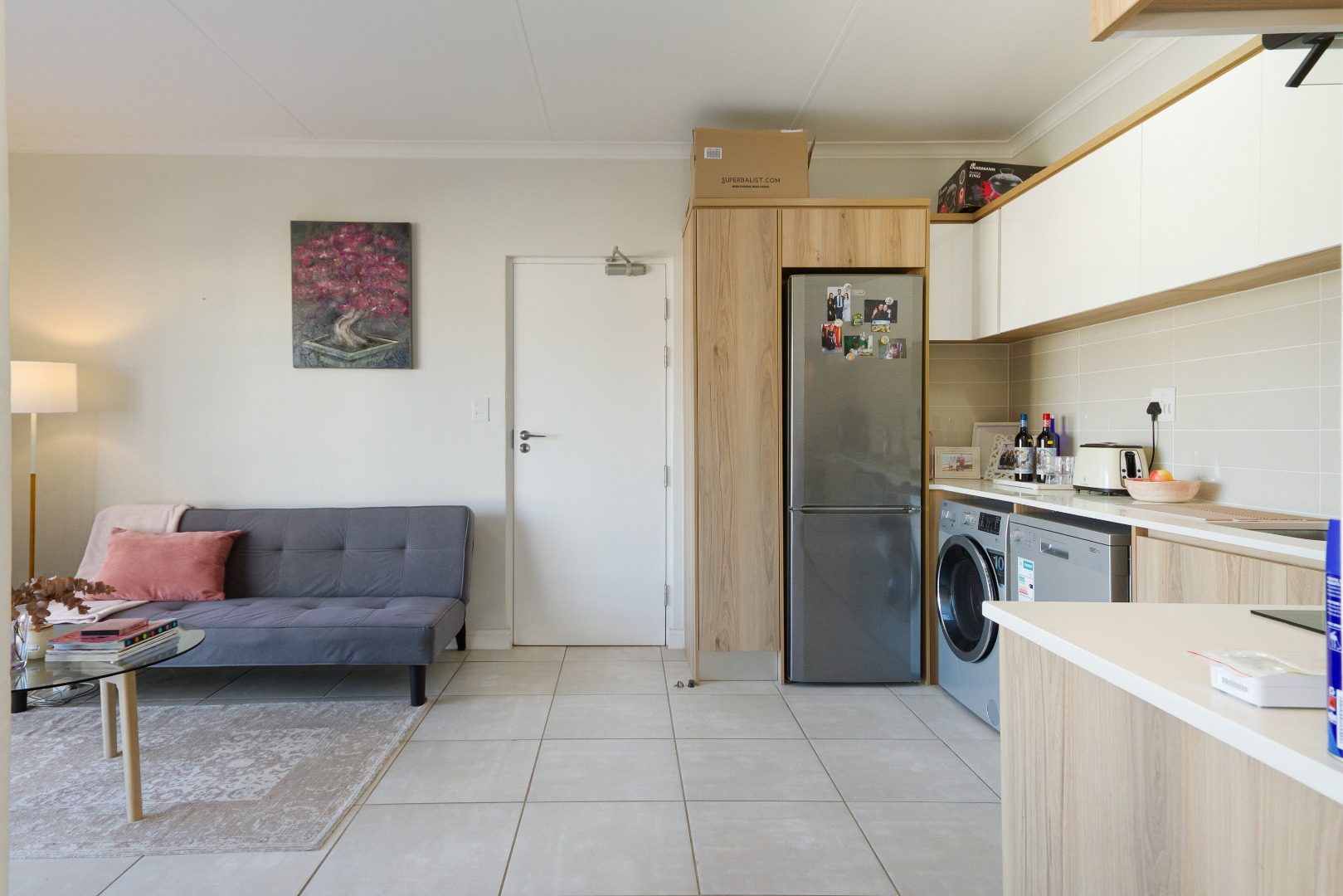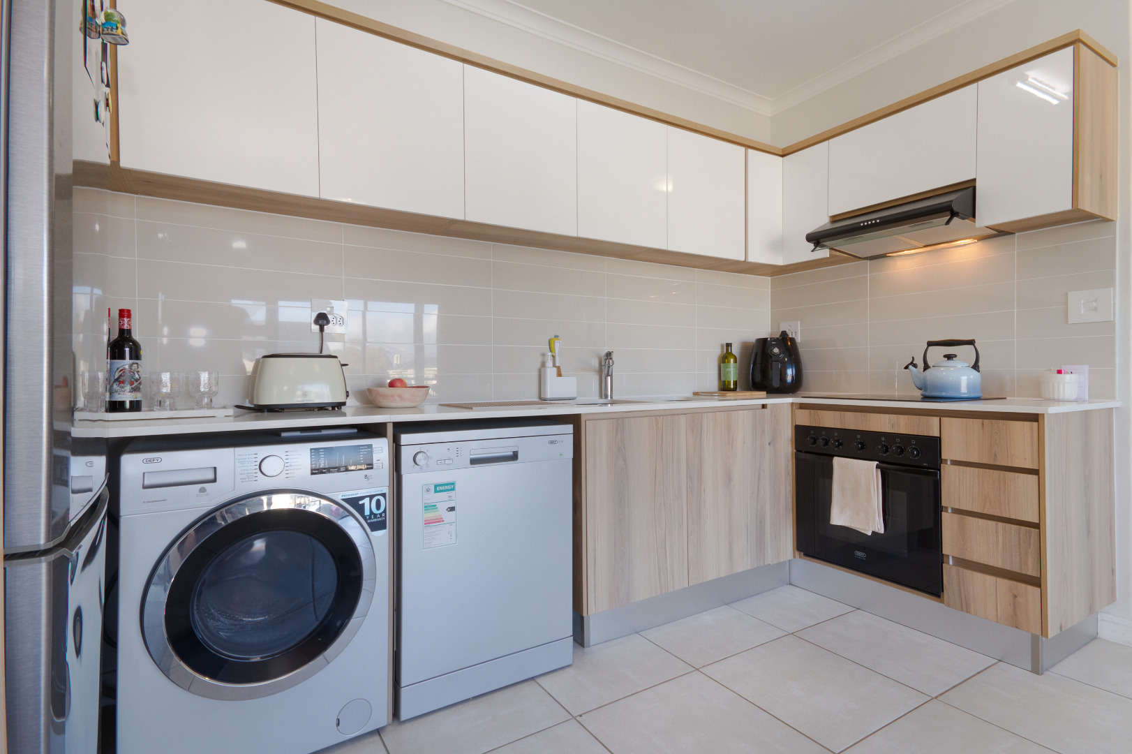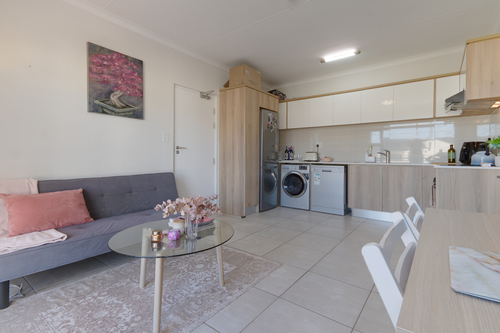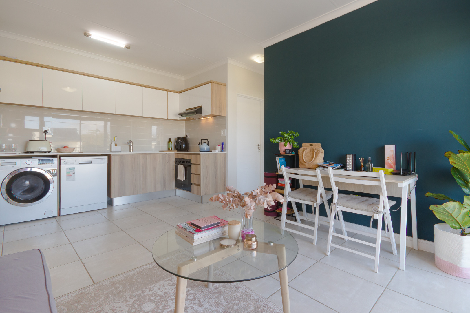 The open plan living area is spacious and flows to the kitchen that includes a stove, oven, hob, washing machine, dishwasher, fridge and ample cupboard space. The kitchen is fitted with high-quality Caesarstone and Hans Grohe finishes.