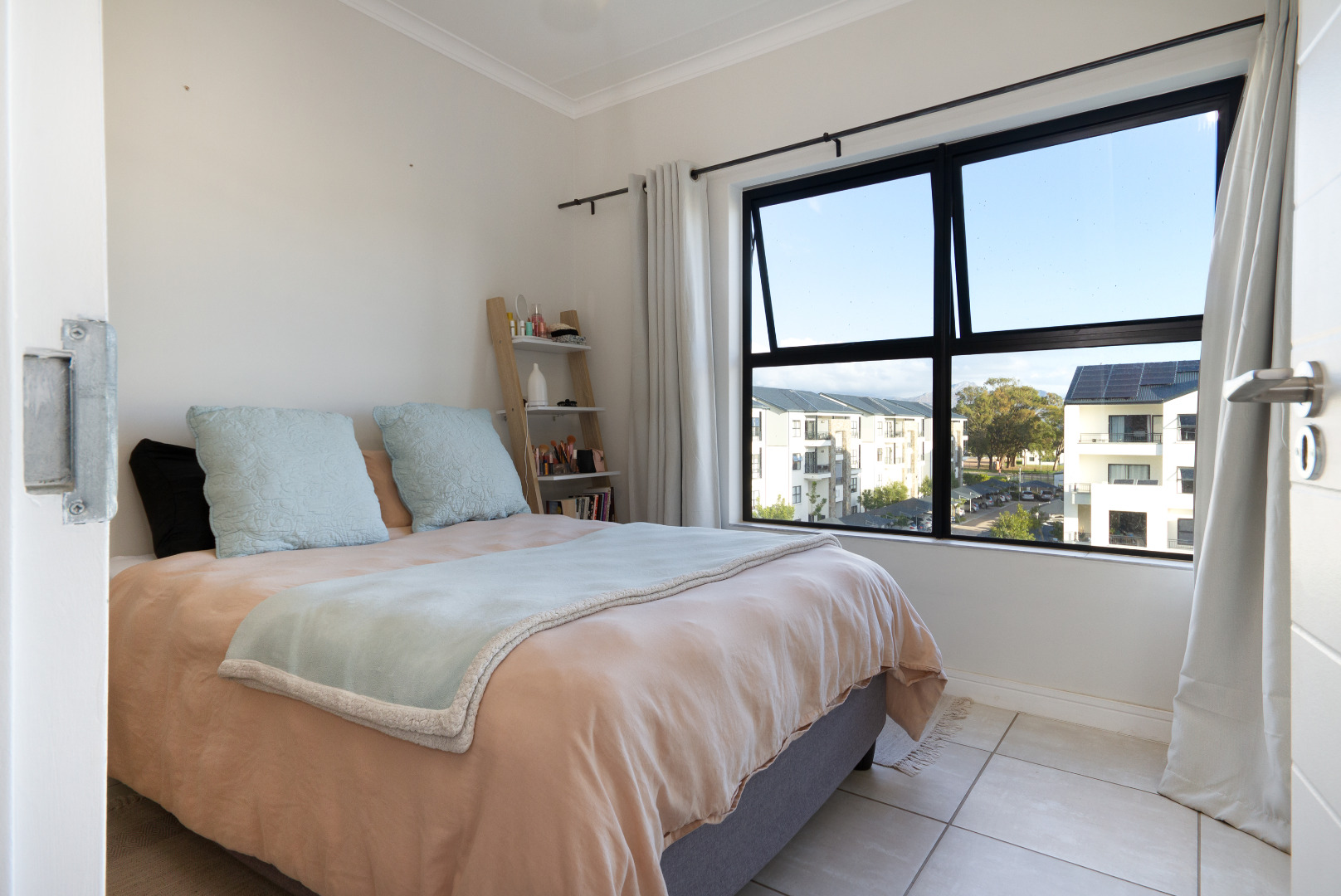 The bedroom also has ample light with its large windows. The bathroom is modern, featuring a shower, basin, and toilet.