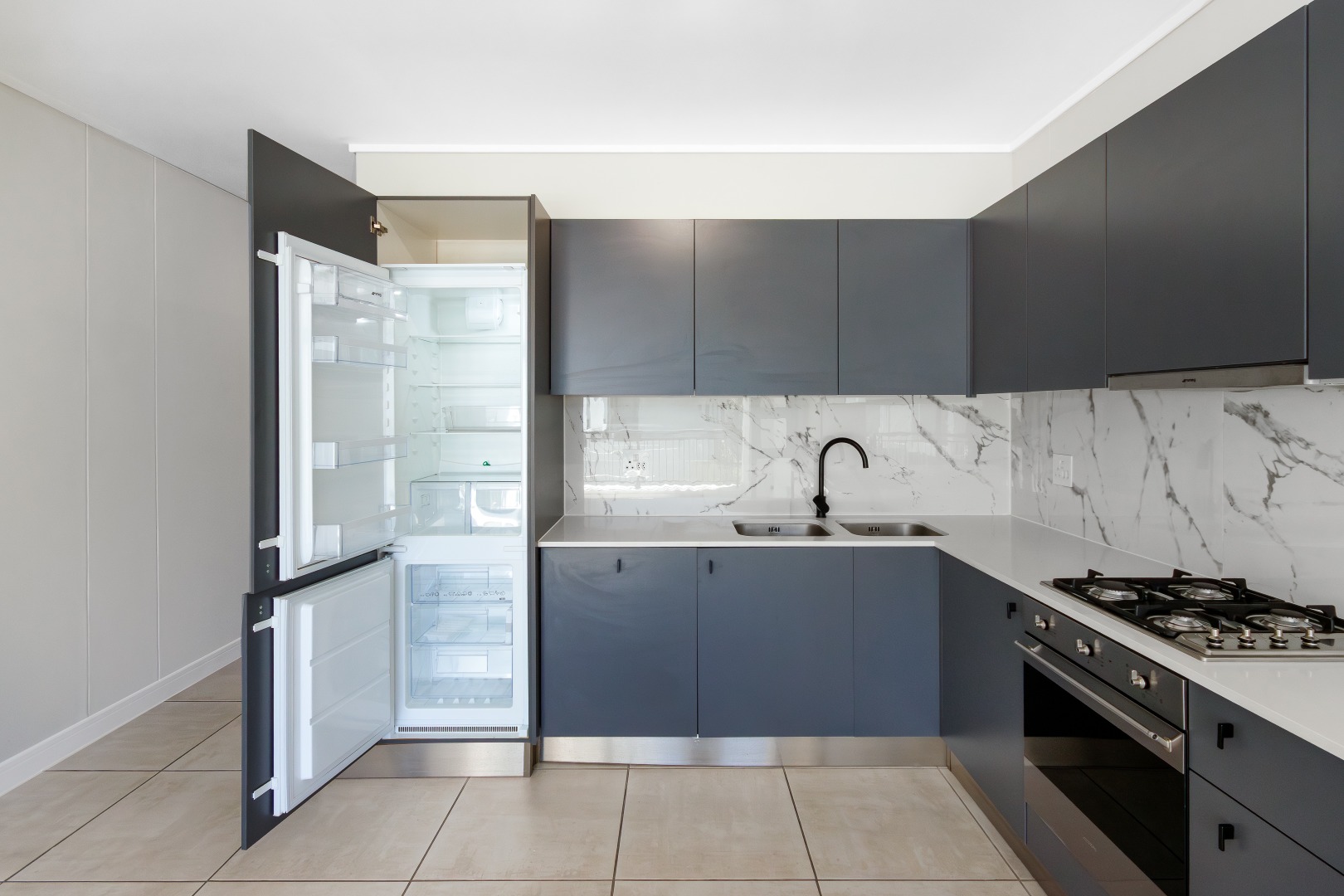 - Kitchen charcoal cabinets and white stone counter tops. With integrated Smeg fridge, washing machine/tumble drier and dishwasher