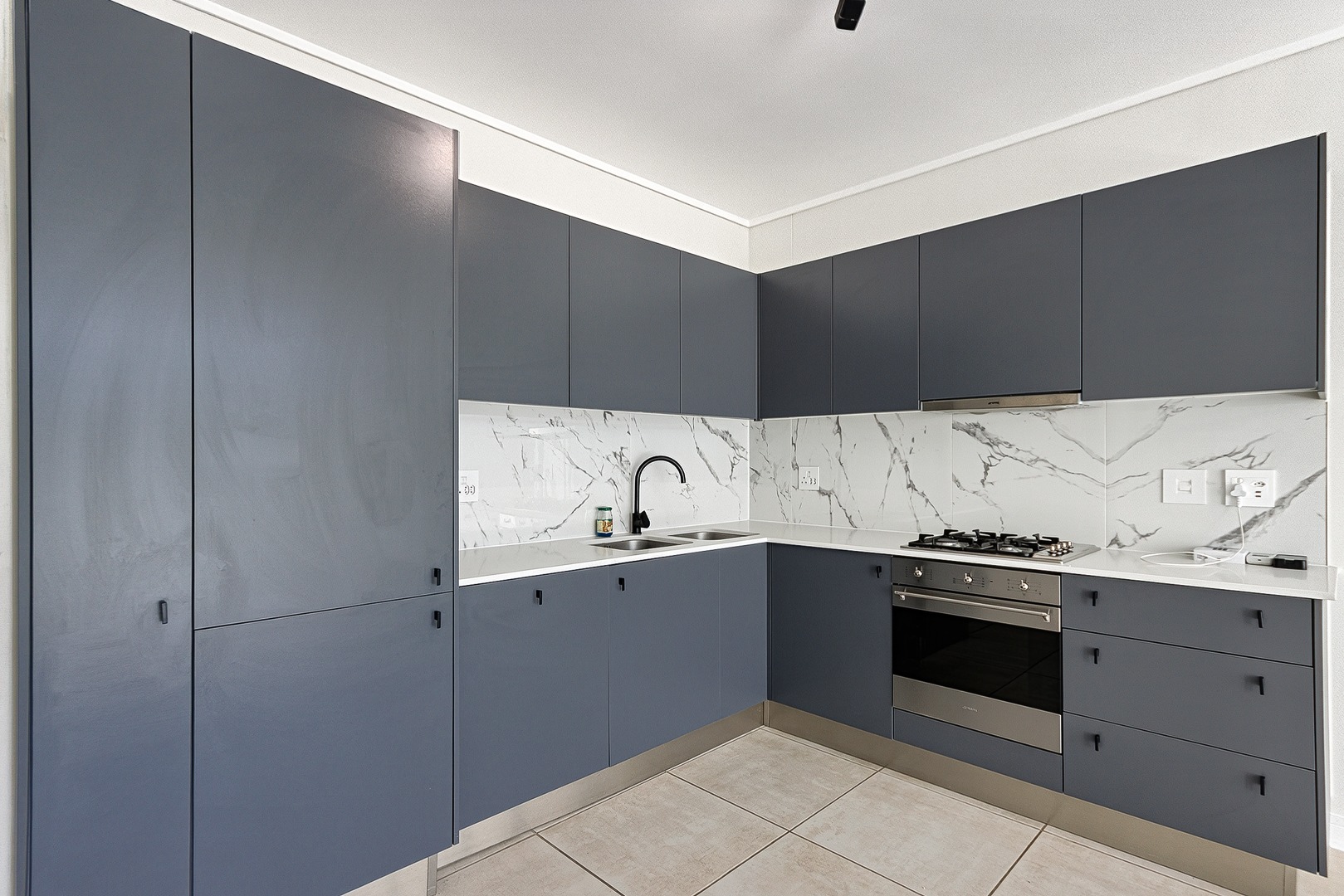 - Kitchen charcoal cabinets and white stone counter tops. With integrated Smeg fridge, washing machine/tumble drier and dishwasher