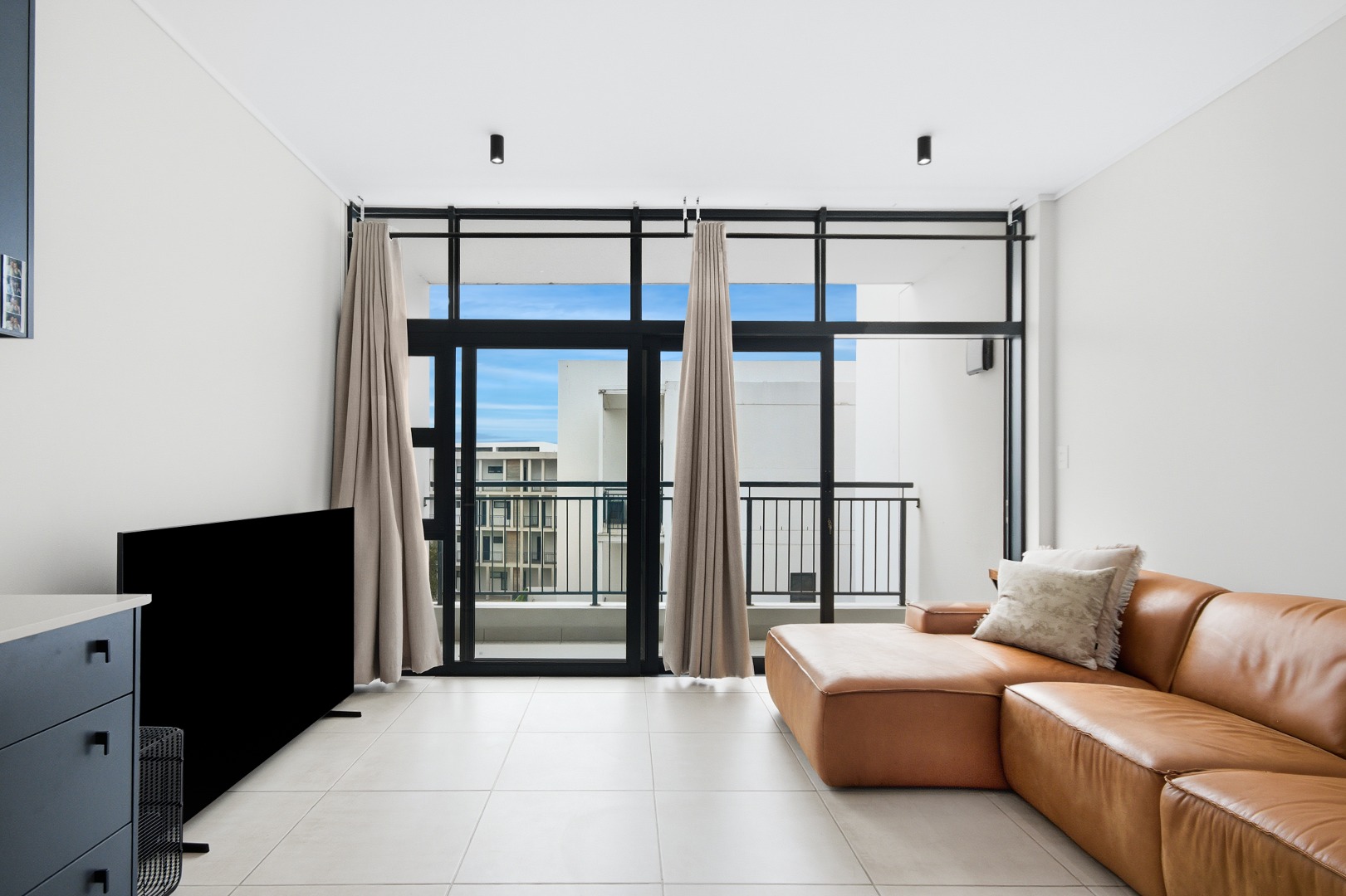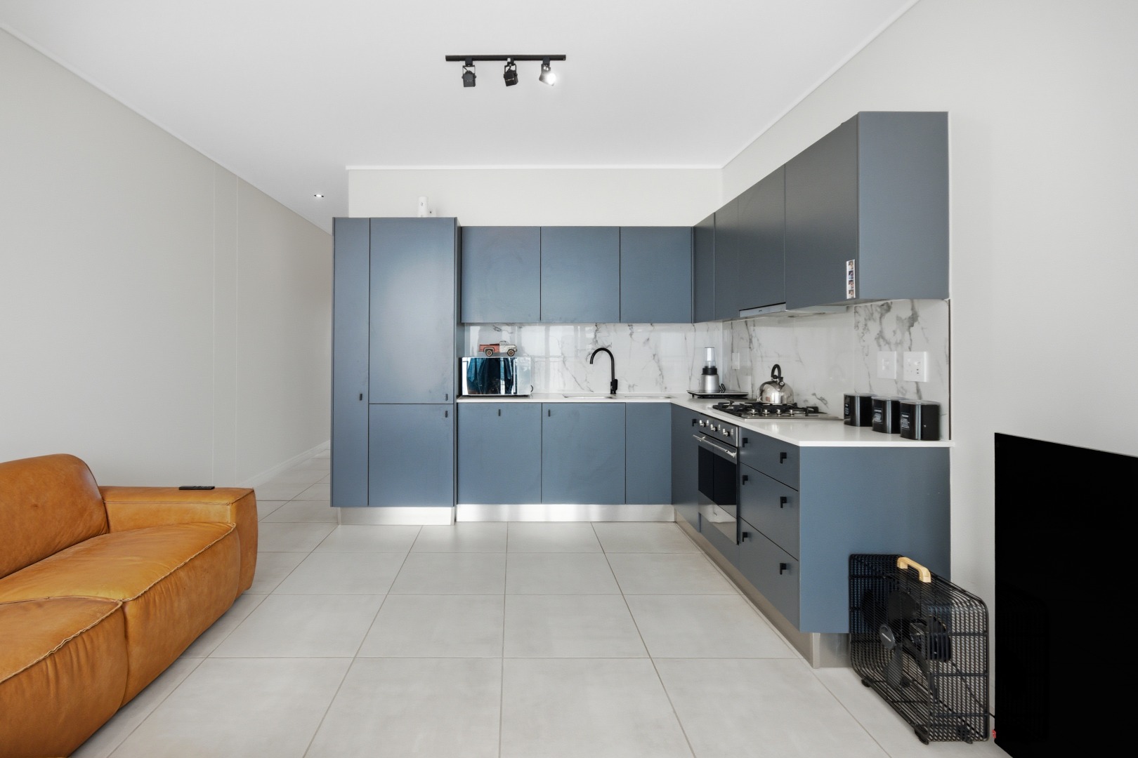 The apartment offers a bright and sunny open-plan layout, featuring a spacious modern kitchen that flows seamlessly into the dining and living area, with direct access to a balcony.
