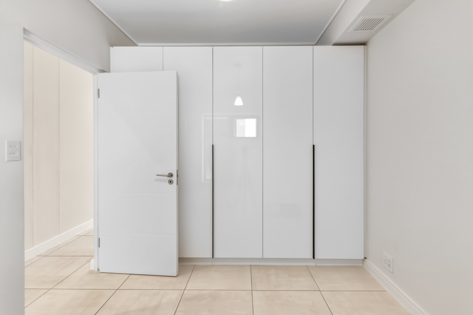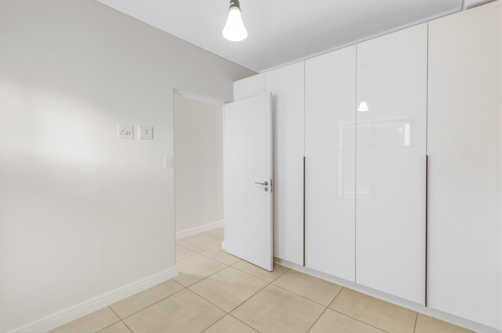 The bedroom is well-sized with built-in cupboards and comfortably fits a queen-size bed.