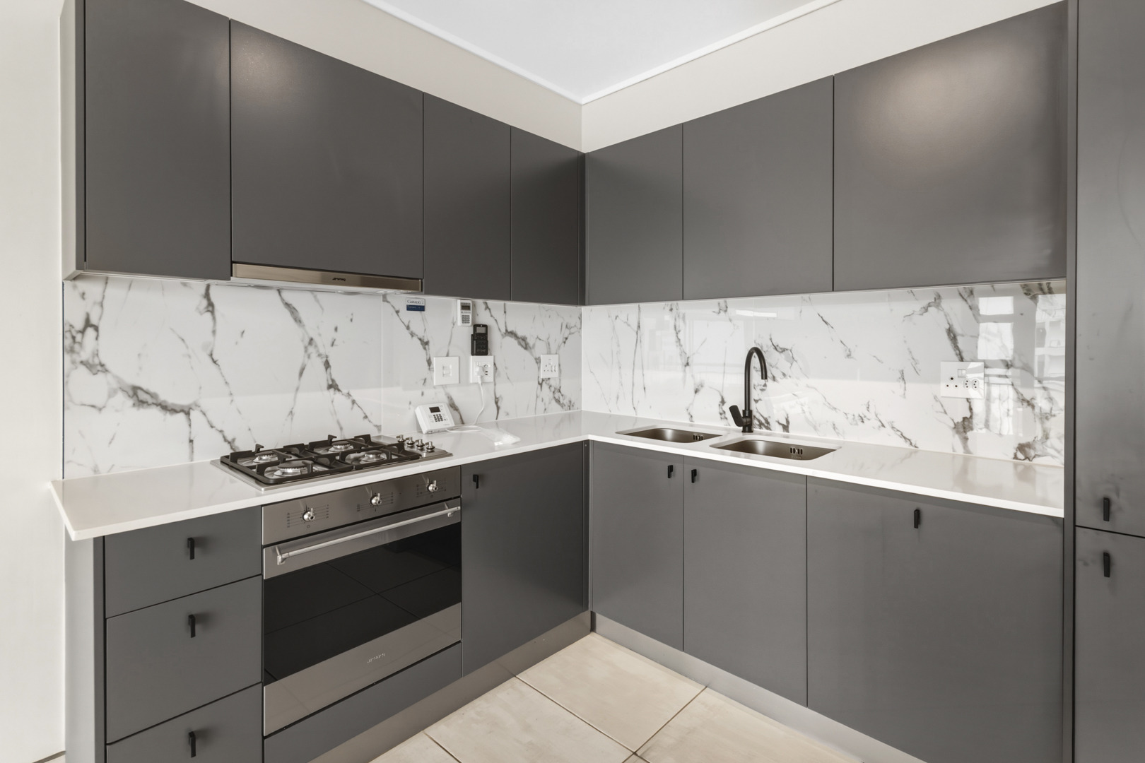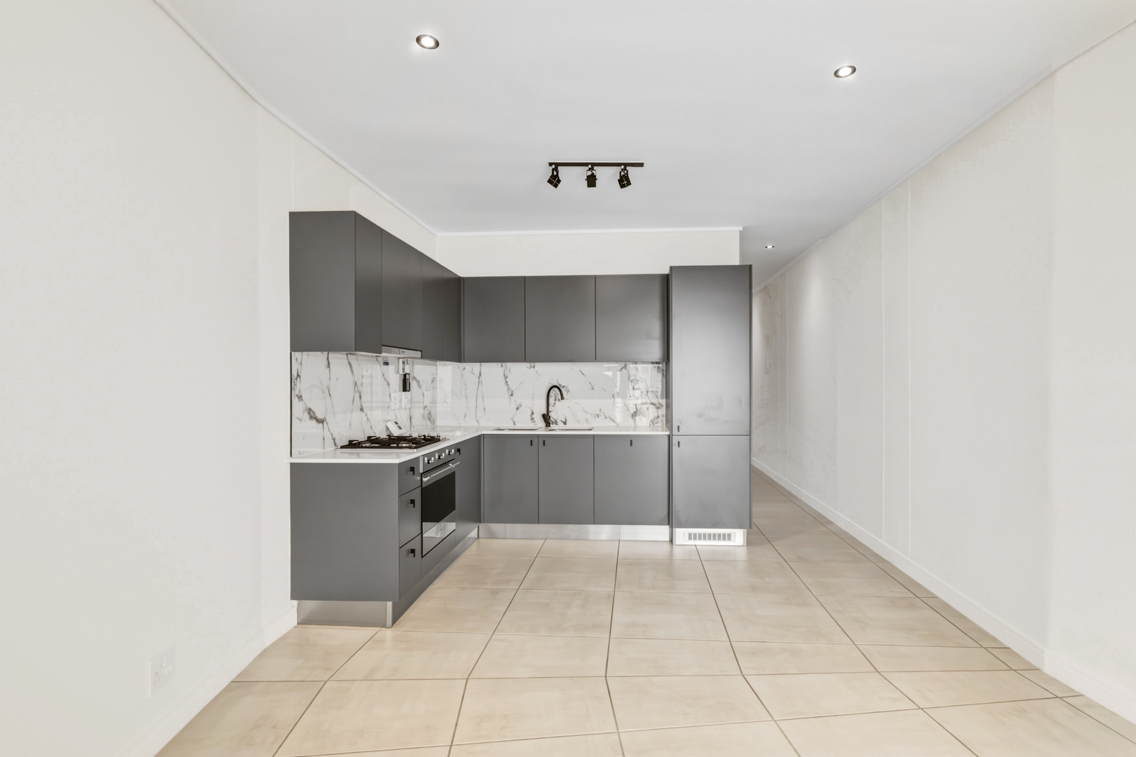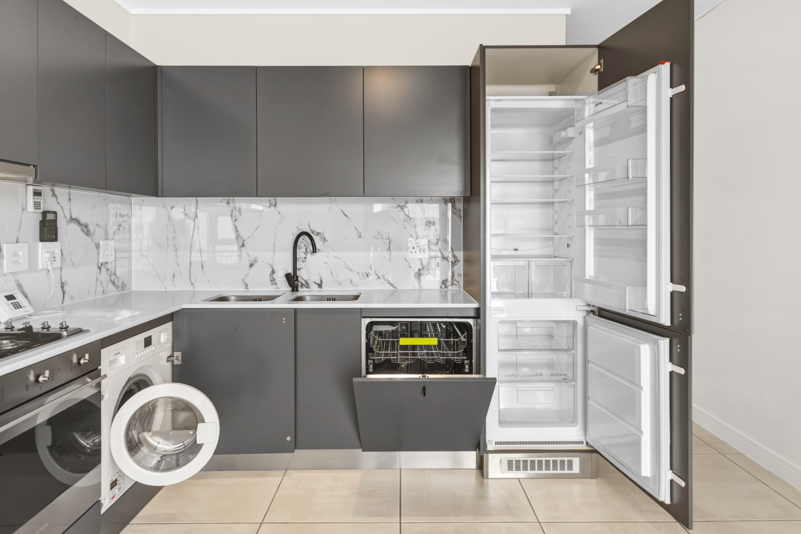The kitchen is fitted with grey cupboards and white engineered stone tops, and includes a gas hob, extractor fan, and electric oven. Integrated appliances (fridge, washing machine/tumble dryer combo, and dishwasher) are included, which keeps things clean and uncluttered.