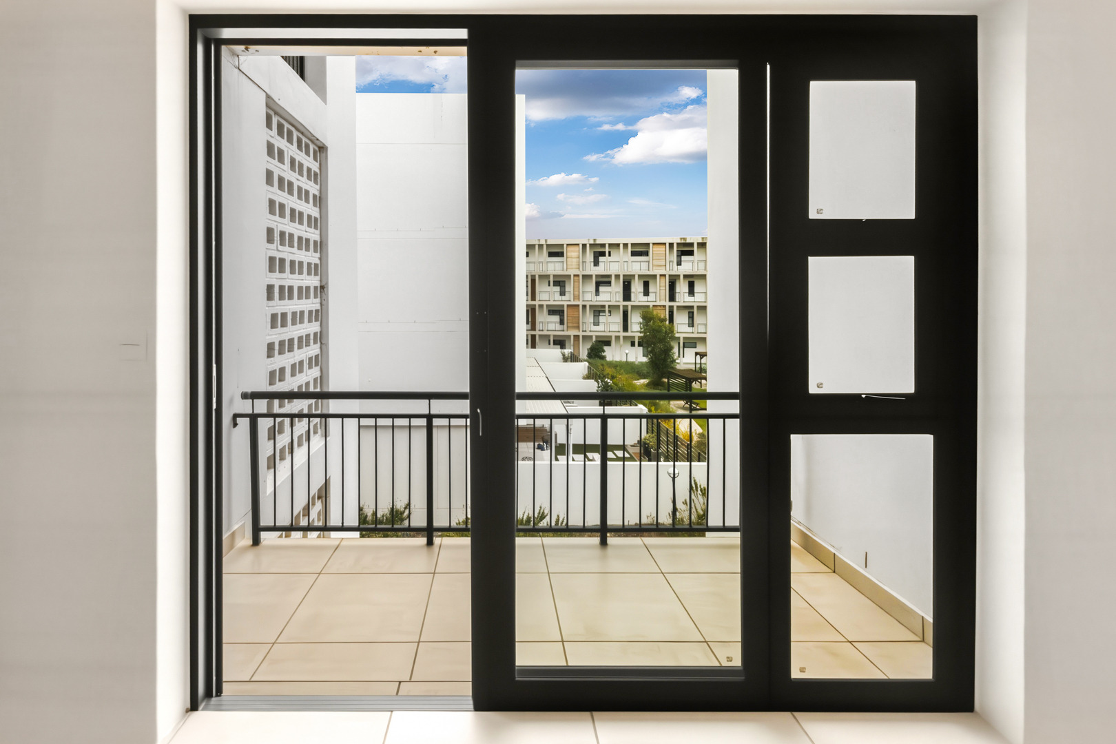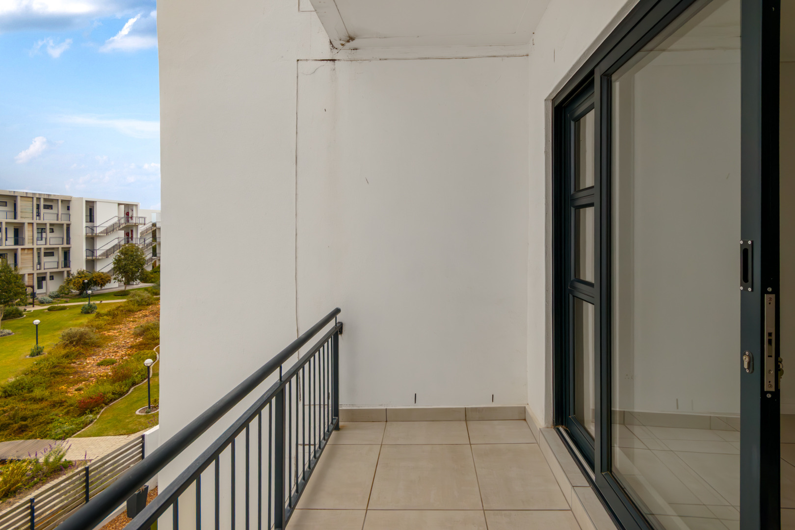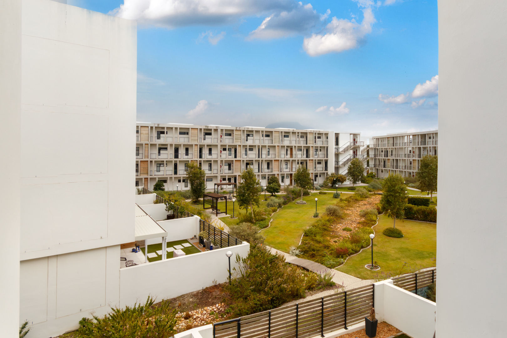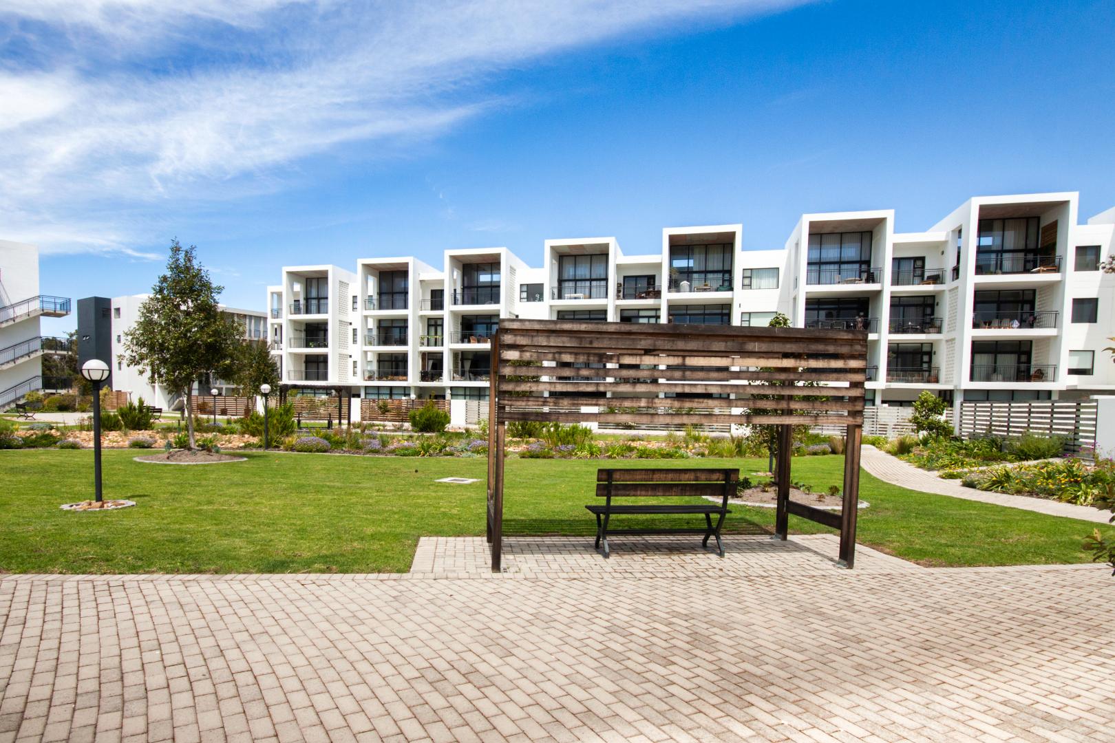 This 47 sqm apartment sits on the north-facing side of Paardevlei Lifestyle Estate, which makes a noticeable difference to how the space feels — warm, light, and easy to live in throughout the day.