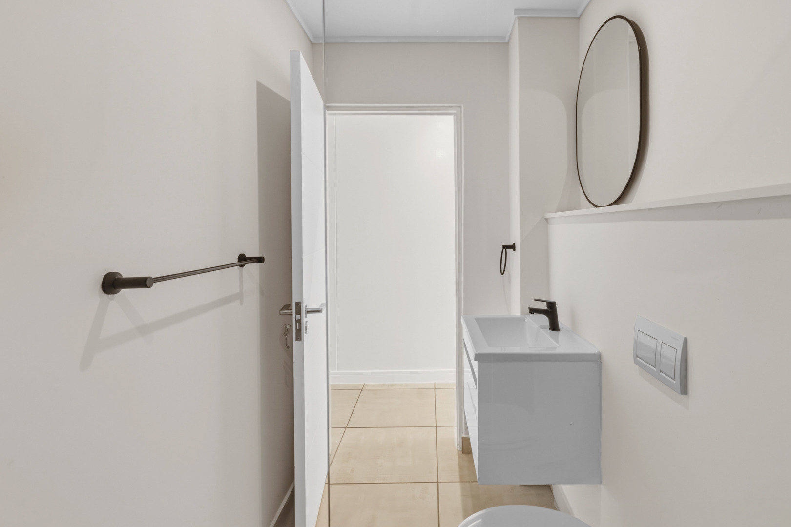 The bathroom is neatly finished with a shower, basin, and toilet — straightforward and functional.