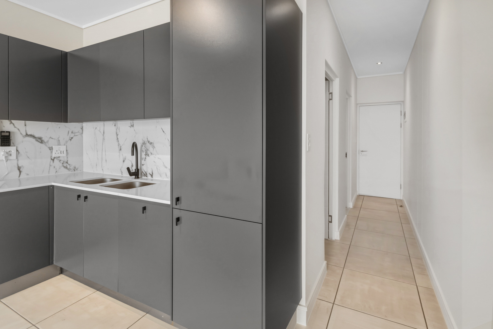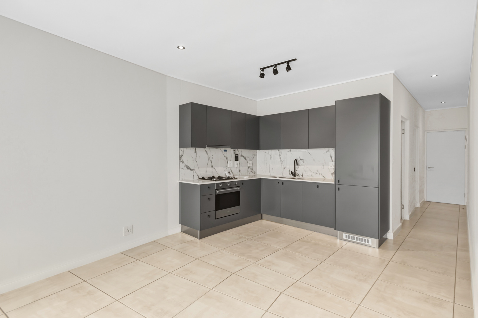 The kitchen is fitted with grey cupboards and white engineered stone tops, and includes a gas hob, extractor fan, and electric oven. Integrated appliances (fridge, washing machine/tumble dryer combo, and dishwasher) are included, which keeps things clean and uncluttered.