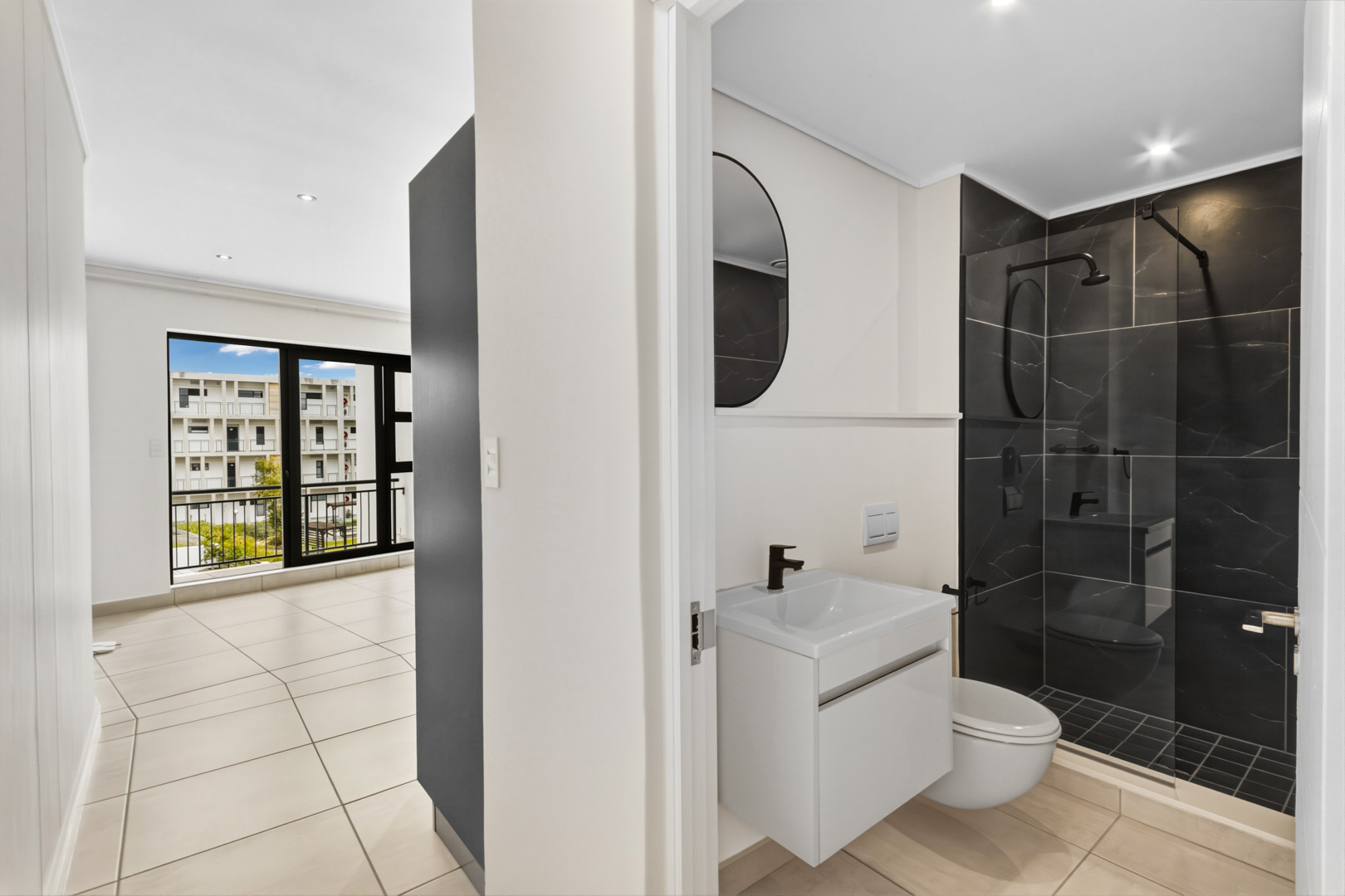 This 47 sqm apartment sits on the north-facing side of Paardevlei Lifestyle Estate, which makes a noticeable difference to how the space feels — warm, light, and easy to live in throughout the day.