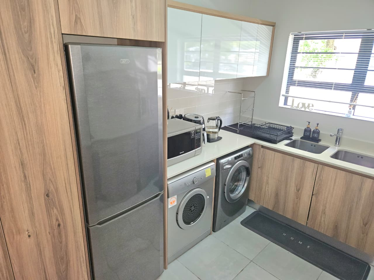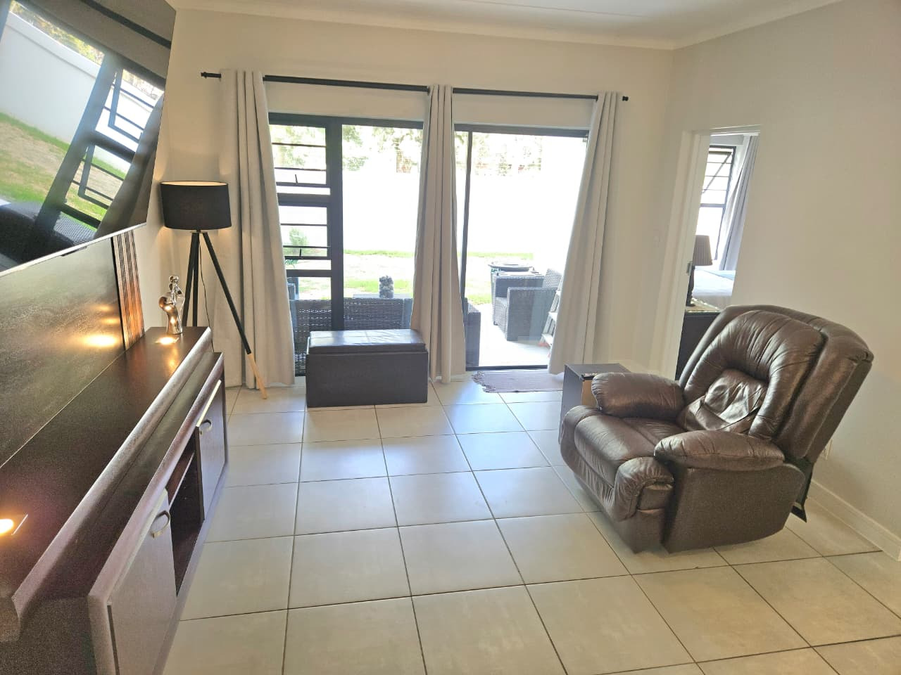 The apartment has beautiful finishes throughout and is open plan living from the kitchen to lounge to patio. The kitchen is fitted with Defy appliances such as a washer/tumble dryer combo, dishwasher and fridge. The 3 bedrooms are spacious offering enough cupboard space in all the rooms and the main bedroom having a en-suite bathroom consisting of a shower, single basin and toilet. The other 2 bedrooms share a family sized bathroom.