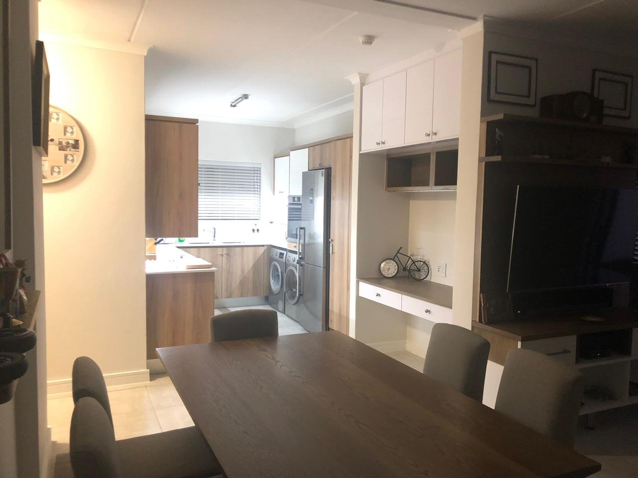 The kitchen is fitted with quality Bosch and Siemens appliances, including an eye-level oven, and is complemented by a built-in study nook with additional cabinetry—ideal for working from home.