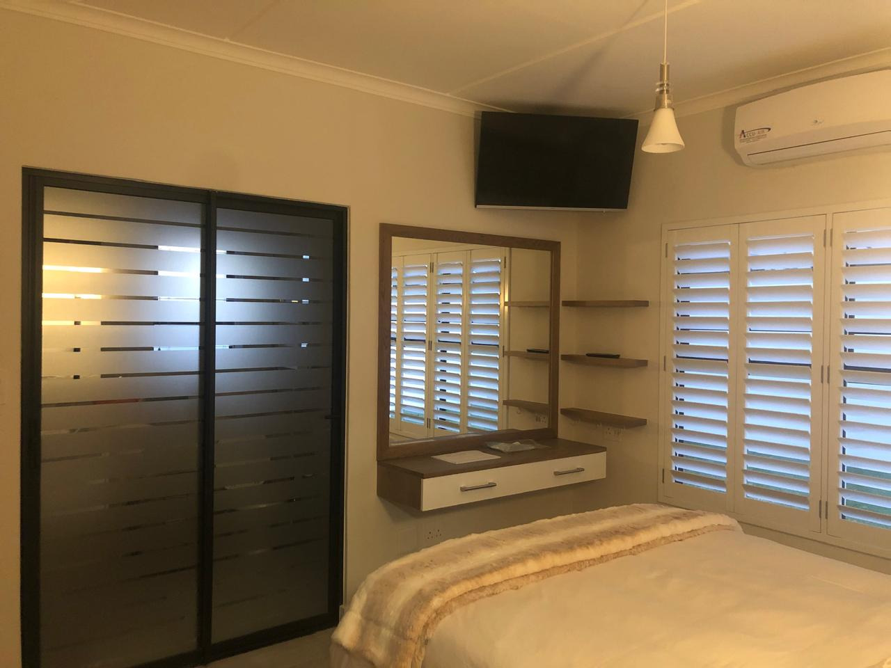 - Main bedroom with shutters, air conditioning, and built-in desk