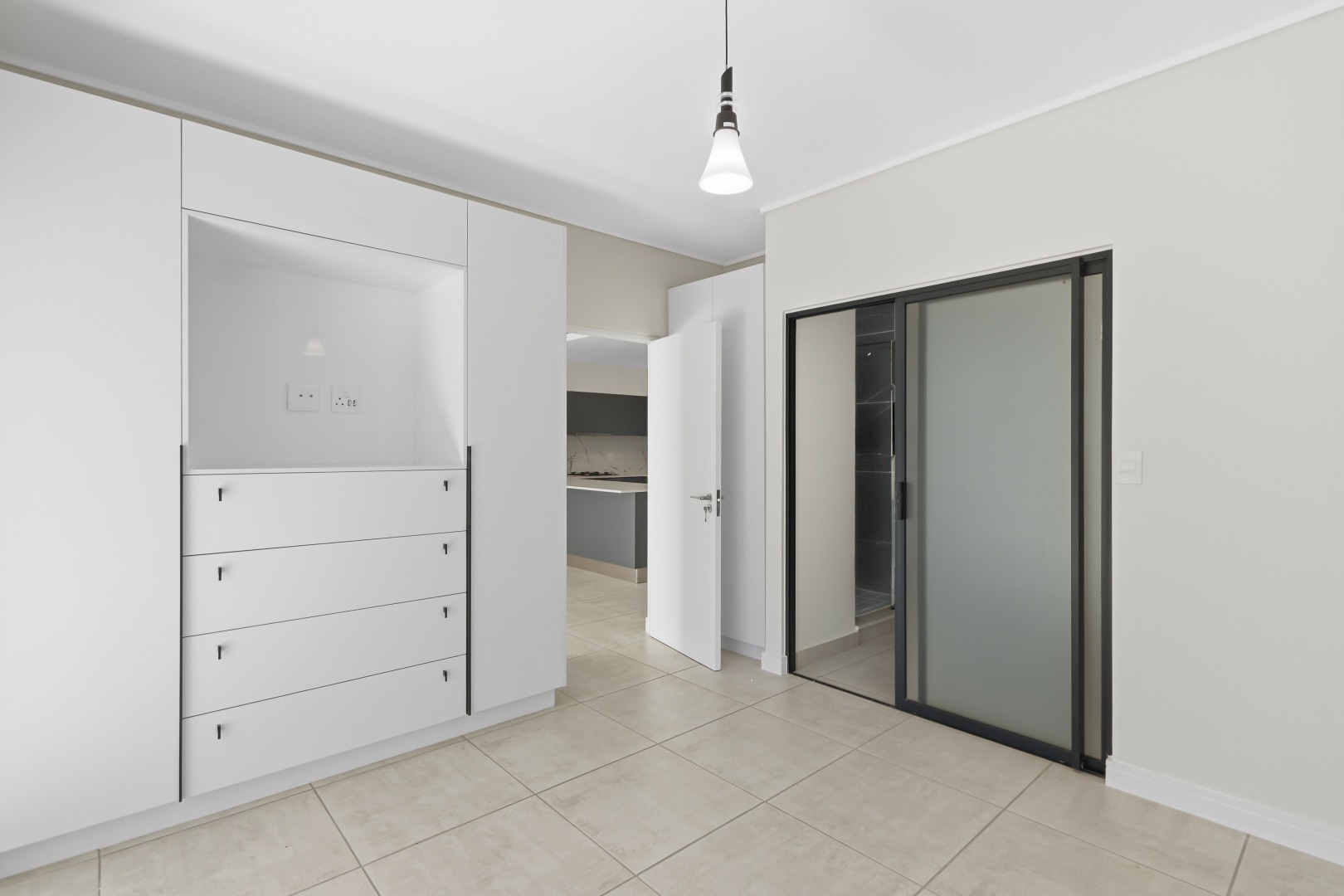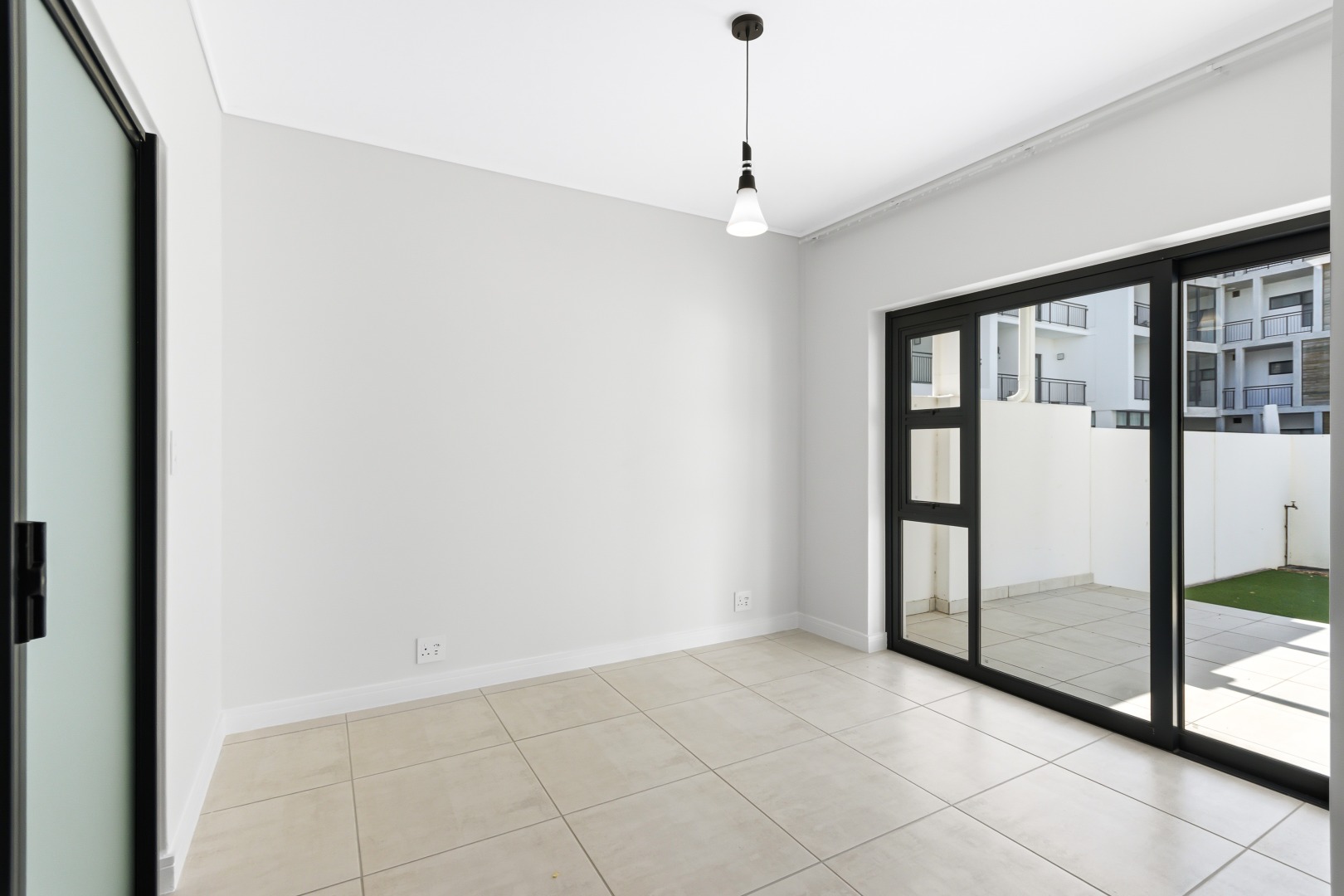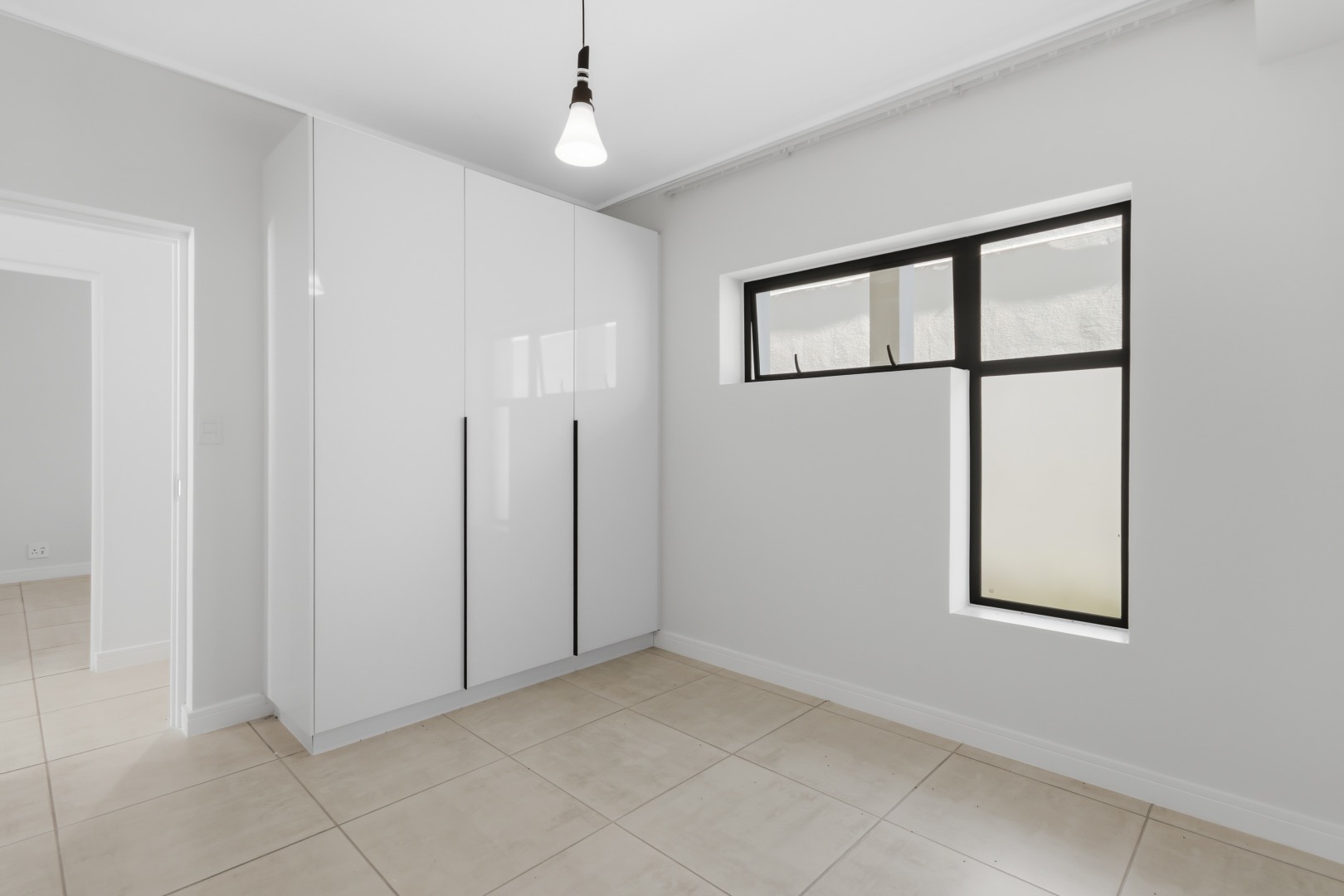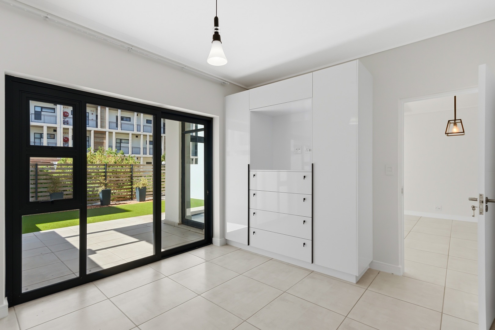 The main bedroom has direct garden access and includes a full en-suite bathroom. The second and third bedrooms are serviced by a modern shared bathroom with a large shower and toilet. All bedrooms offer built-in cupboards, and the apartment is tiled throughout for easy maintenance.