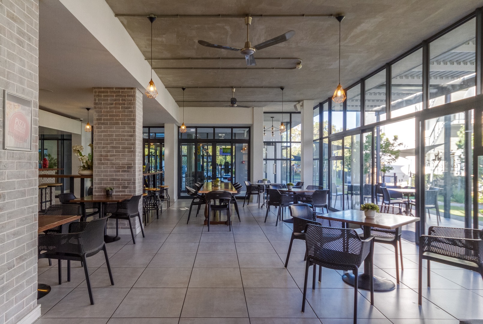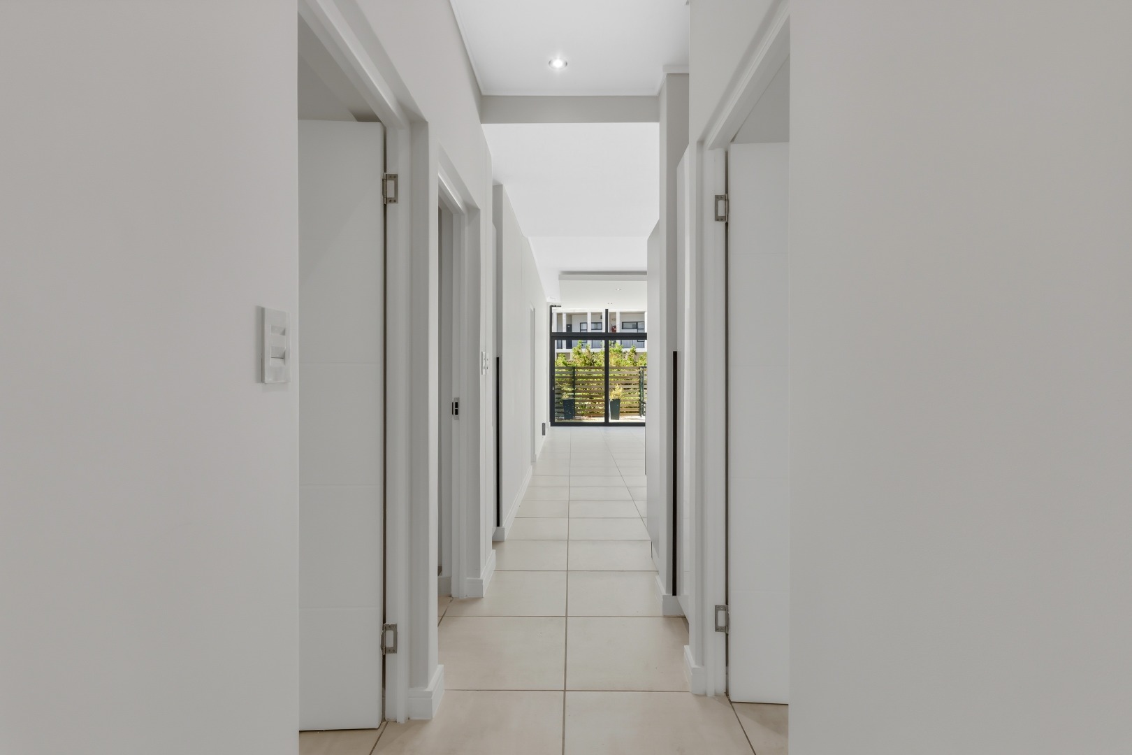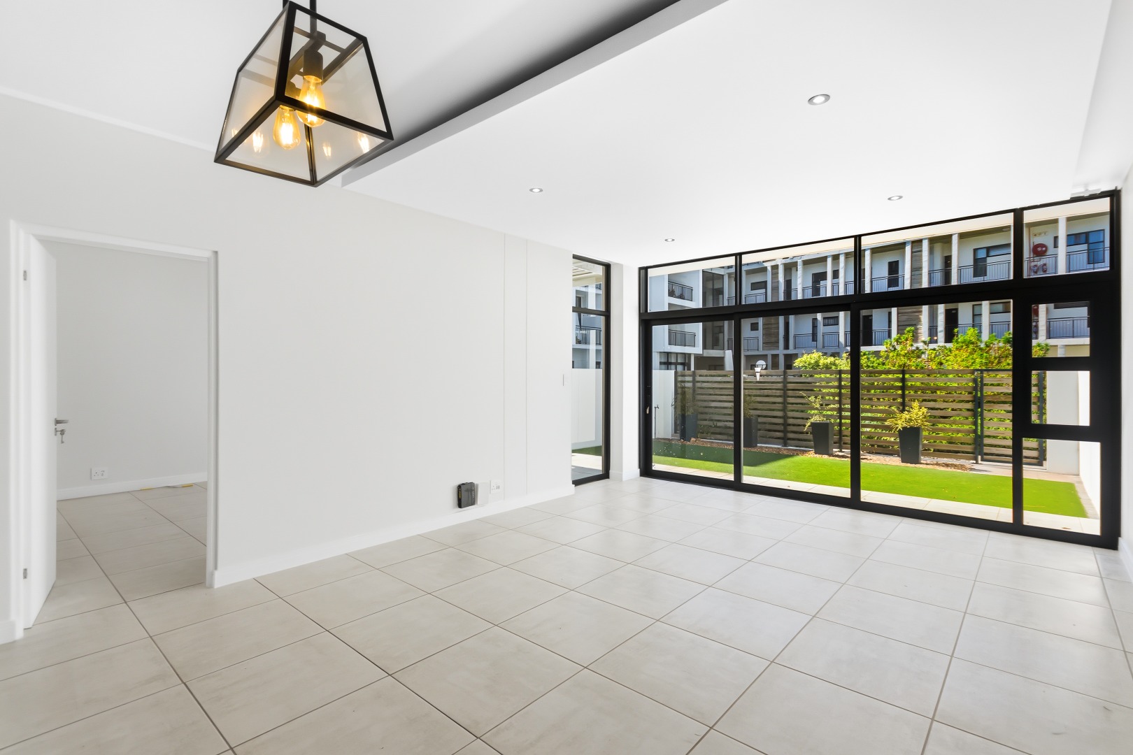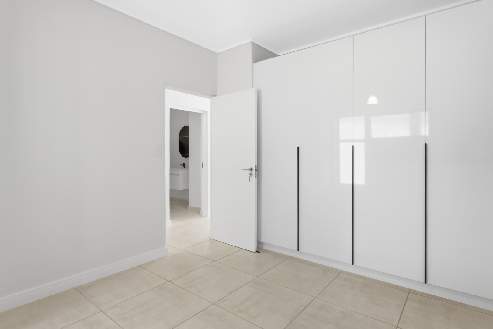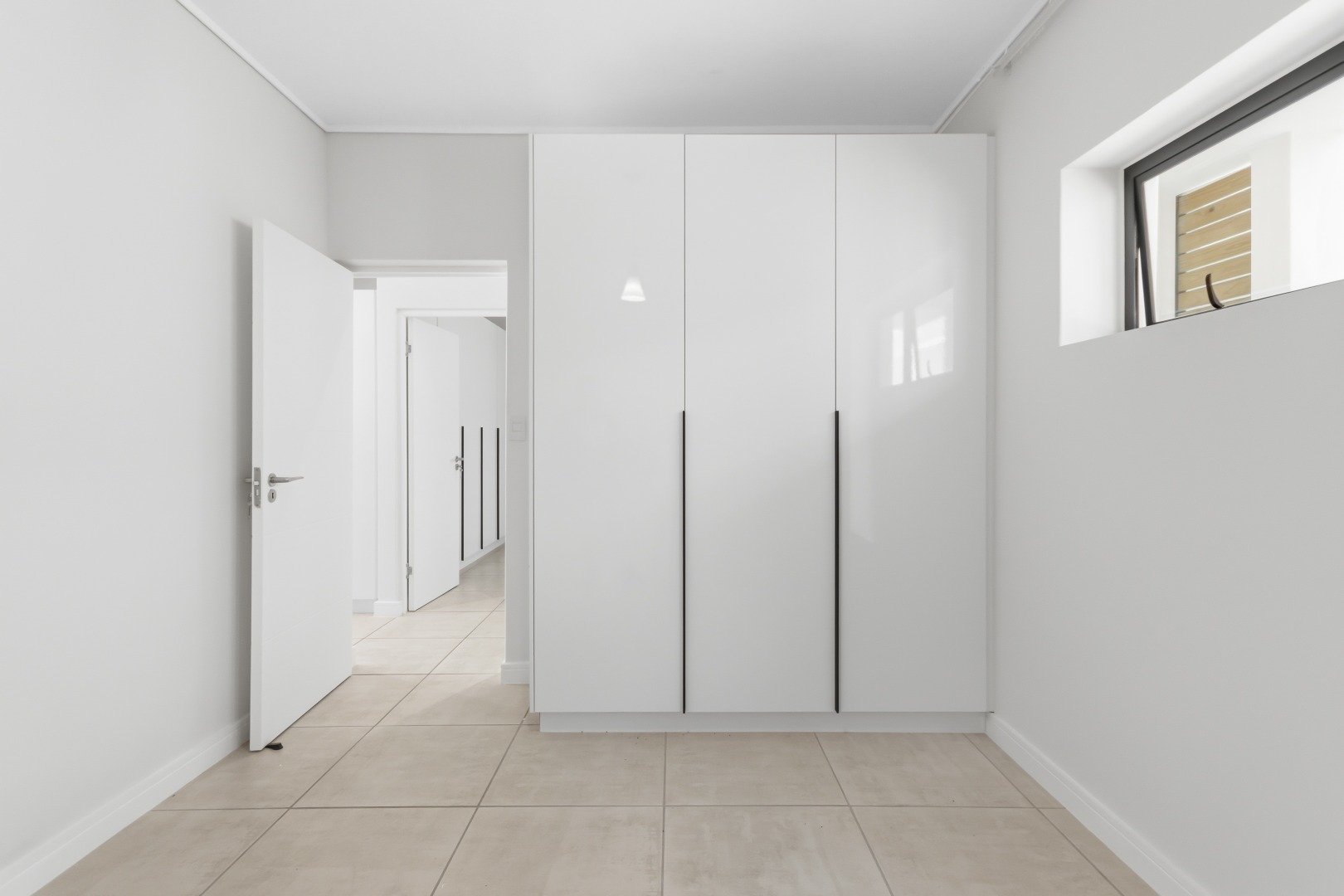 The main bedroom has direct garden access and includes a full en-suite bathroom. The second and third bedrooms are serviced by a modern shared bathroom with a large shower and toilet. All bedrooms offer built-in cupboards, and the apartment is tiled throughout for easy maintenance.