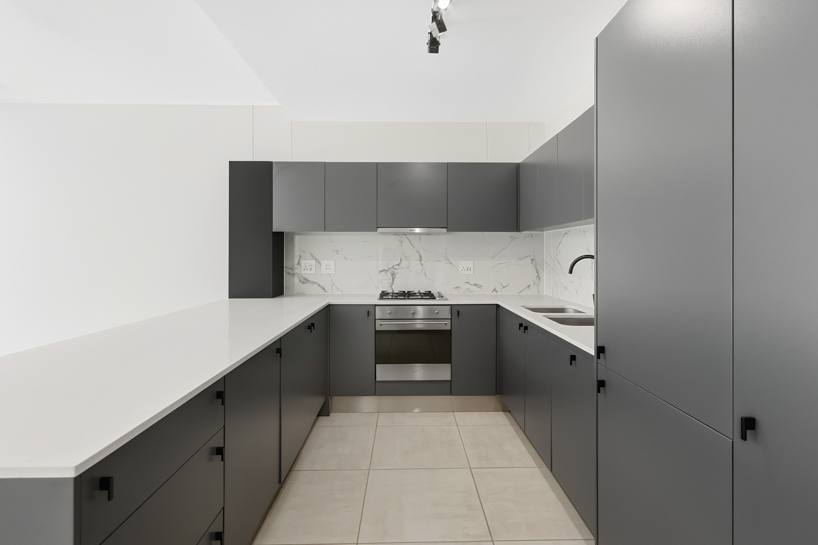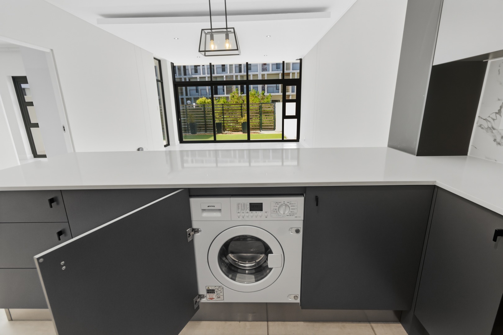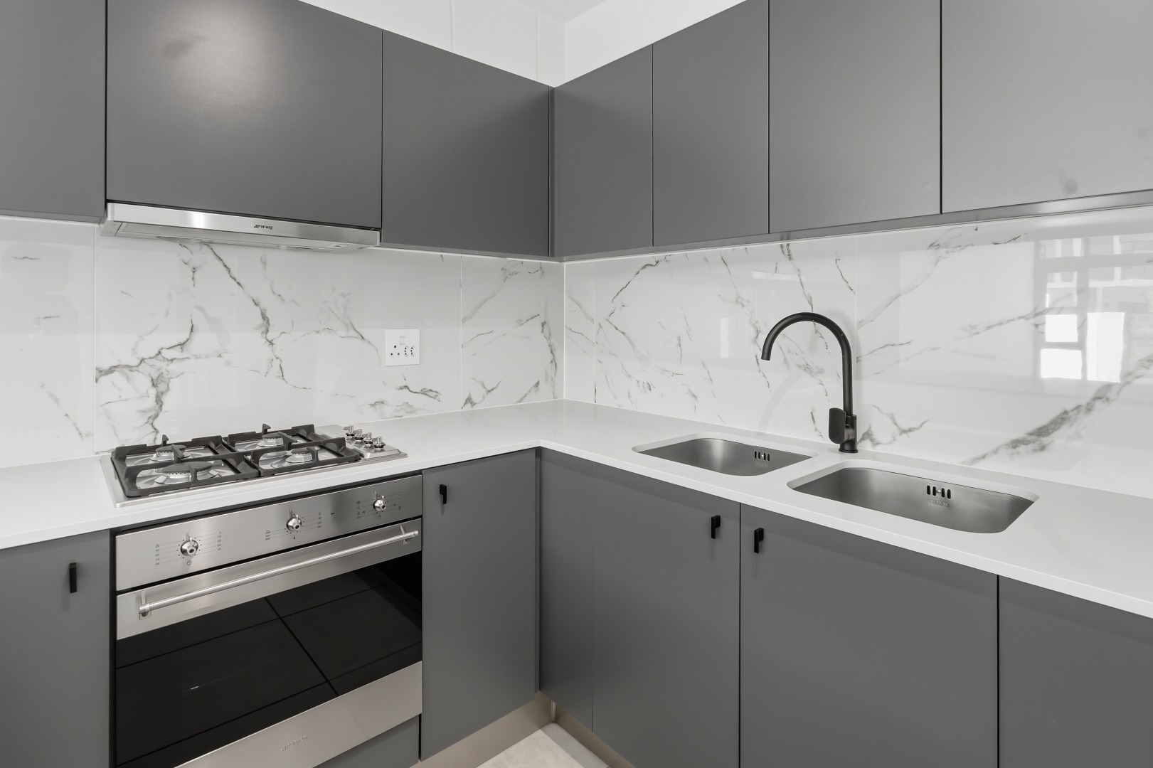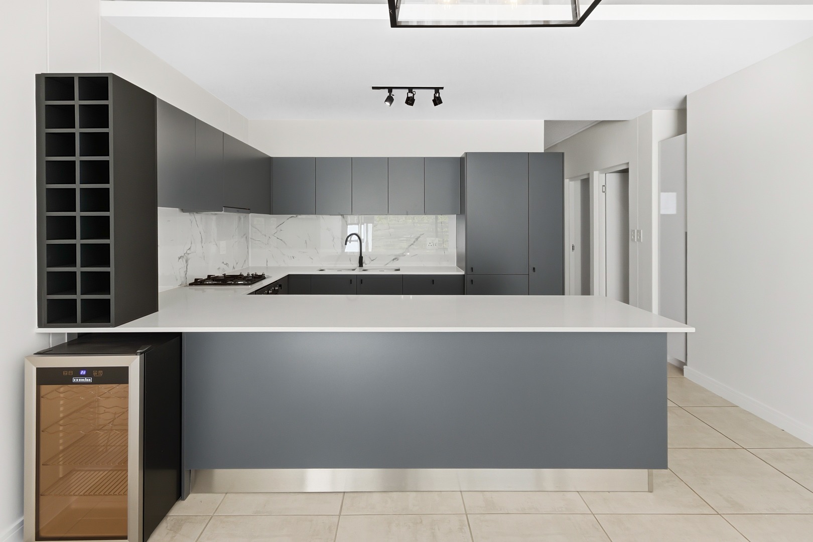 The heart of this home is its sleek, modern kitchen, featuring dark grey handleless cabinetry, pristine white quartz-like countertops, and a stylish marble-effect backsplash. Equipped with integrated Smeg appliances, including a gas hob, oven, extractor fan, and dishwasher, it also offers a double sink with a contemporary black faucet, an integrated wine rack, and a wine cooler. An inviting kitchen island provides additional workspace and a potential breakfast bar, complemented by ample storage and an integrated refrigerator.