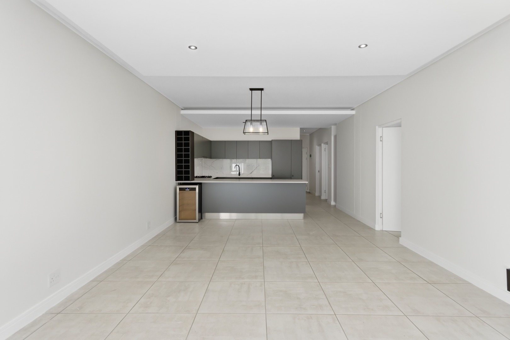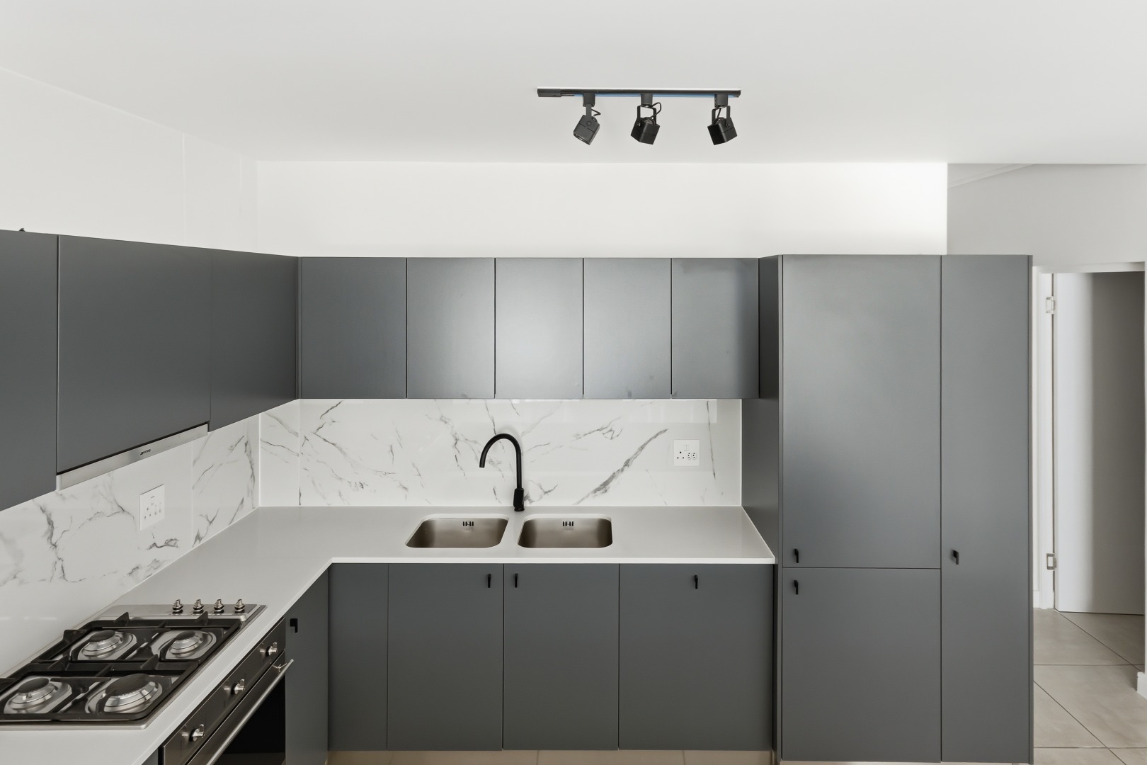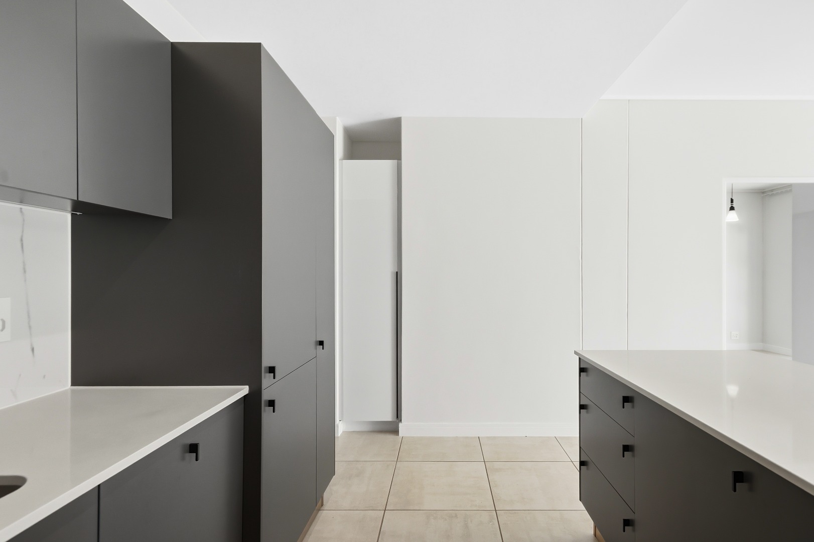 The heart of this home is its sleek, modern kitchen, featuring dark grey handleless cabinetry, pristine white quartz-like countertops, and a stylish marble-effect backsplash. Equipped with integrated Smeg appliances, including a gas hob, oven, extractor fan, and dishwasher, it also offers a double sink with a contemporary black faucet, an integrated wine rack, and a wine cooler. An inviting kitchen island provides additional workspace and a potential breakfast bar, complemented by ample storage and an integrated refrigerator.