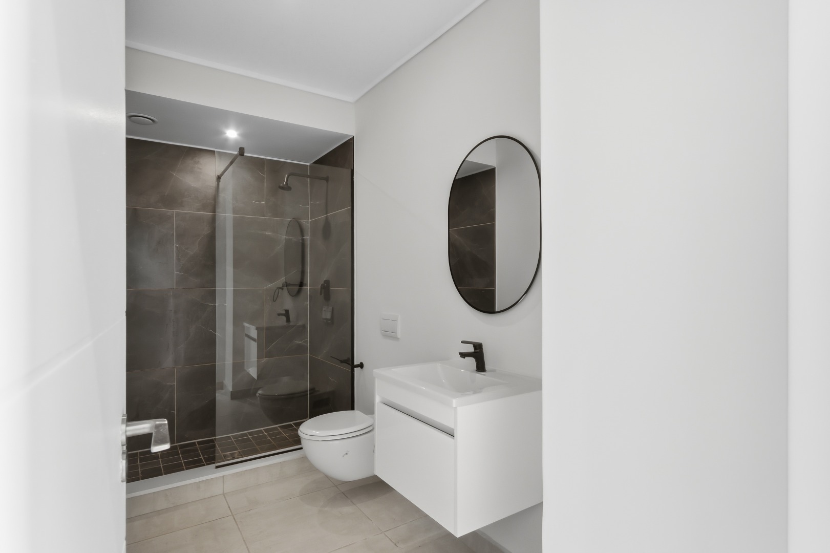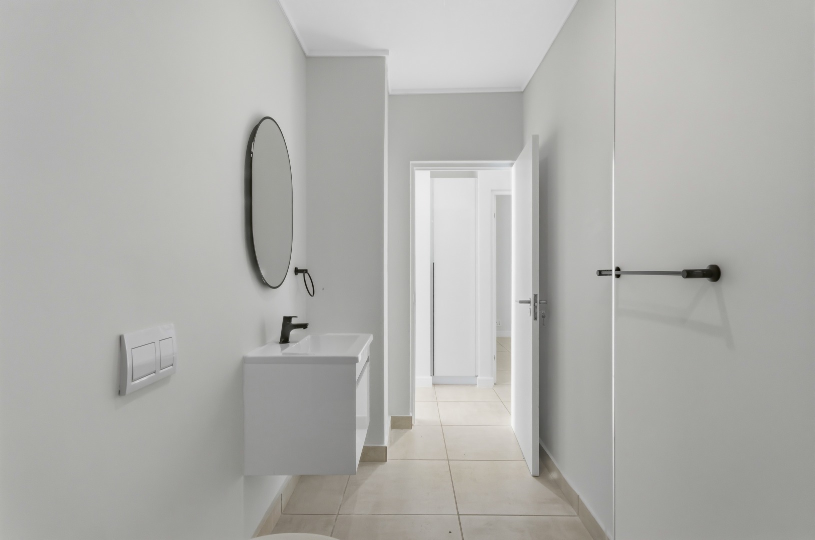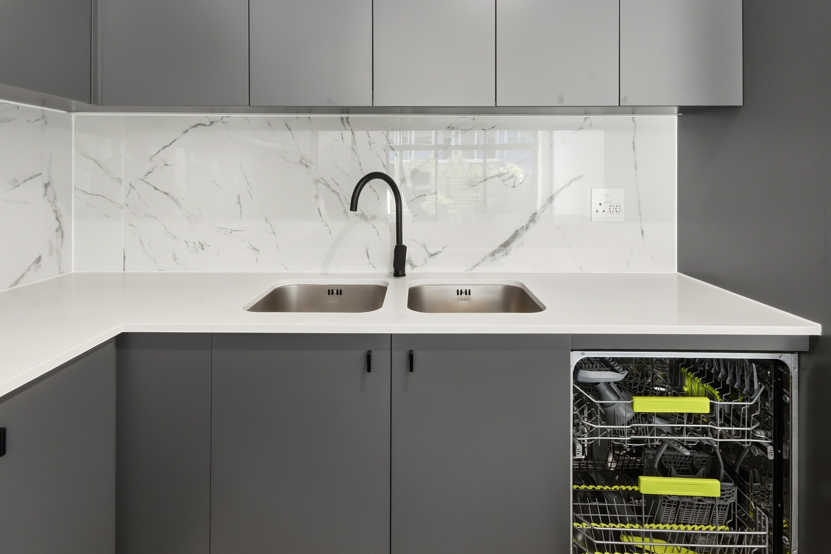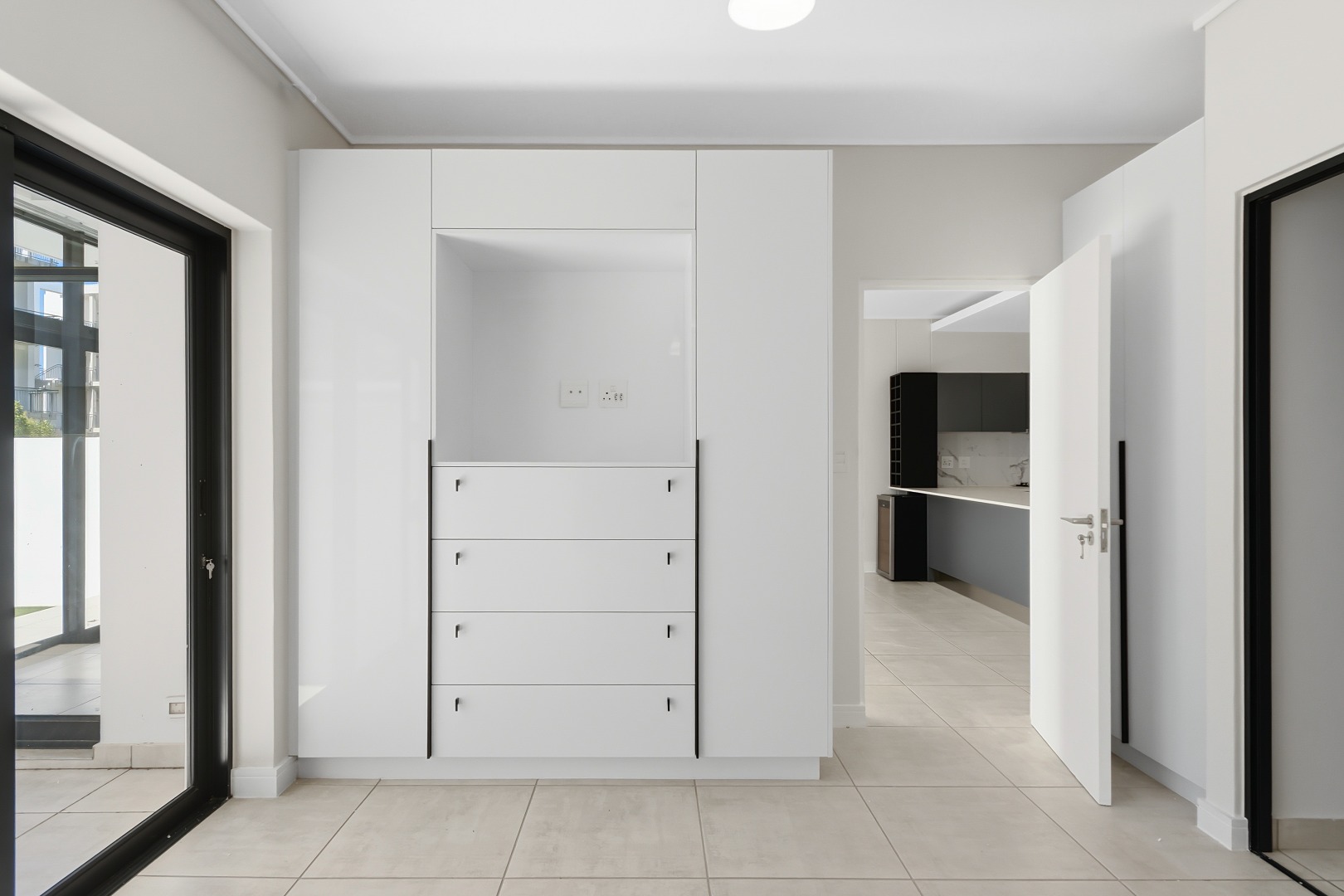 The heart of this home is its sleek, modern kitchen, featuring dark grey handleless cabinetry, pristine white quartz-like countertops, and a stylish marble-effect backsplash. Equipped with integrated Smeg appliances, including a gas hob, oven, extractor fan, and dishwasher, it also offers a double sink with a contemporary black faucet, an integrated wine rack, and a wine cooler. An inviting kitchen island provides additional workspace and a potential breakfast bar, complemented by ample storage and an integrated refrigerator.