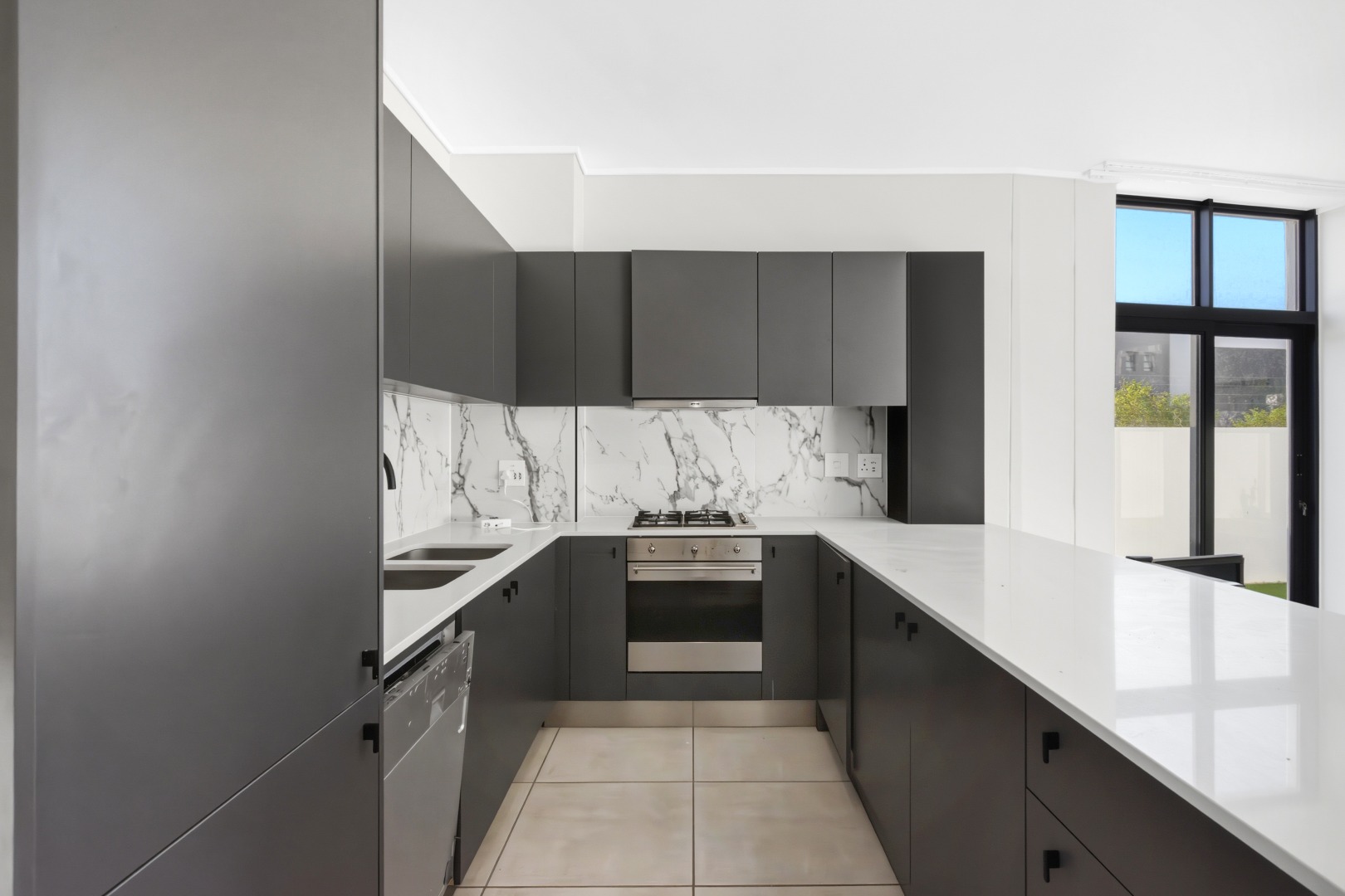 As you enter the apartment you will notice a large modern kitchen, open plan dining/living room leading to the patio and private garden. Kitchen appliances include a gas hob with extractor fan and electrical oven. The crisp white cupboards contribute to the kitchens bright and modern feel. The fridge, washing machine and dishwasher are integrated into the kitchen.