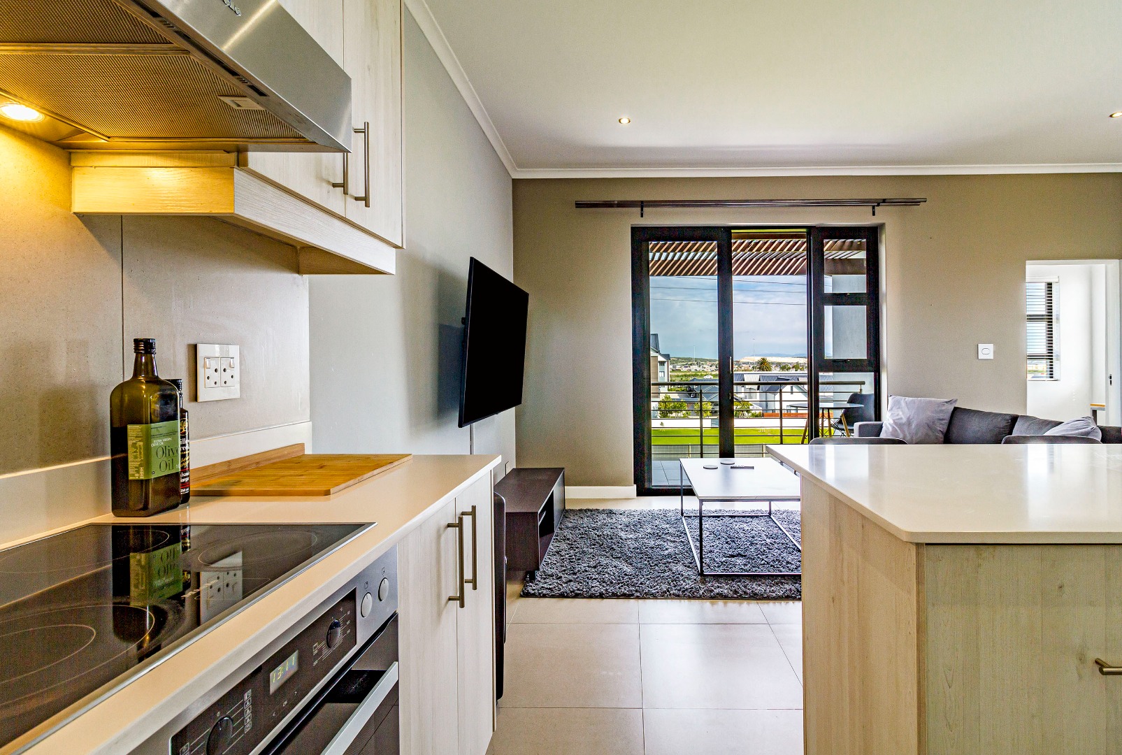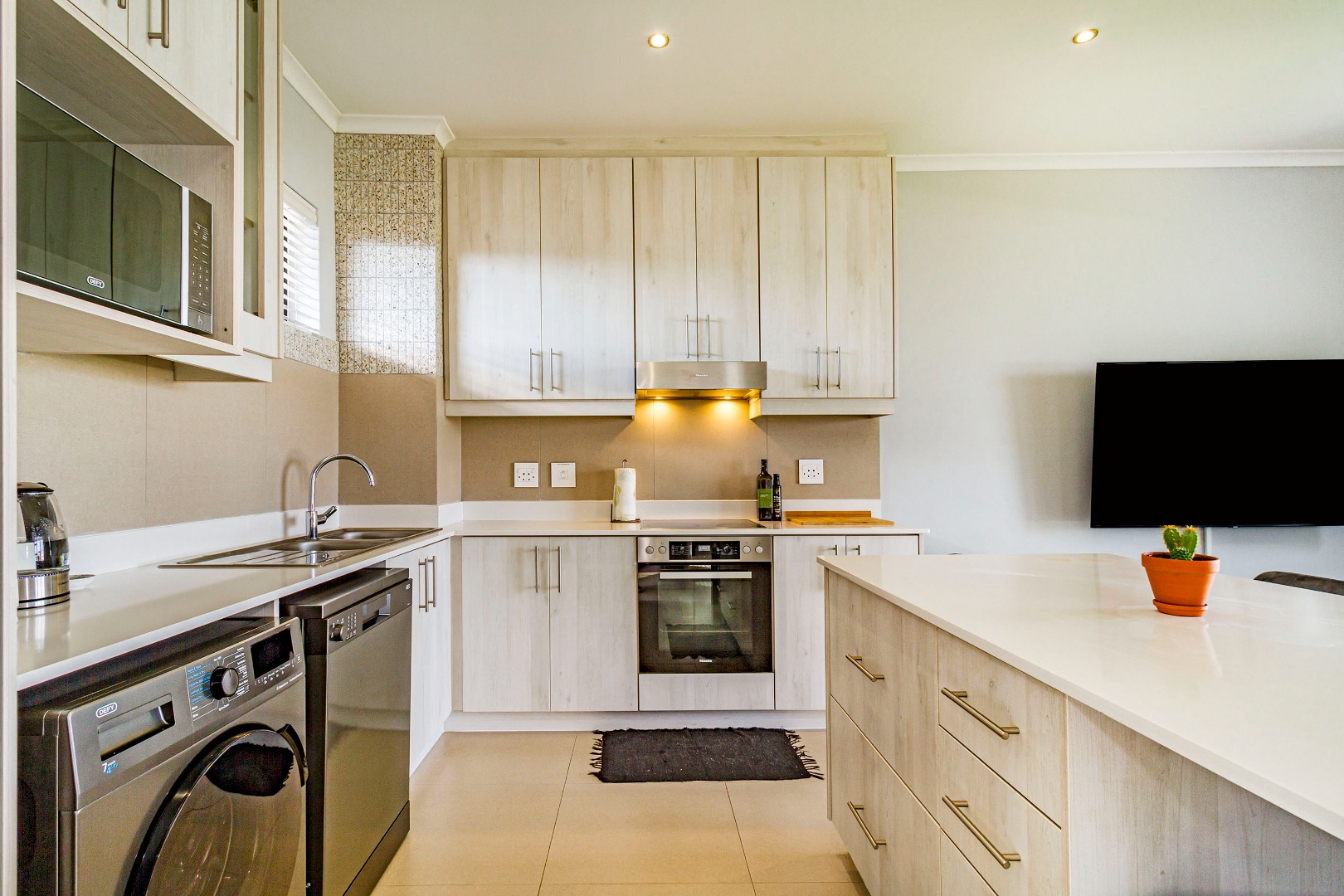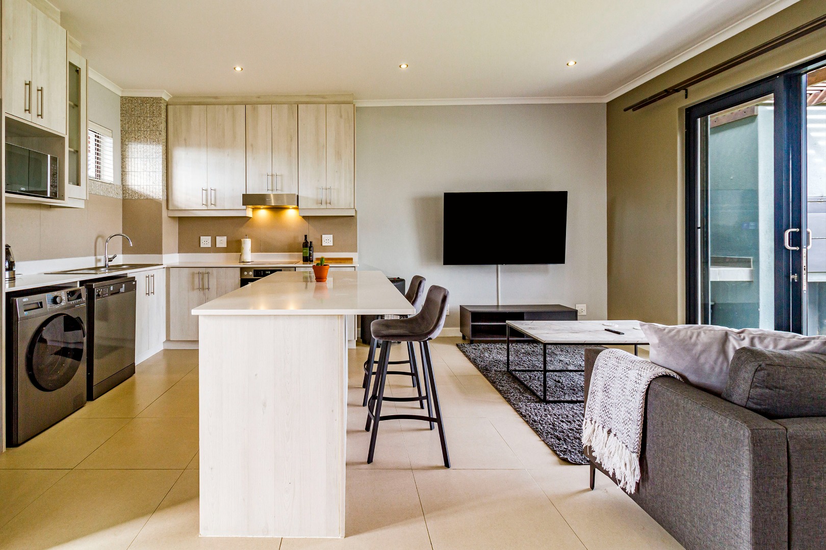 The kitchen is fitted with electric hob, oven and extractor fan, microwave oven, kettle, dishwasher and washing machine. The kitchen flows to the living space. The sliding door to the balcony with built-in-braai allows for a lot of natural light and fresh air.