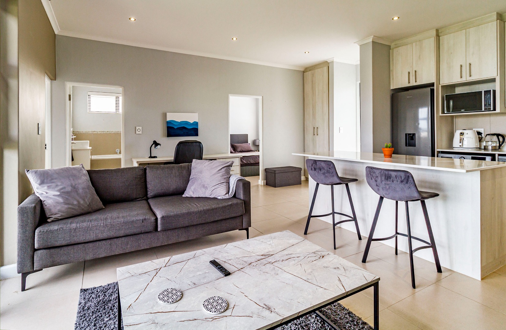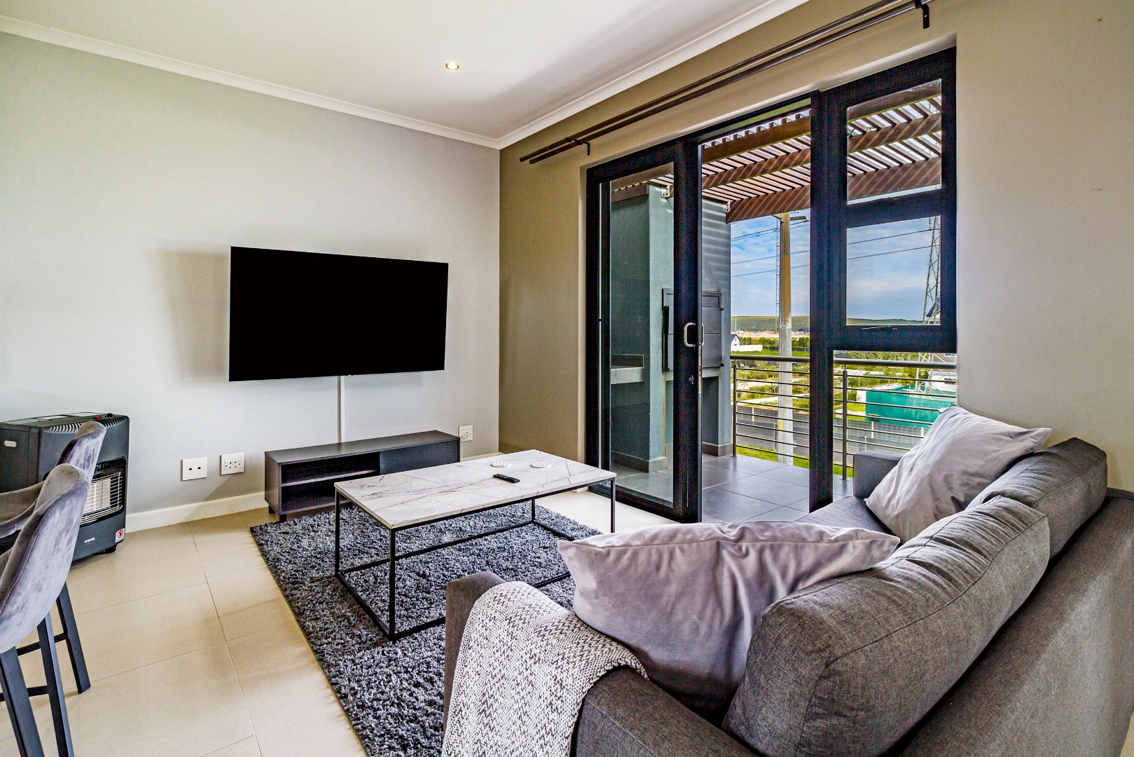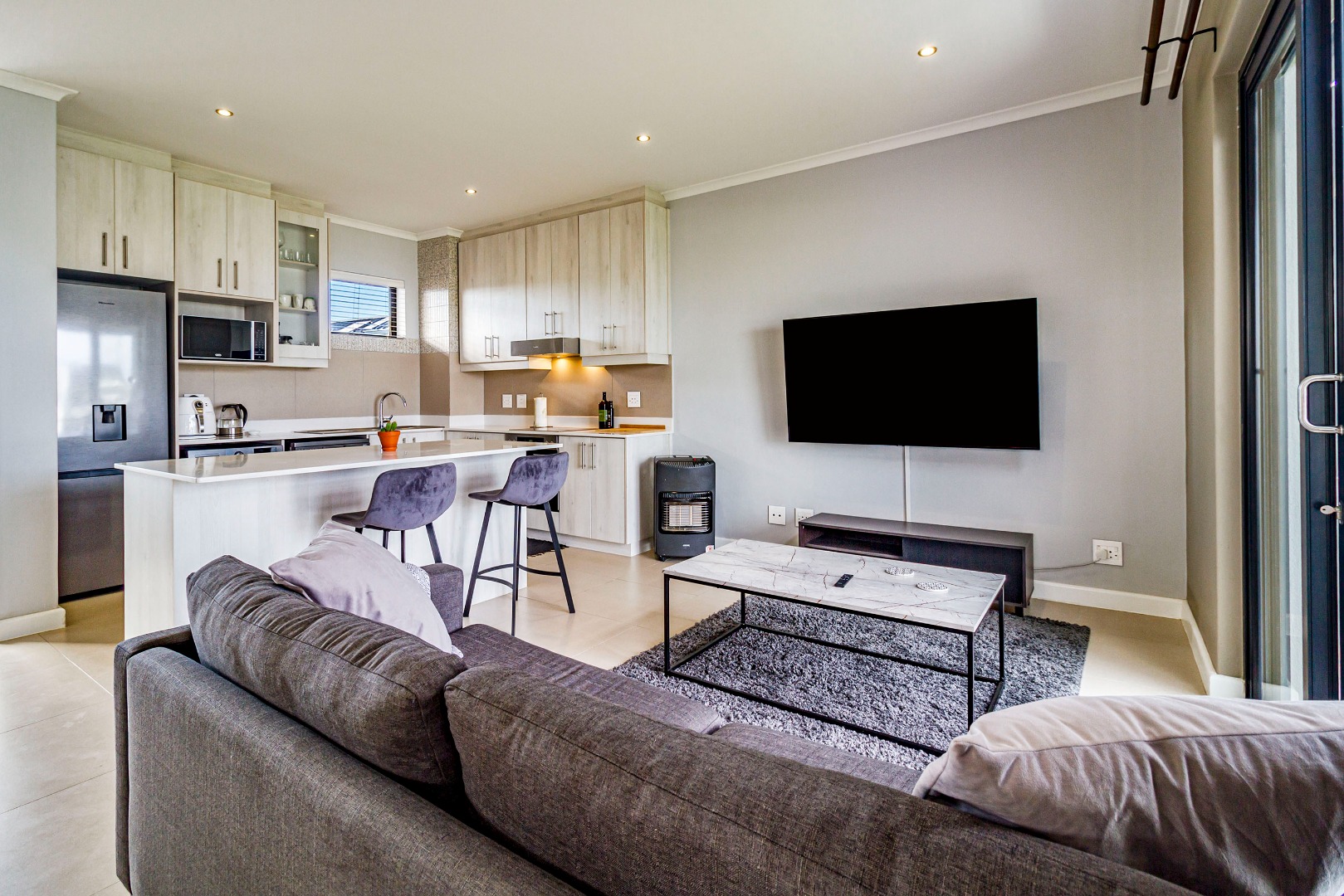 The kitchen is fitted with electric hob, oven and extractor fan, microwave oven, kettle, dishwasher and washing machine. The kitchen flows to the living space. The sliding door to the balcony with built-in-braai allows for a lot of natural light and fresh air.