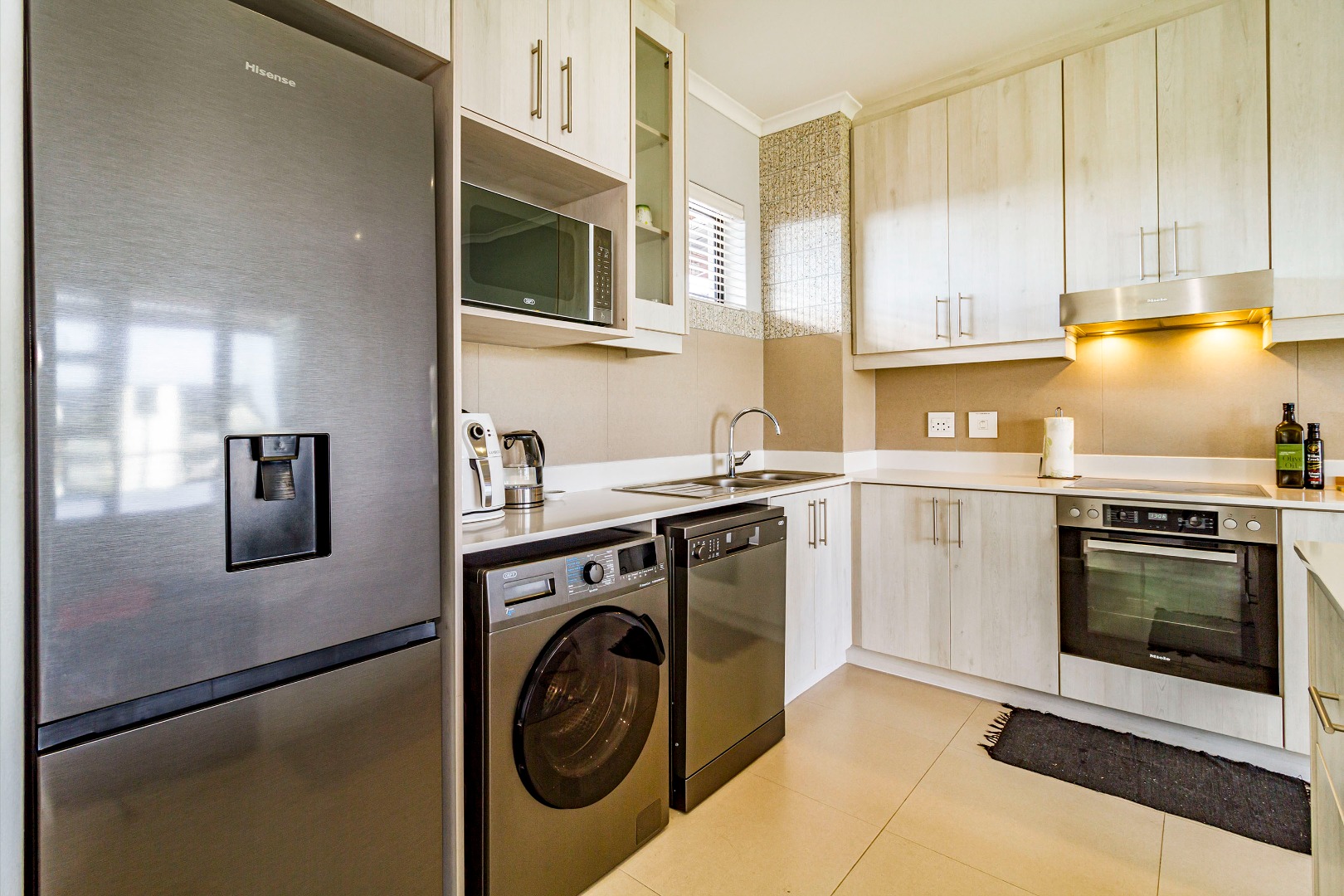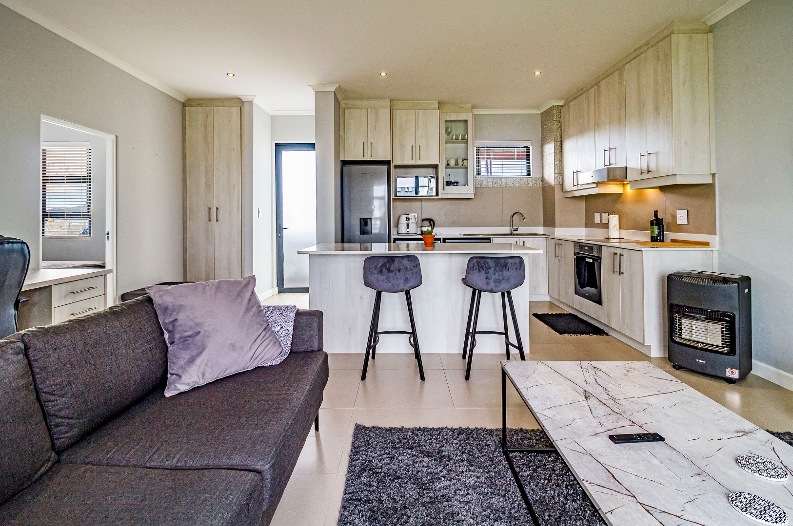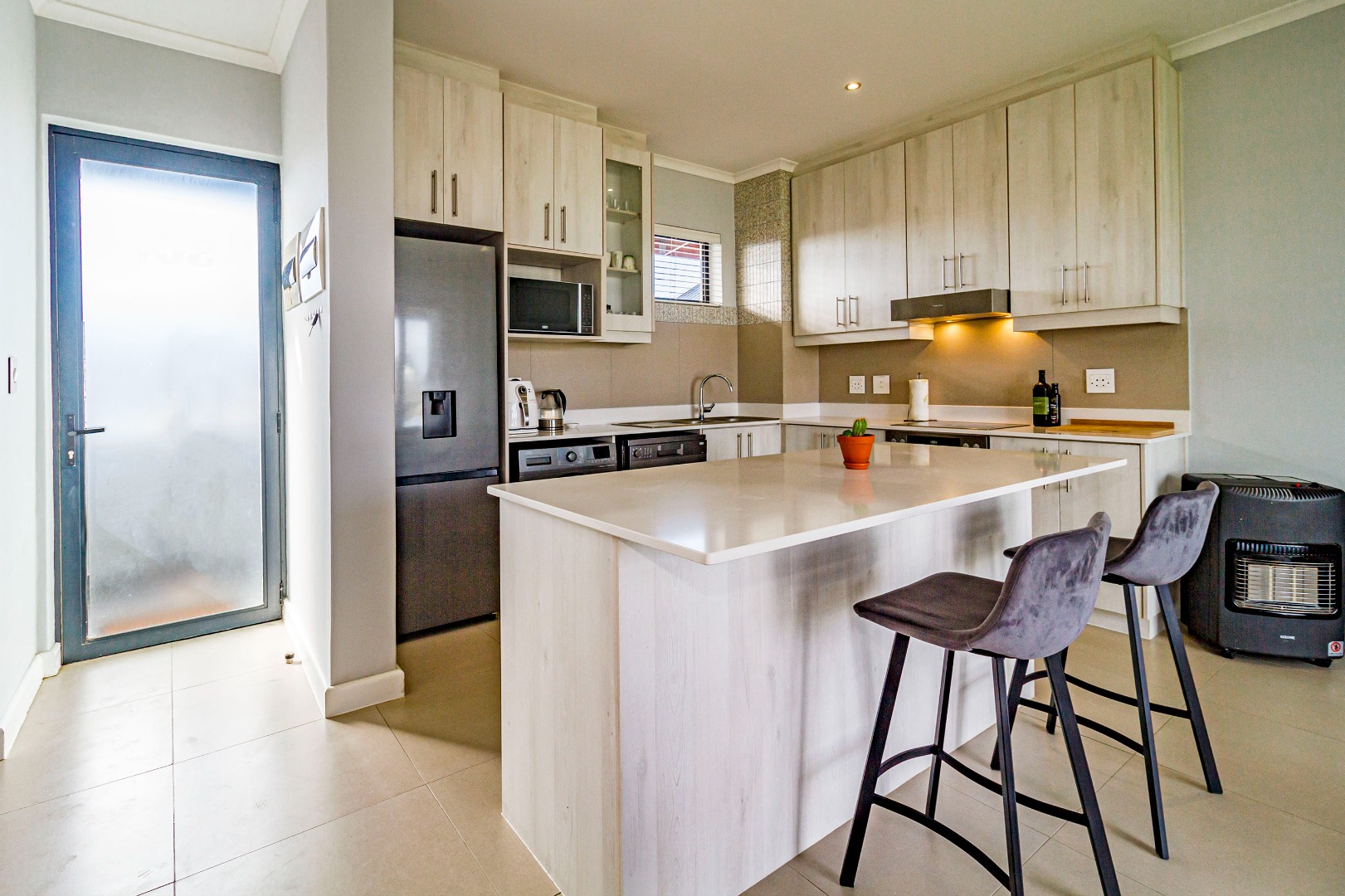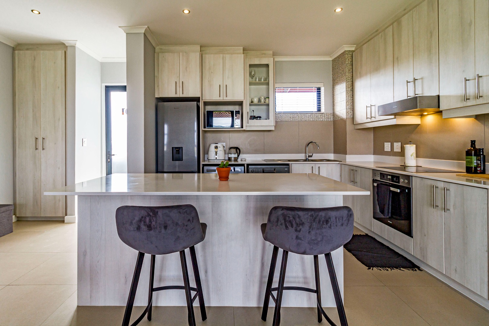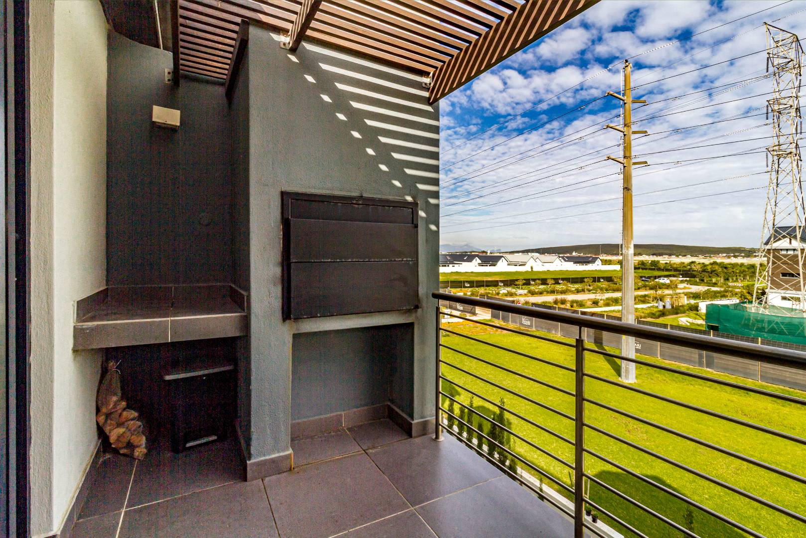 The kitchen is fitted with electric hob, oven and extractor fan, microwave oven, kettle, dishwasher and washing machine. The kitchen flows to the living space. The sliding door to the balcony with built-in-braai allows for a lot of natural light and fresh air.